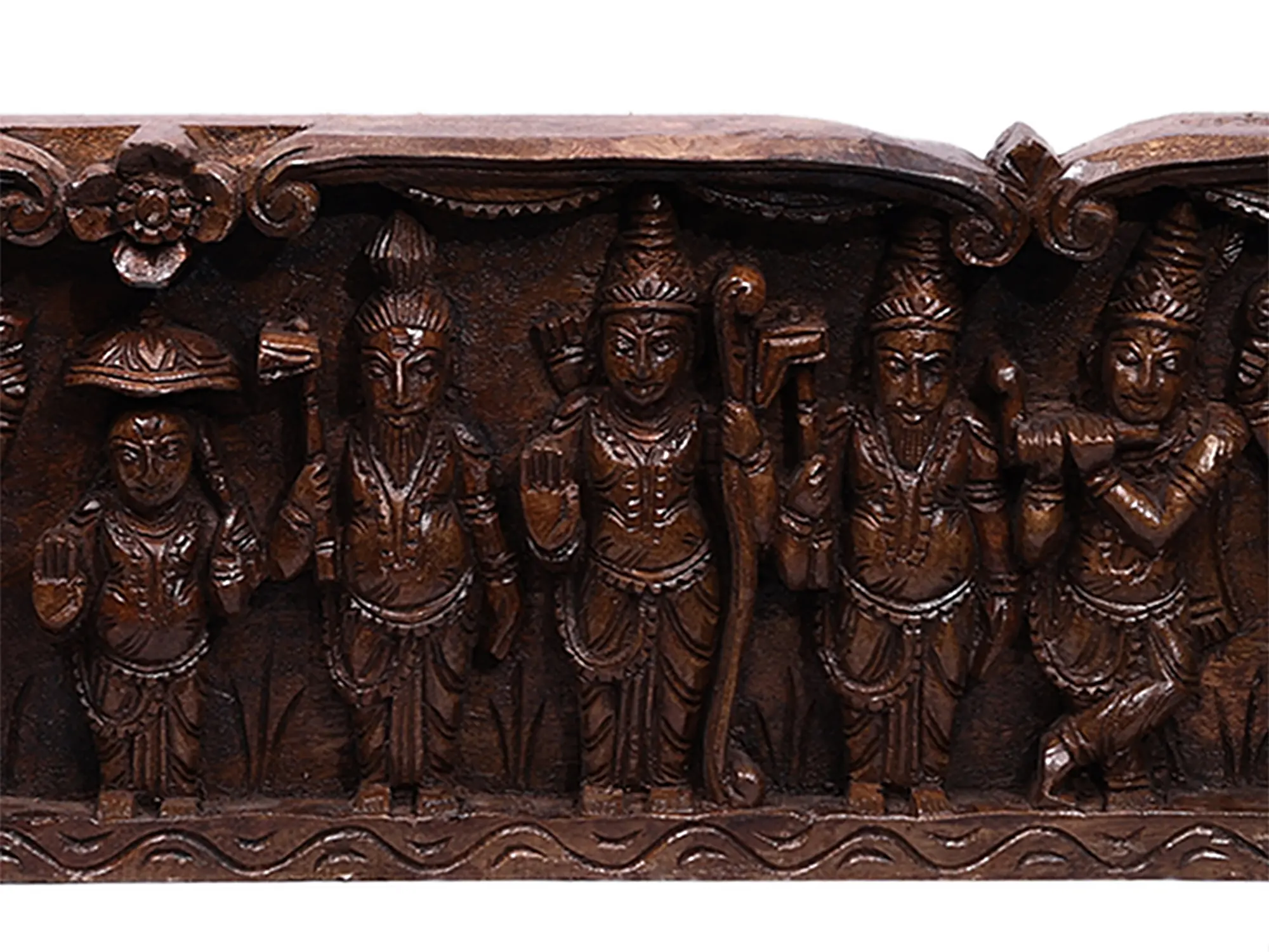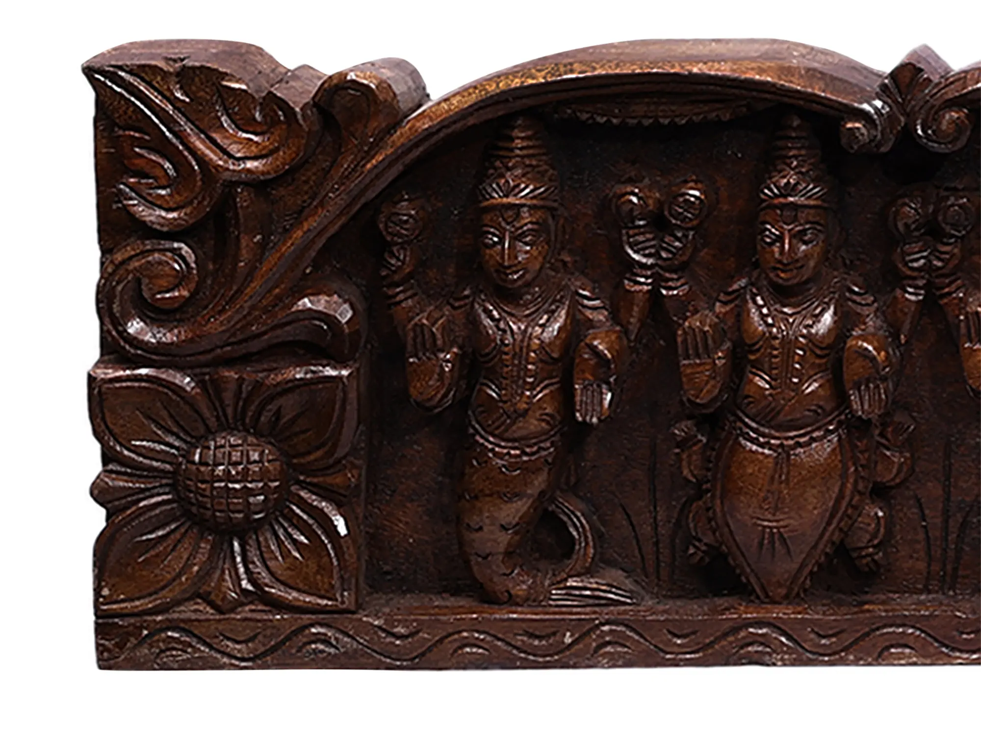 This substantial wall panel, crafted from rich, dark wood, exudes an aura of ancient wisdom and sacred artistry. The deep carvings allow light and shadow to play across the surface, bringing each divine form to life. The surrounding decorative elements, perhaps reminiscent of lotus blossoms and flowing water, further enhance the sacred tableau, adding a touch of natural beauty to the divine narrative. Hung in your living space, this Dashavatara panel will not only serve as a striking piece of decor but also as a constant source of spiritual inspiration, inviting blessings of protection, balance, and cosmic order into your home. It is a piece designed to be admired for generations, a tangible connection to profound mythology and enduring spiritual traditions.