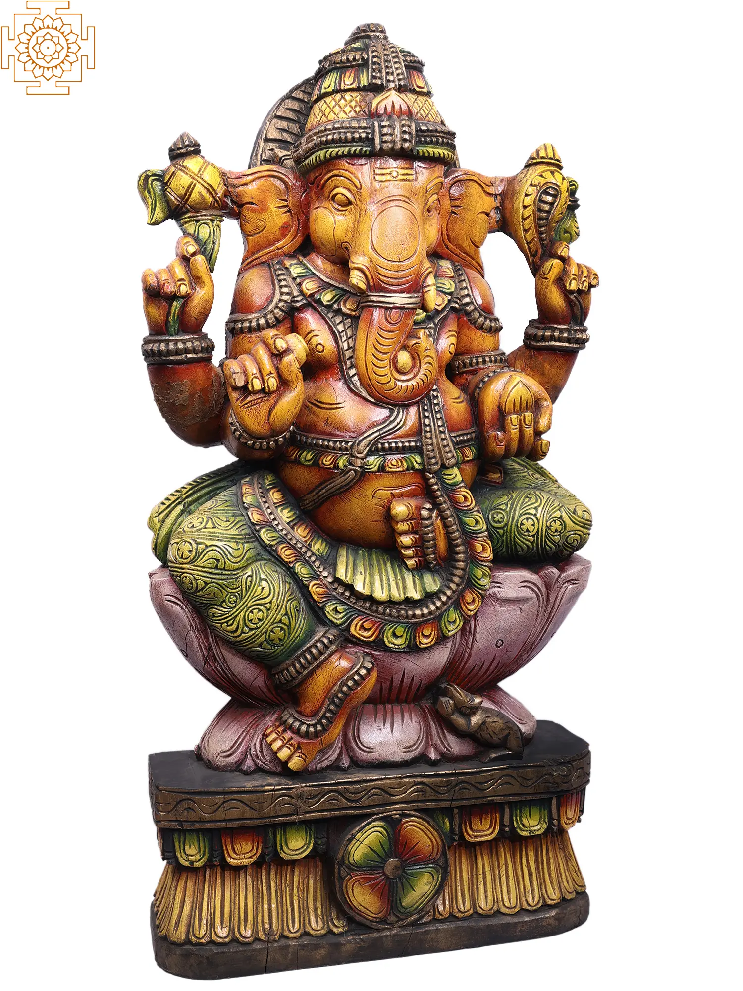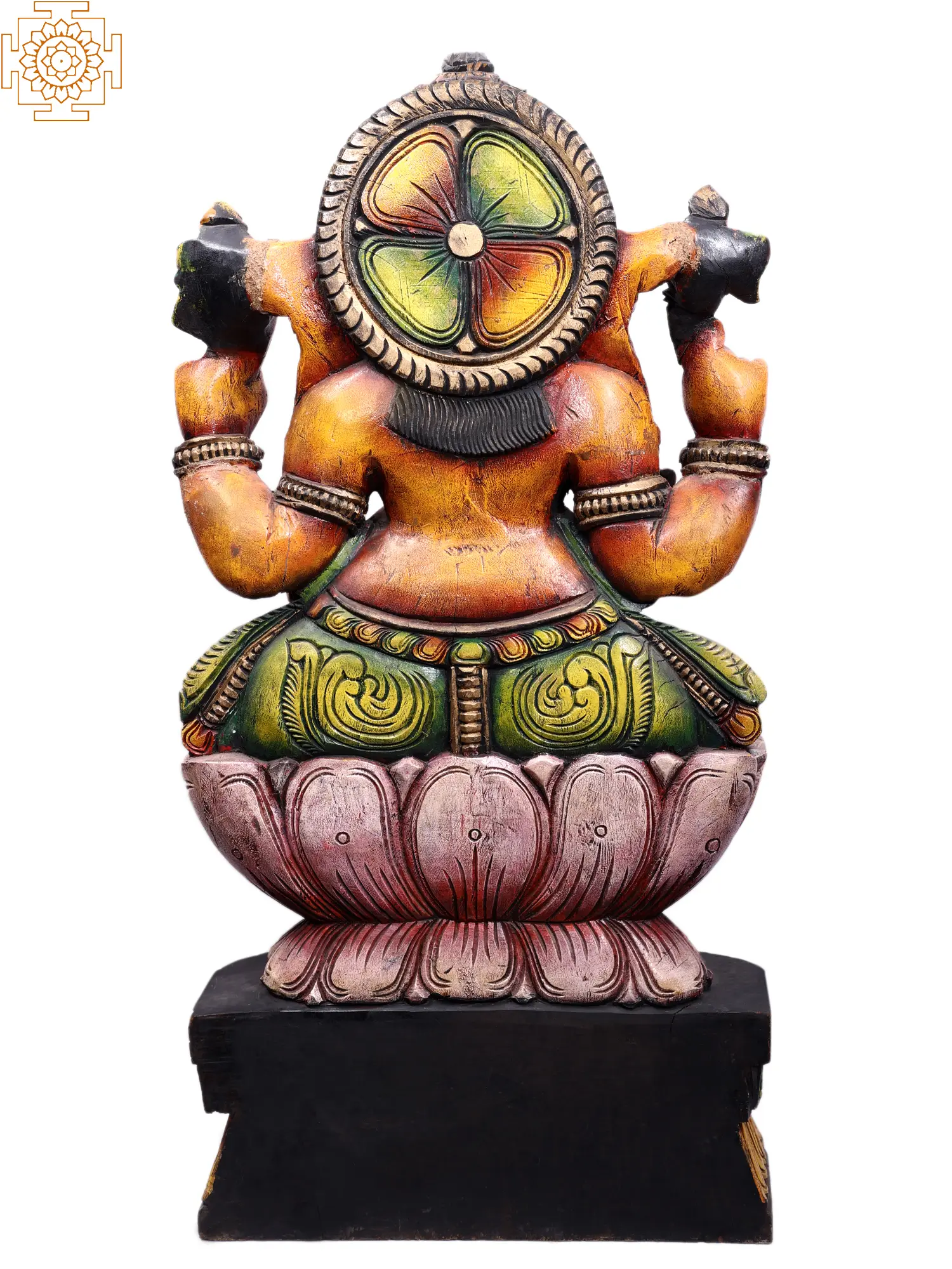 36" Large Wooden Four Hands Lord Ganesha Idol Seated on Lotus