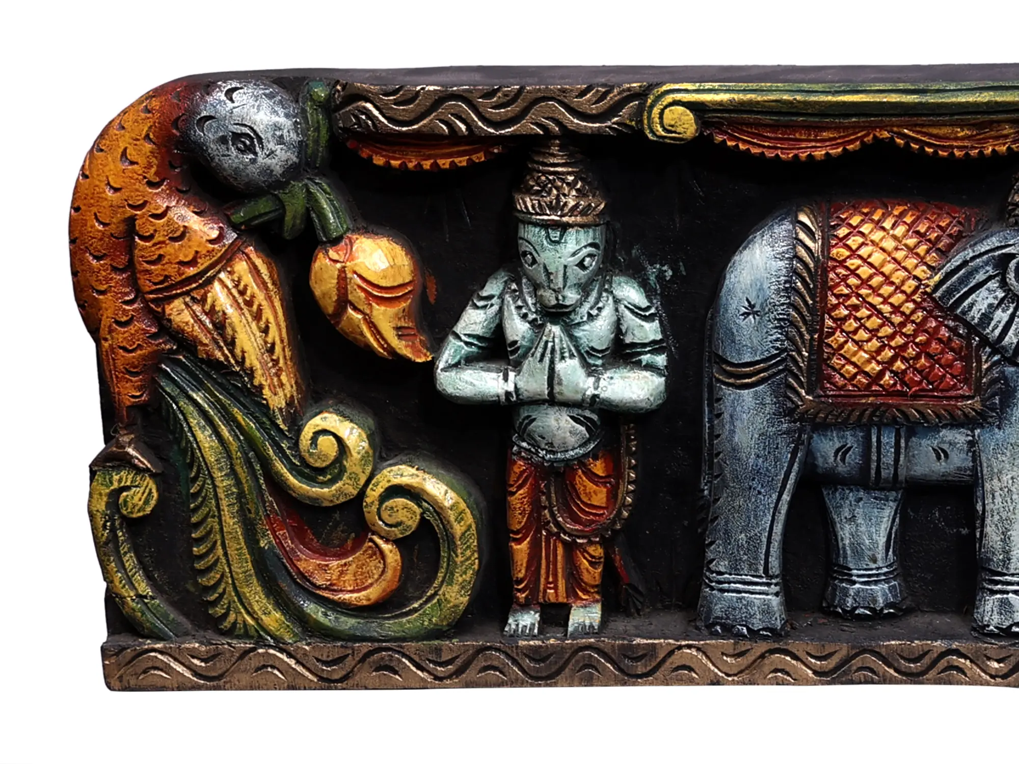 The Large Wooden Gaja Ganesha Wall Panel exudes grandeur and spiritual significance, serving as a magnificent centerpiece in any space. Crafted from wood with meticulous detail, this wall panel features an intricately carved depiction of Ganesha, the revered Hindu deity, in his Gaja (elephant) form.