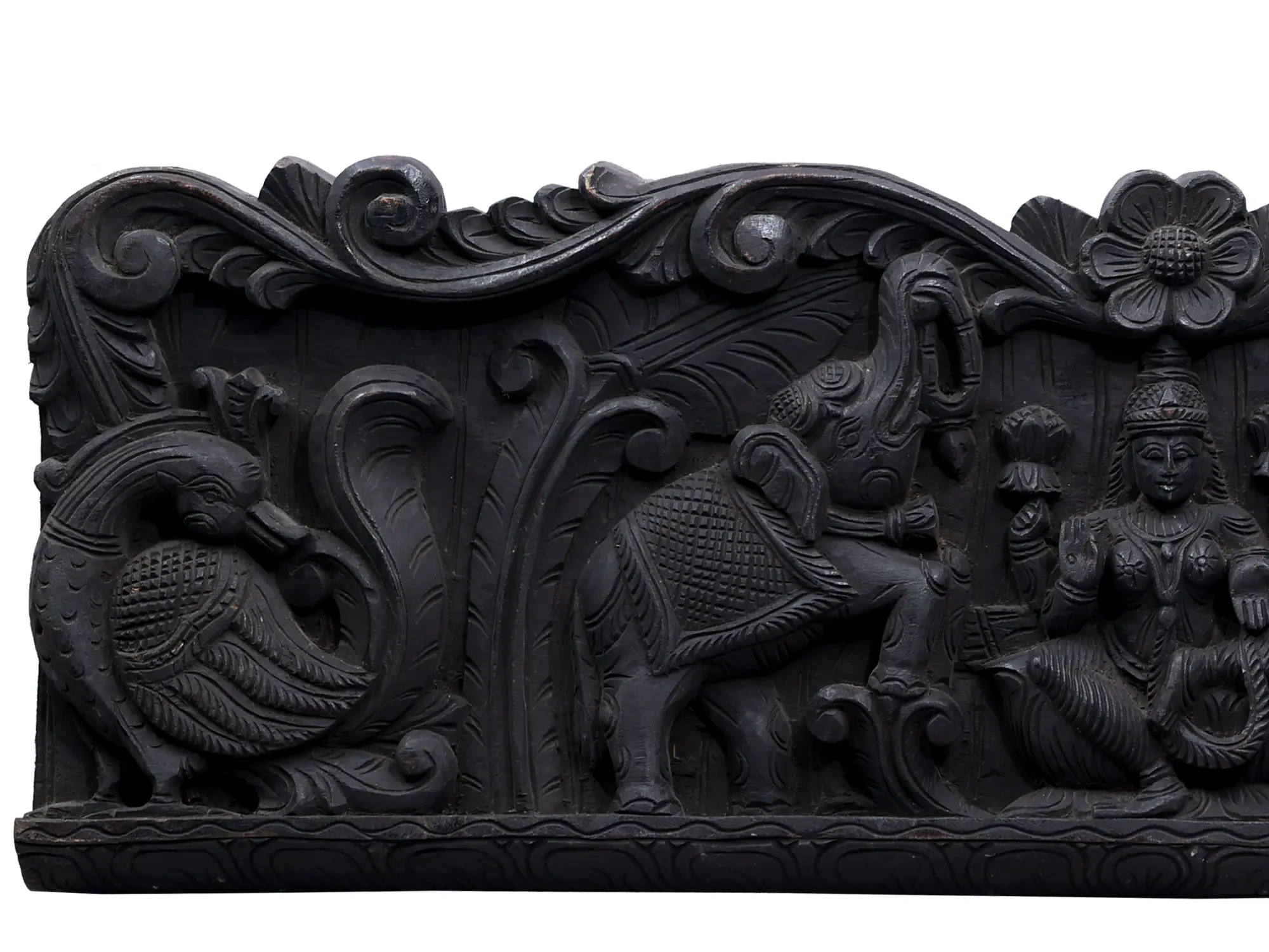 Each detail of this panel, from the delicate folds of Lakshmi's attire to the textured patterns on the elephants' skin and the elegant feathers of the peacocks, has been meticulously carved from solid wood. This piece is not merely a decorative item; it is a work of art that carries centuries of tradition and devotion. The dark, rich finish of the wood highlights the depth and detail of the carving, making it a striking focal point in any room. Displaying this Gaja Lakshmi panel is believed to invite blessings of wealth, good fortune, and spiritual well-being into your home, echoing the ancient belief that art and divinity are intrinsically intertwined.