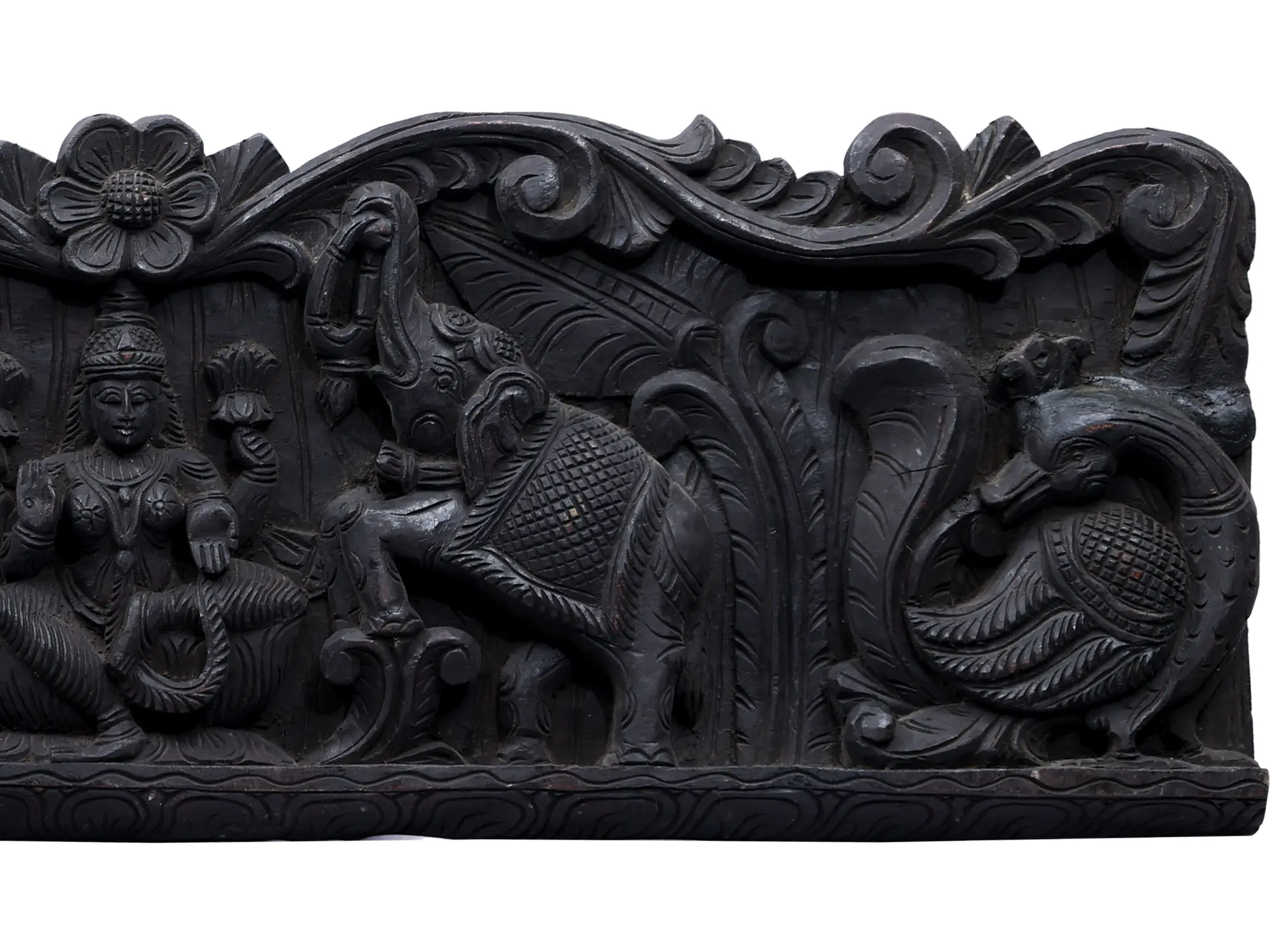 The composition is beautifully framed by two intricately carved peacocks, positioned at either end of the panel. The peacock, with its iridescent plumage and dignified bearing, is the vahana (vehicle) of Goddess Saraswati, the deity of knowledge, music, and art. It is also a symbol of beauty, royalty, and immortality. In this panel, the peacocks appear to be offering their elegant presence as a natural border, a protective embrace around the divine central figure. Their inclusion adds a layer of artistic sophistication and reinforces the theme of divine grace and natural beauty.