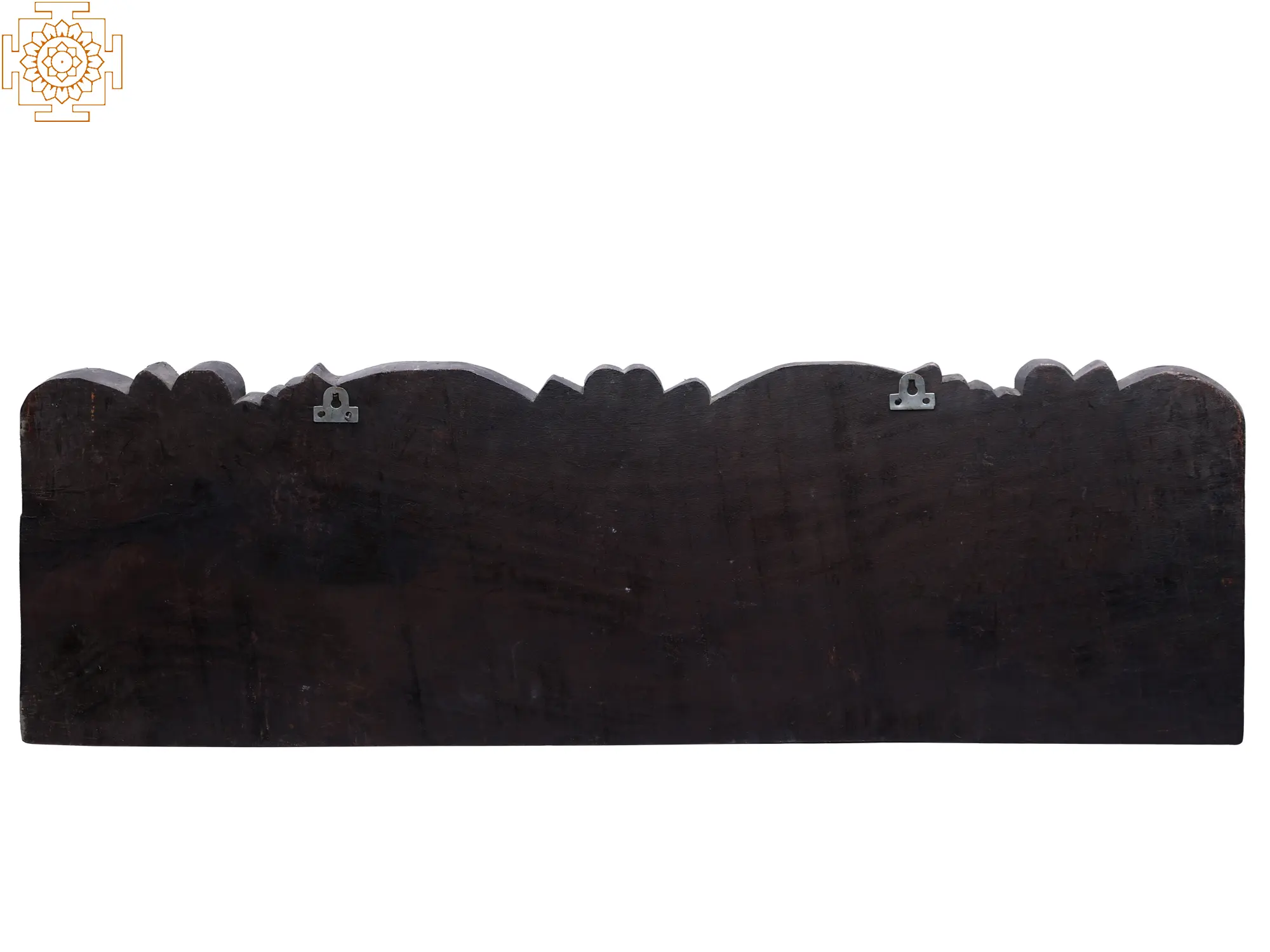 Immerse your sacred space or living area in the divine presence of Gaja Lakshmi with this magnificent, hand-carved wooden wall panel. This exceptional piece, measuring 36 inches in length, is a testament to traditional craftsmanship and spiritual symbolism. At its heart, the benevolent goddess Lakshmi, the embodiment of wealth, prosperity, and auspiciousness, is depicted seated serenely on a blooming lotus, her symbol of purity and spiritual enlightenment. Her gentle gaze and graceful posture emanate an aura of peace and abundance.