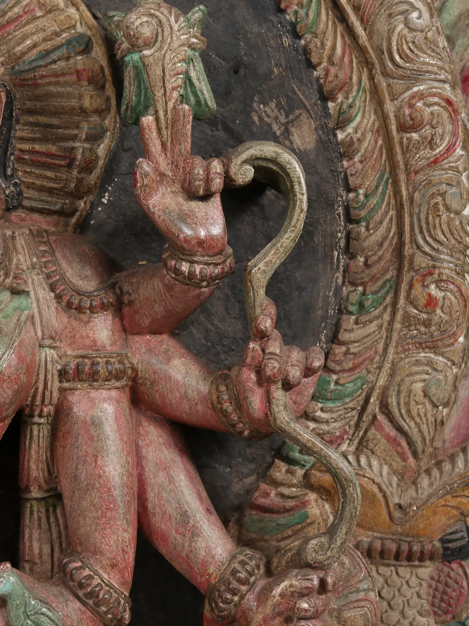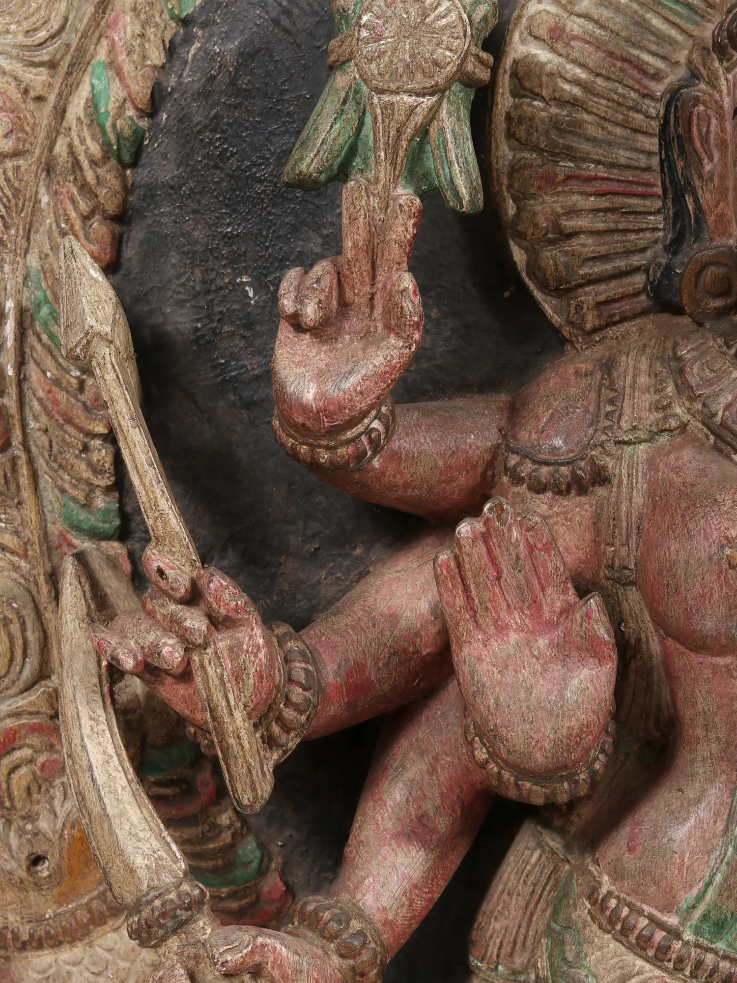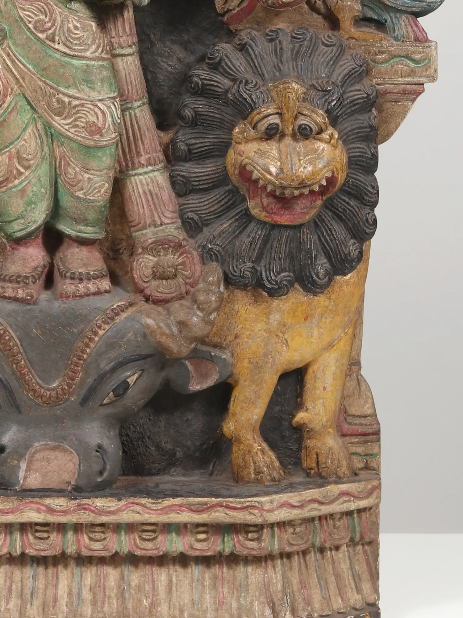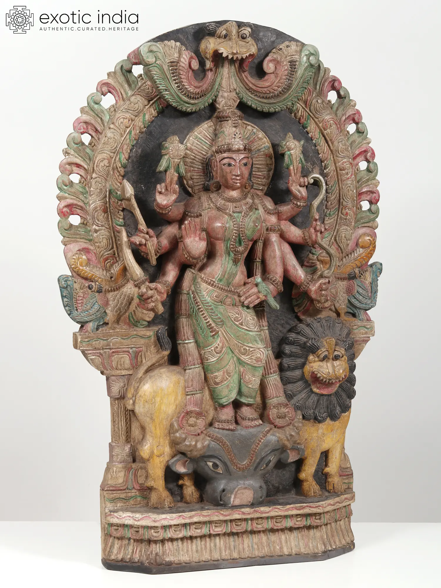 Inspired by the heavenly sculptures of the Durga on South Indian temple walls and sanctums, this wooden statue recreates the aura of the celestial warrior goddess in a beautiful traditional idiom. On the severed head of Mahishasura, the buffalo demon stands Mahishasuramardini, the annihilator of the Asura, accompanied by her mount, Simha (lion). She is wrapped in a green saree and ornamented exquisitely, with jewelry, and her eight arms extend around her forming an awe-inspiring halo. Devi’s primary hands are in Abhaya mudra, the gesture of fearlessness, and Katihasta (placed on her Kati or waist) mudra, on which a parrot is perched, which is an attribute of the goddess’s form as Meenakshi.