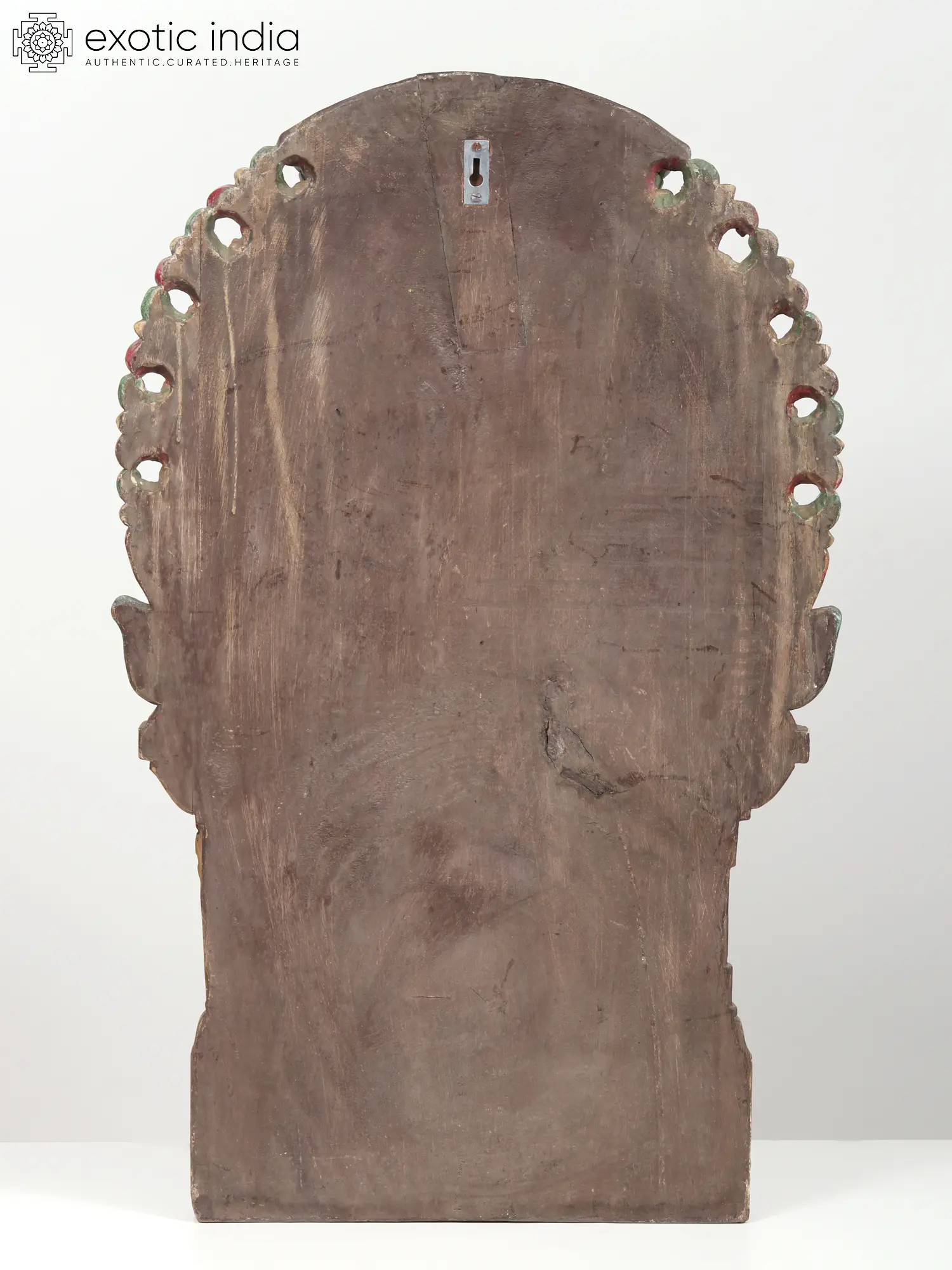 The aureole that surrounds the statue of goddess Durga is a dramatic work of art, marked by Makaras on the base from whose mouths emerges the aura. On the top, the awe-inspiring Kirtimukha, or face of glory appears, with his sharp teeth giving way to the floral tassels that adorn the image. The background behind the goddess is pitch black, to highlight the glory of Durga, who emerges from the darkness as the Sun.