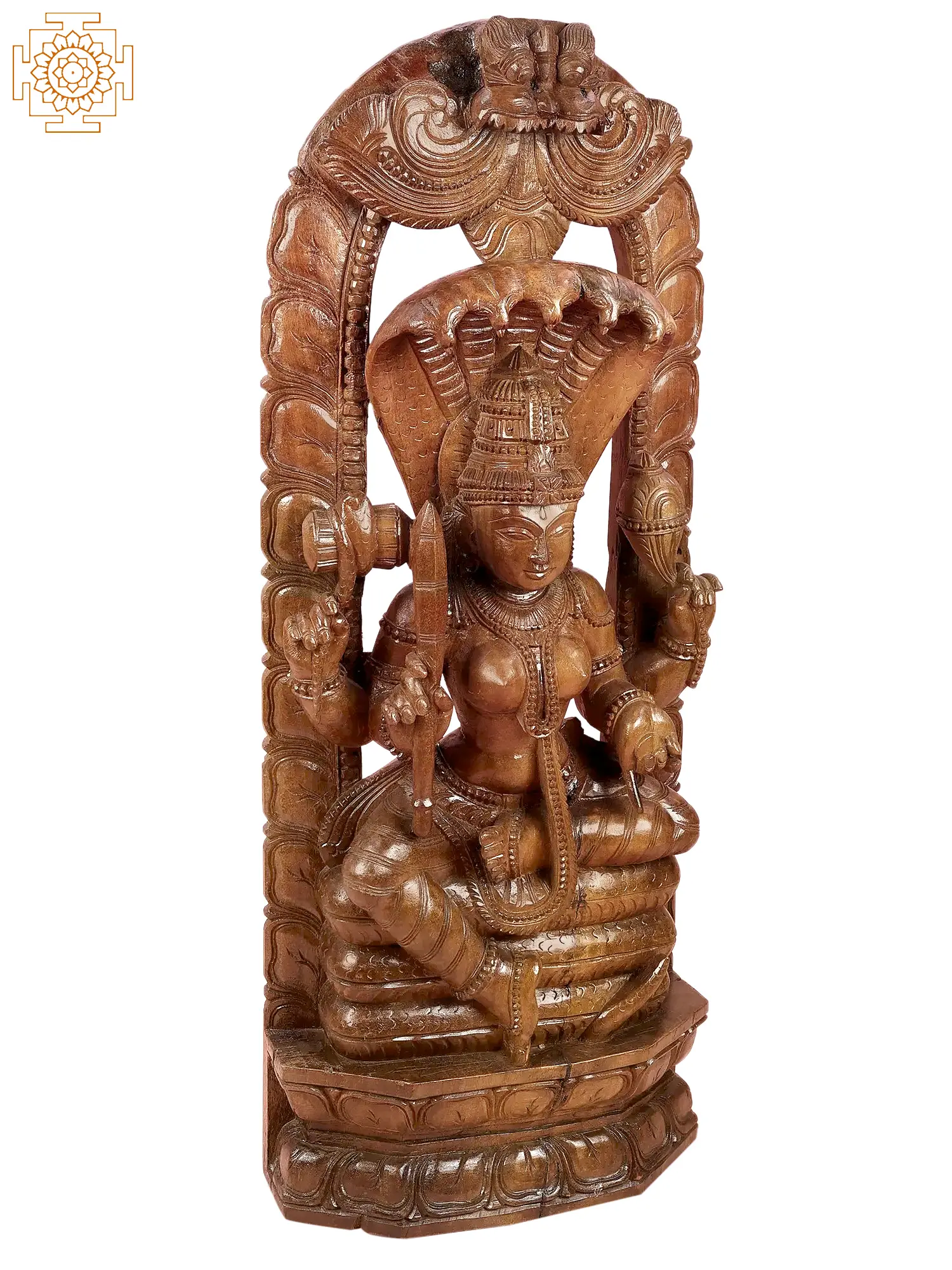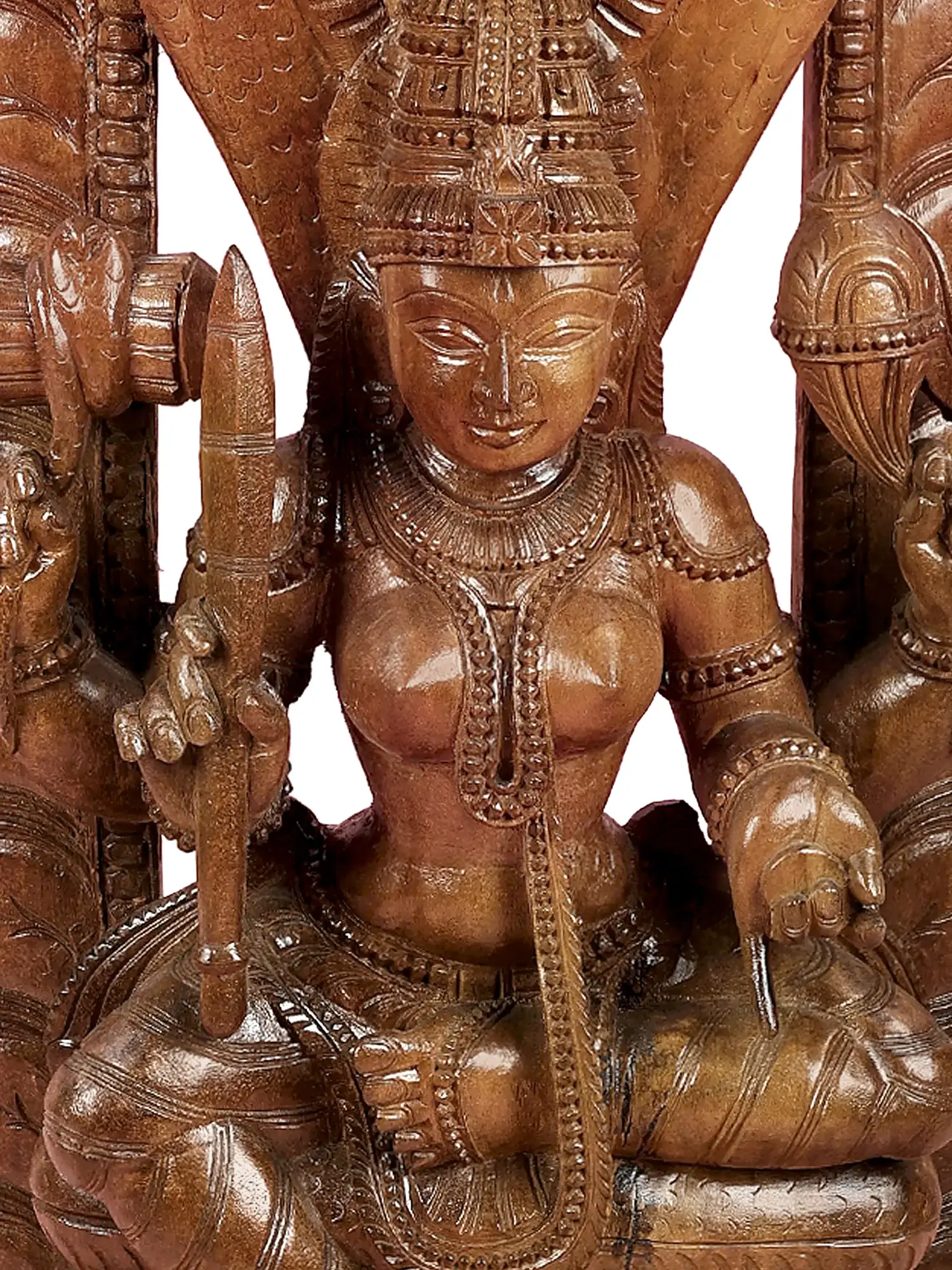 Goddess Mariamman is a popular god in South India, especially in Karnataka, Maharashtra, and Andhra Pradesh. This deity's origins can be traced back to the goddess Renuka, the mother of Lord Vishnu's child Parashurama. This Laquered finish Wooden statue is a testament to the loving and graceful image of Goddess Mariamman. Here the Goddess is seen sitting in the Lalitasana pose with a Damru and a Pasha or noose in her upper hands.