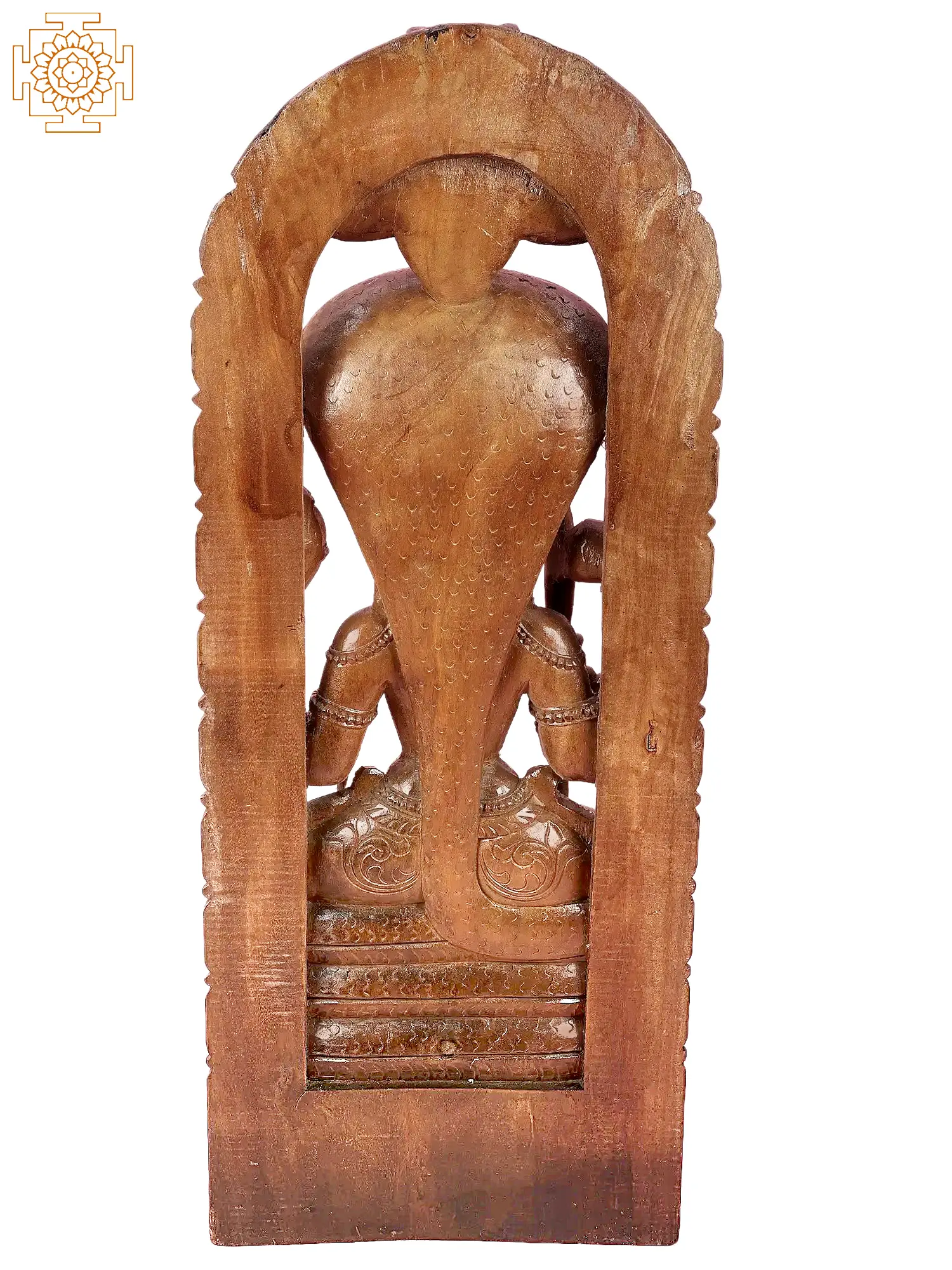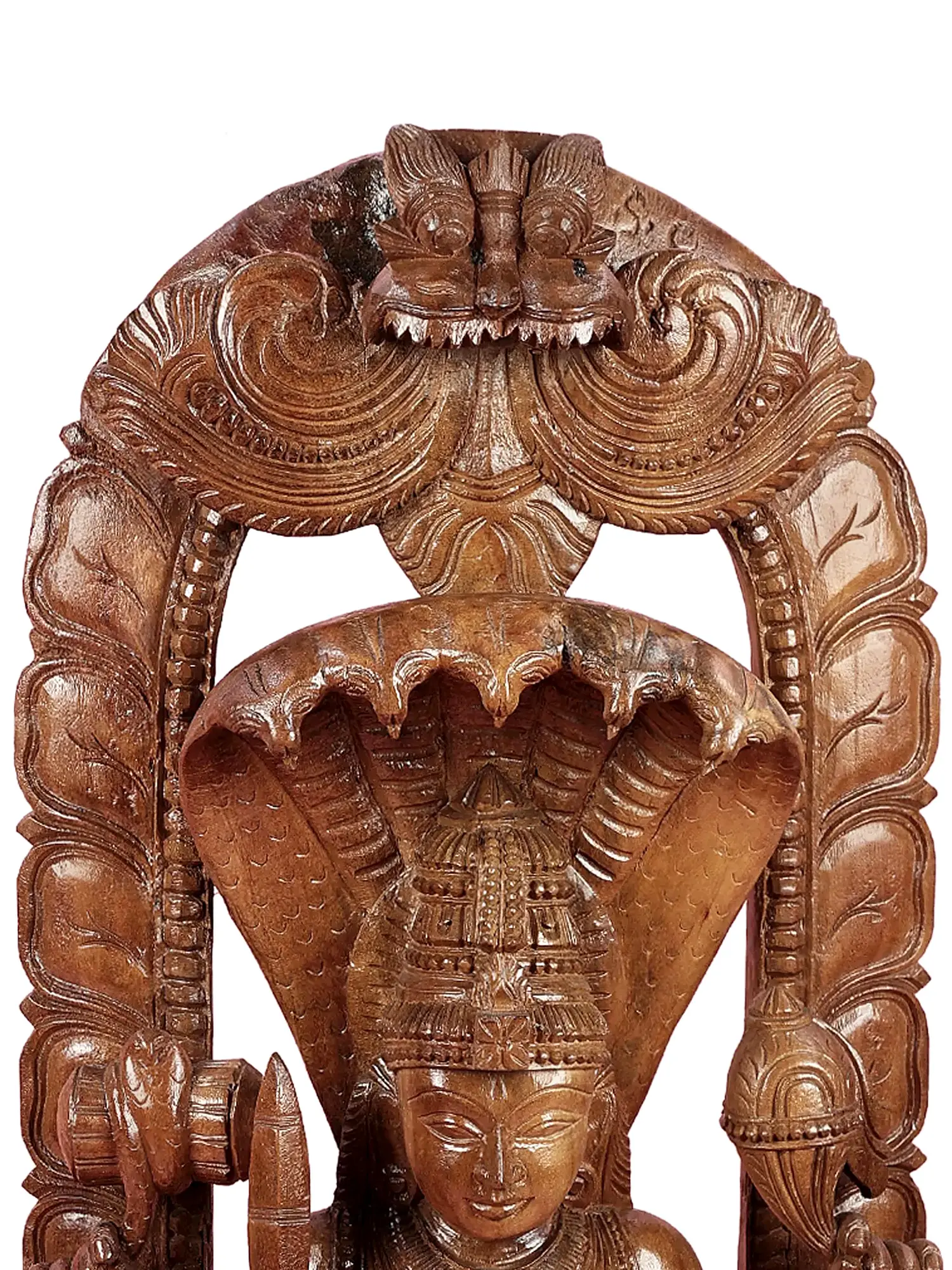 The lower two hands held a Chandrahasa sword and a vermillion container each. Intricately carved, Mariamman exudes grace, with eyes that radiate compassion. Adorned in rich wooden hues, the goddess stands as a symbol of fertility and protection. Her presence, captured in every detail, emanates strength and maternal warmth. The craftsmanship reverently honors tradition, as the goddess emerges, a guardian and source of solace.