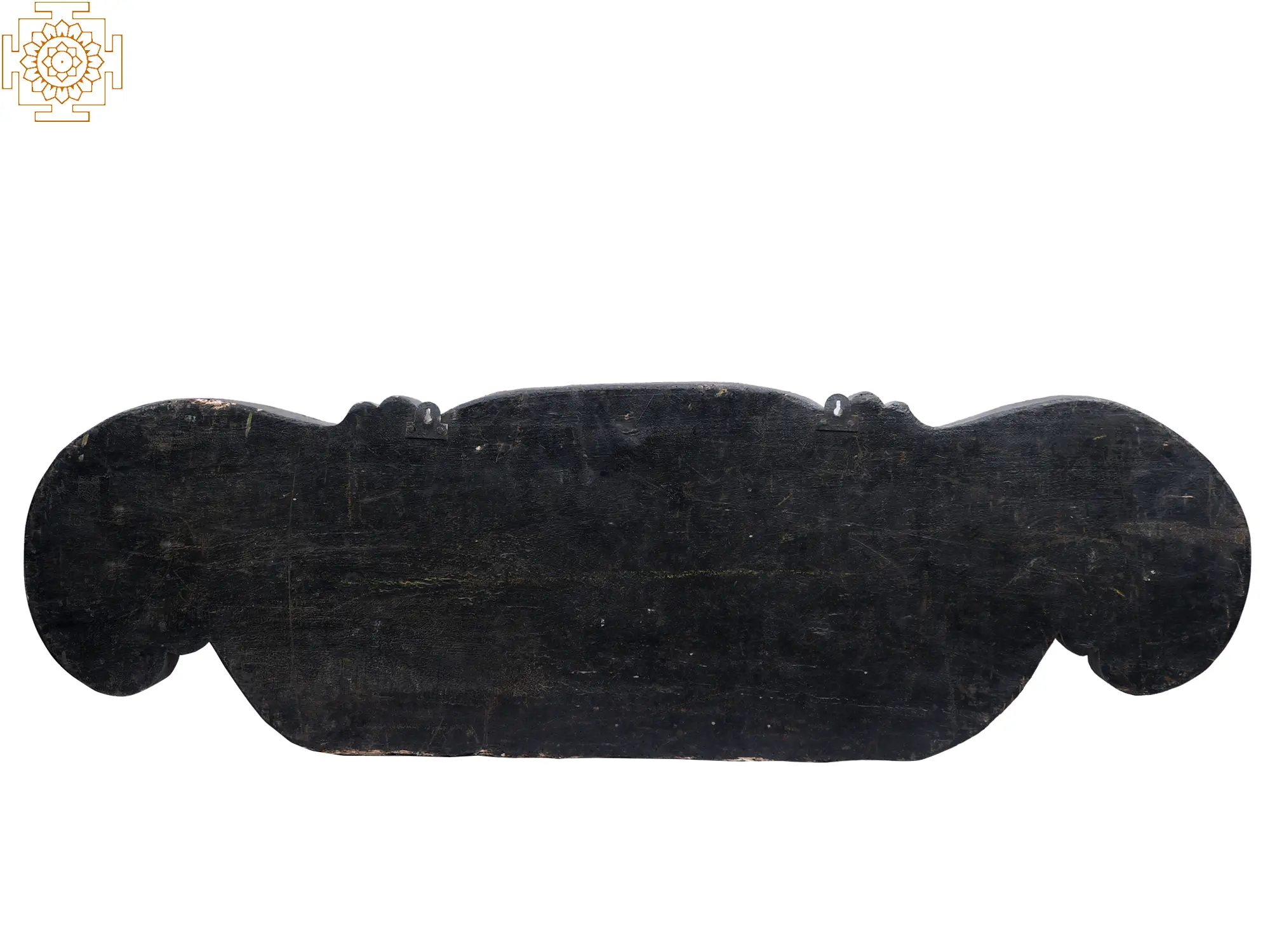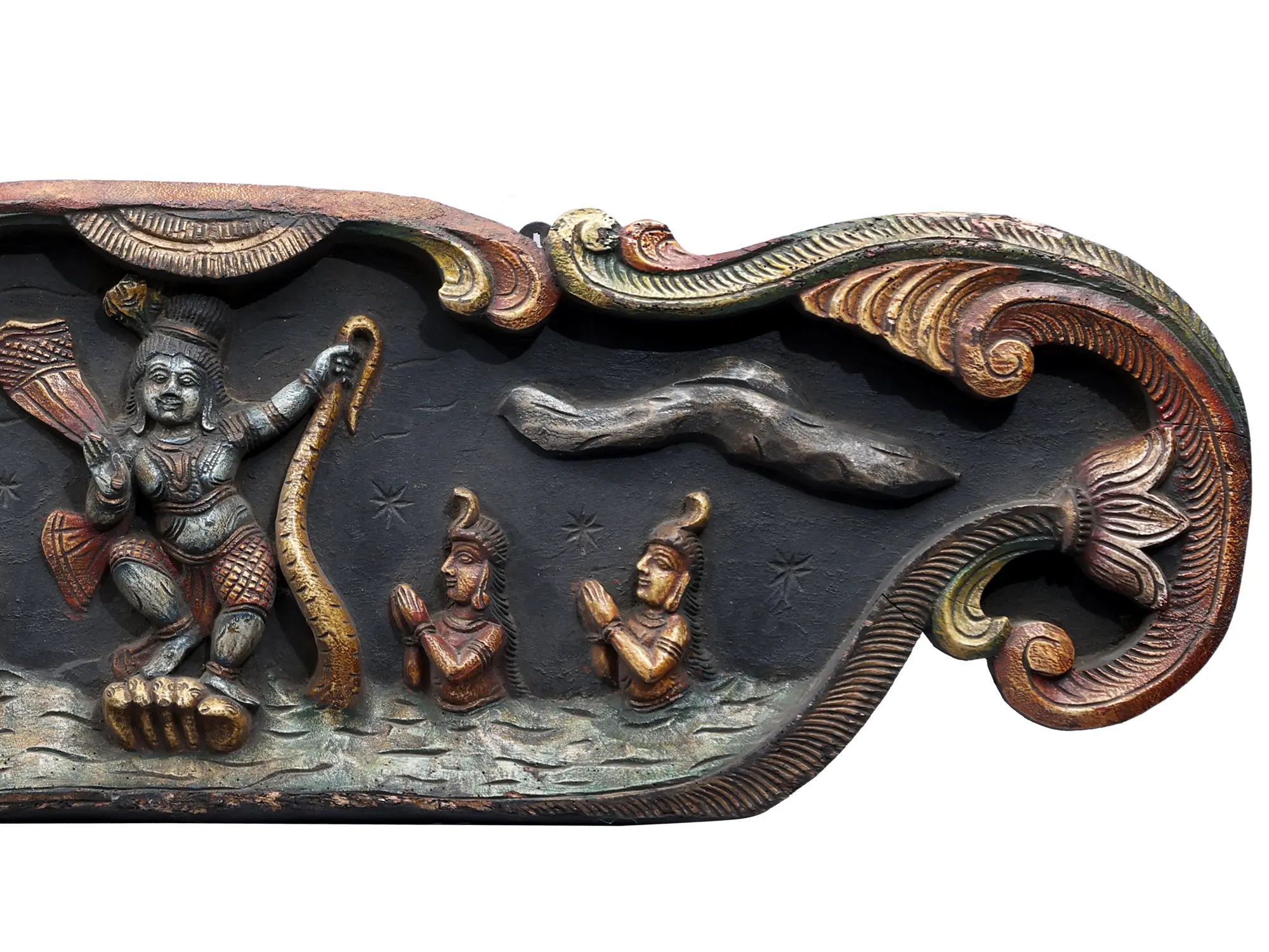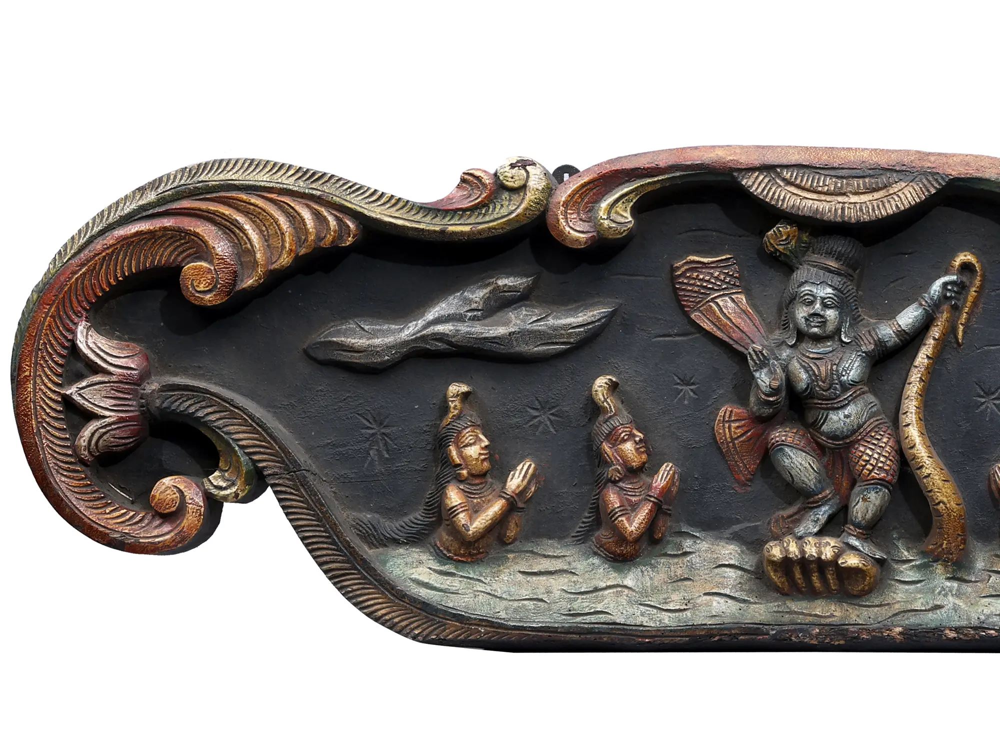 A mesmerizing episode of Krishna-lila is presented in this traditional wooden wall panel, depicting the scene of “Kaliya-Maan-Mardan” or defeating the pride of the serpent Kaliya. Emerging from the waves of water shown with curving lines and carving, Kaliya becomes the platform for dancing Krishna, who holds the tail of the serpent while striking a lovely pose.