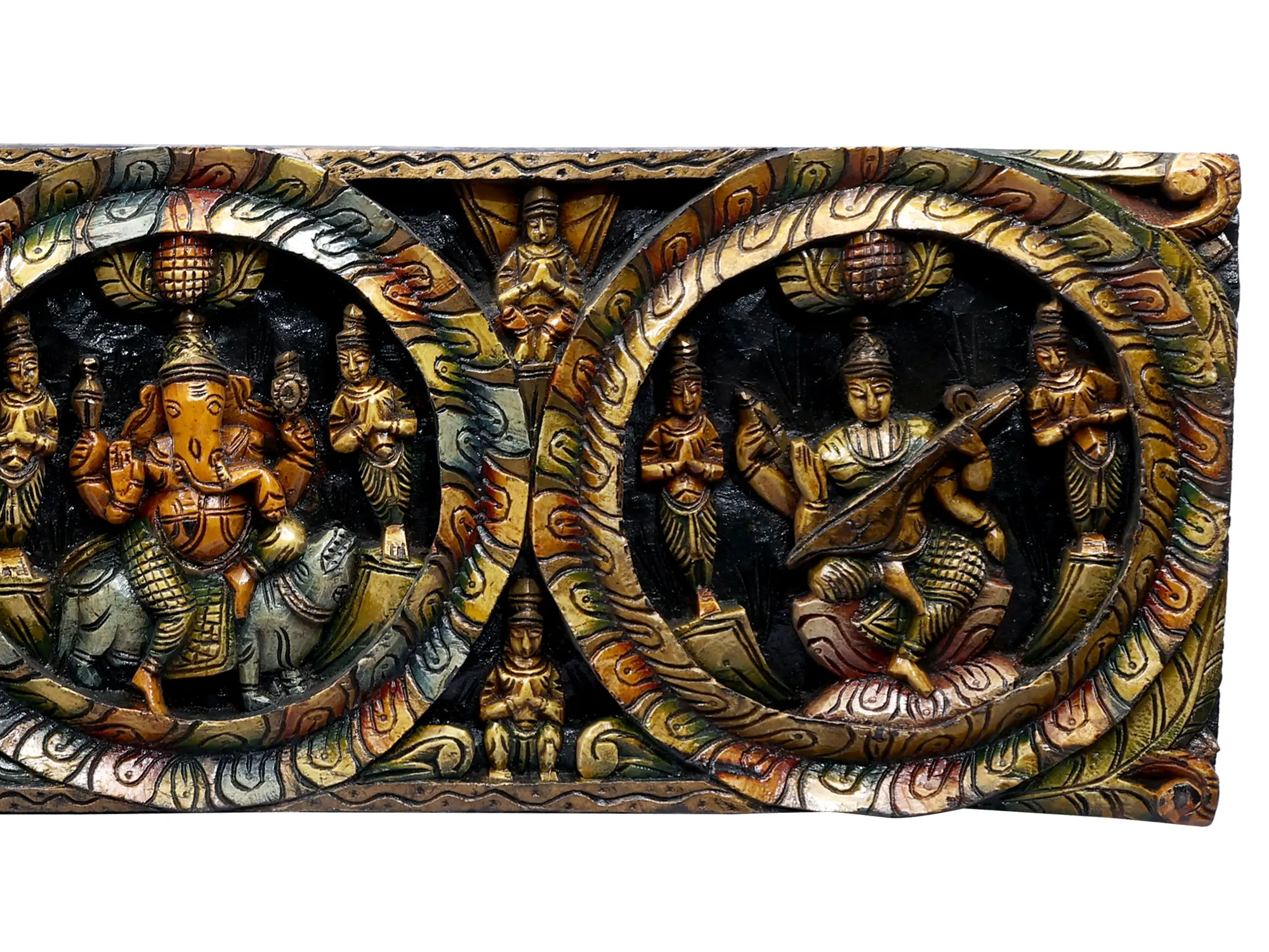 This magnificent wooden panel is a testament to the rich tapestry of Indian mythology and artistry, encapsulating the essence of three revered deities. Crafted with meticulous attention to detail, the panel depicts Goddess Lakshmi, the embodiment of wealth and prosperity; Lord Ganesha, the remover of obstacles and god of beginnings; and Goddess Saraswati, the divine patroness of knowledge, music, and the arts. Each figure is intricately carved within its own distinct circular frame, creating a visual narrative that flows harmoniously across the expansive 36-inch length. The warm tones of the wood, enhanced by subtle hand-painted accents, evoke a sense of timeless elegance and spiritual profundity. ––––––––––