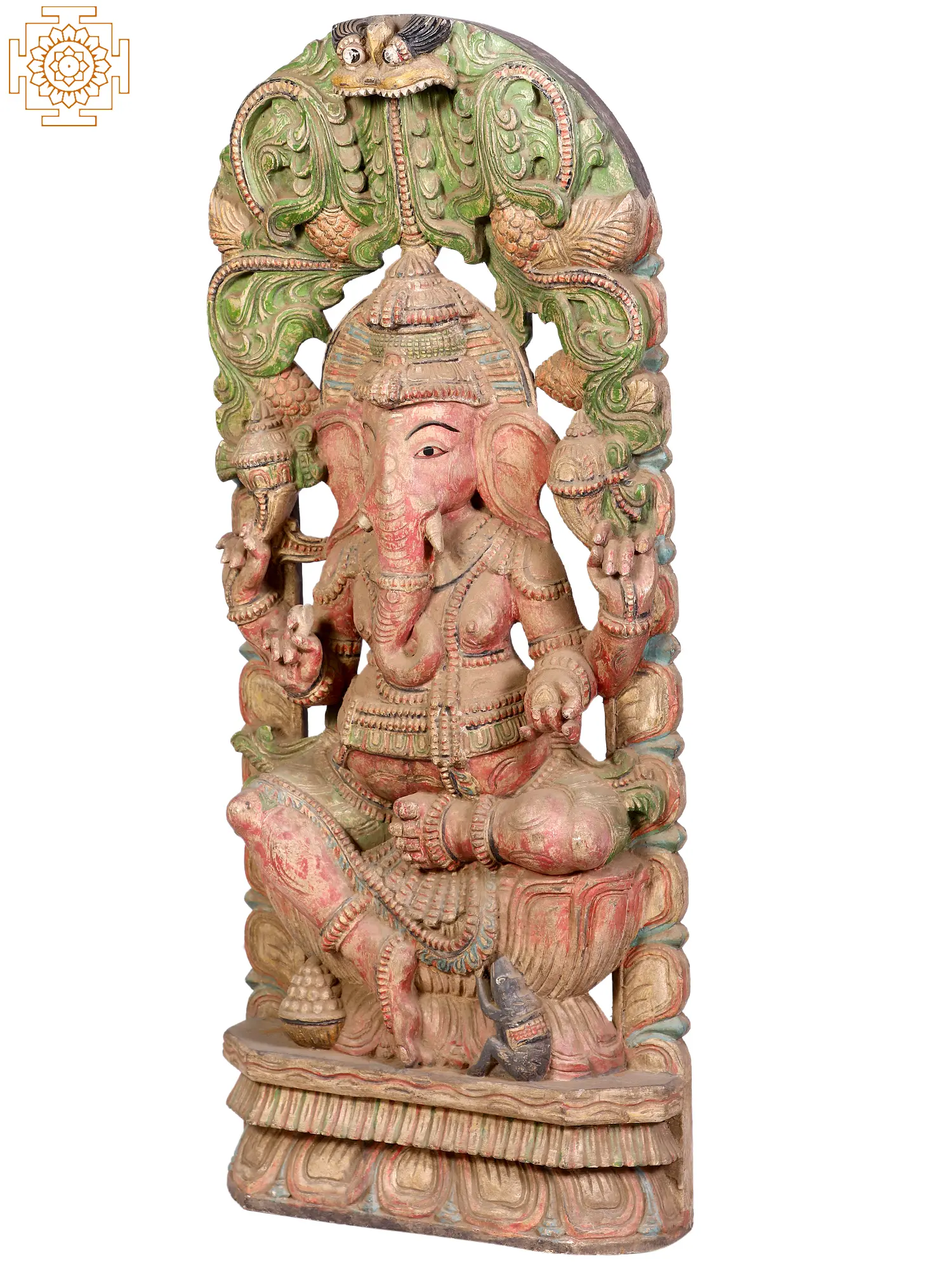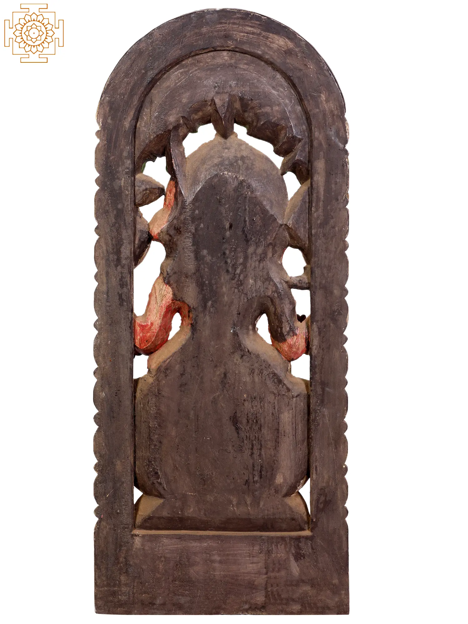 The detailed craftsmanship evident in this carving is a testament to the rich artistic traditions of India. From the serene expression on Ganesha's face to the elaborate ornamentation adorning his form, every element has been meticulously rendered. The arched backdrop, featuring stylized motifs and perhaps even representations of mythical creatures, adds a dramatic and captivating dimension to the piece. The subtle yet vibrant color accents, highlighting the natural grain of the wood, bring the deity to life and evoke a sense of sacred beauty. The inclusion of his divine mount, the mouse (Mooshika), who symbolizes Ganesha's ability to overcome even the smallest of obstacles, further enhances the narrative and spiritual depth of this artwork. Displaying this magnificent carving in your home or office is not just an aesthetic choice, but a profound invitation to welcome the blessings of wisdom, success, and the removal of all impediments on your life's journey.