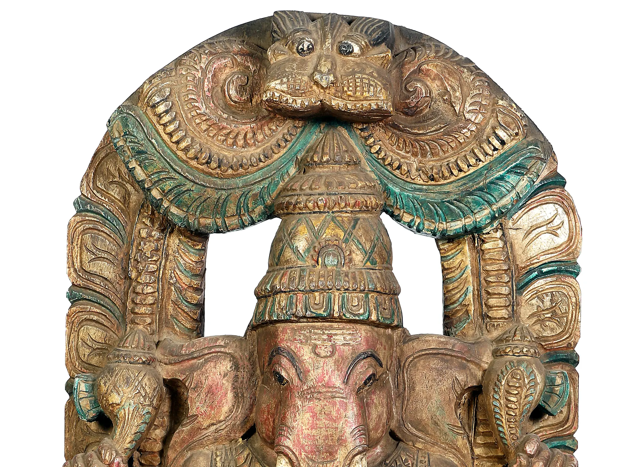 The presence of the Kirtimukha at the apex of the carving is a significant cultural and mythological element. The Kirtimukha, or "face of glory," is a motif often found adorning temples and artifacts, representing a fierce, protective visage that devours all negativity and evil. It signifies dominion over the forces of ignorance and illusion, symbolizing Ganesha's power to clear the path for his devotees. Legends tell of the Kirtimukha being created from the nail-parings of Lord Shiva, imbued with a voracious appetite that was eventually satiated by its own reflection. Its inclusion here amplifies the protective and auspicious energies of the Ganesha deity, offering a shield against adversity. This sculpture is more than just an object of art; it is a vessel of spiritual significance, carrying with it centuries of tradition and reverence. In Hindu mythology, Ganesha is celebrated for his intelligence and his unique birth story, born from the earth by his mother, Goddess Parvati, and later given an elephant's head by Lord Vishnu. His association with the divine mantra "Om" and his role as the scribe of the Mahabharata epic further solidify his importance as a god of knowledge and auspicious beginnings.