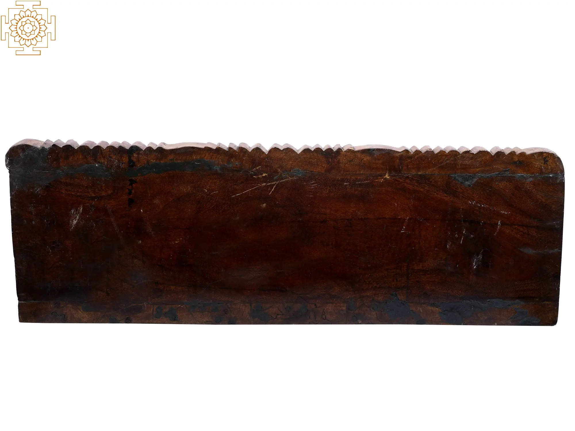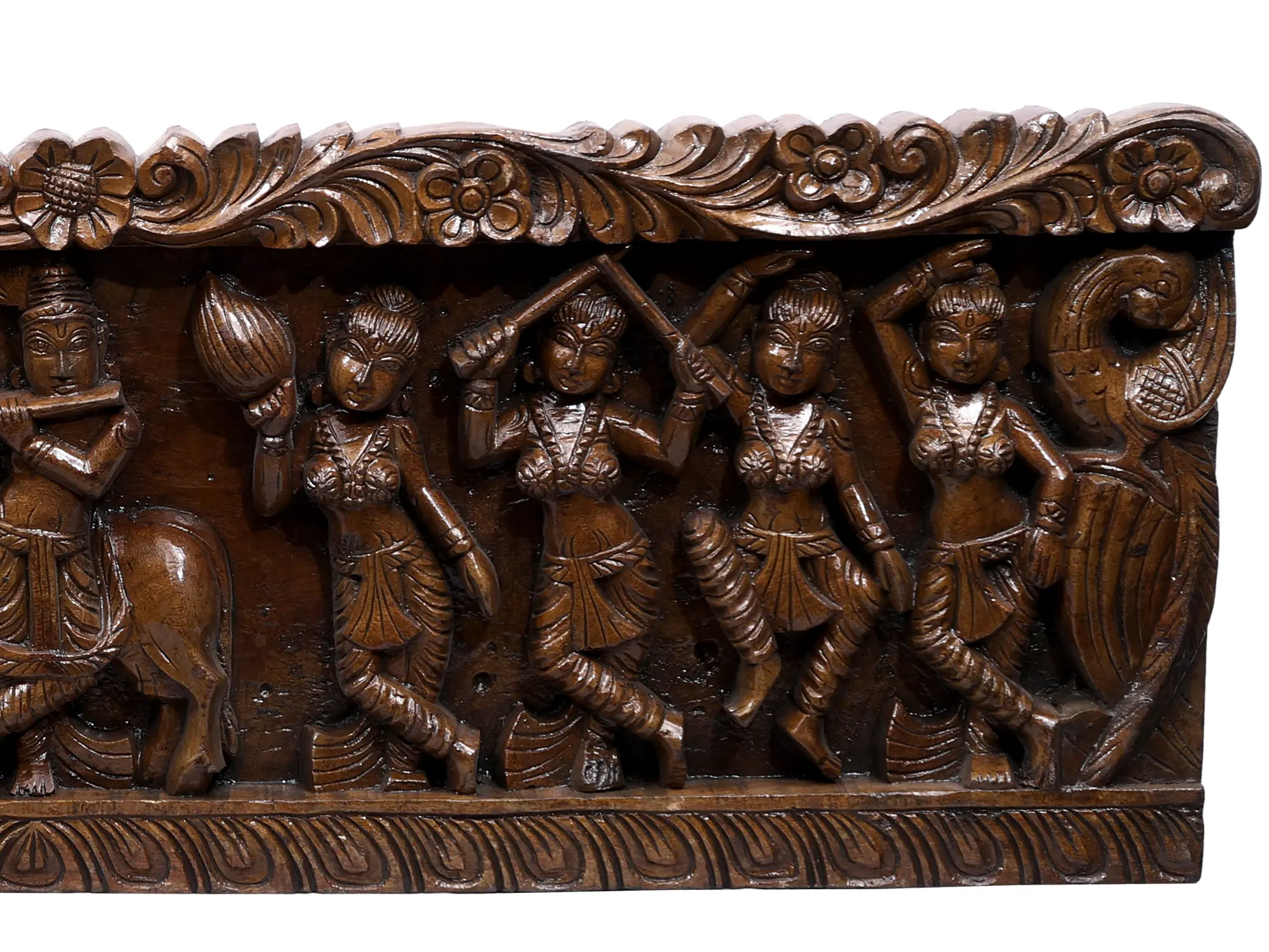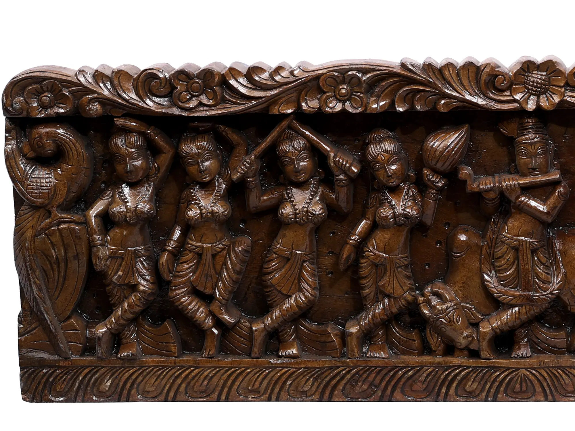 The Lilas or divine plays of Krishna form the most heart-warming aspect of the Vaishnava Bhakti tradition. Filled with emotions of Prema (love) and Bhakti (devotion), Krishna Lilas has been immortalized in artworks, such as this wooden panel, depicting the fluting Krishna surrounded by Gopis or milkmaidens of Brija, who beautifully dance to the tunes of Krishna’s Murli.