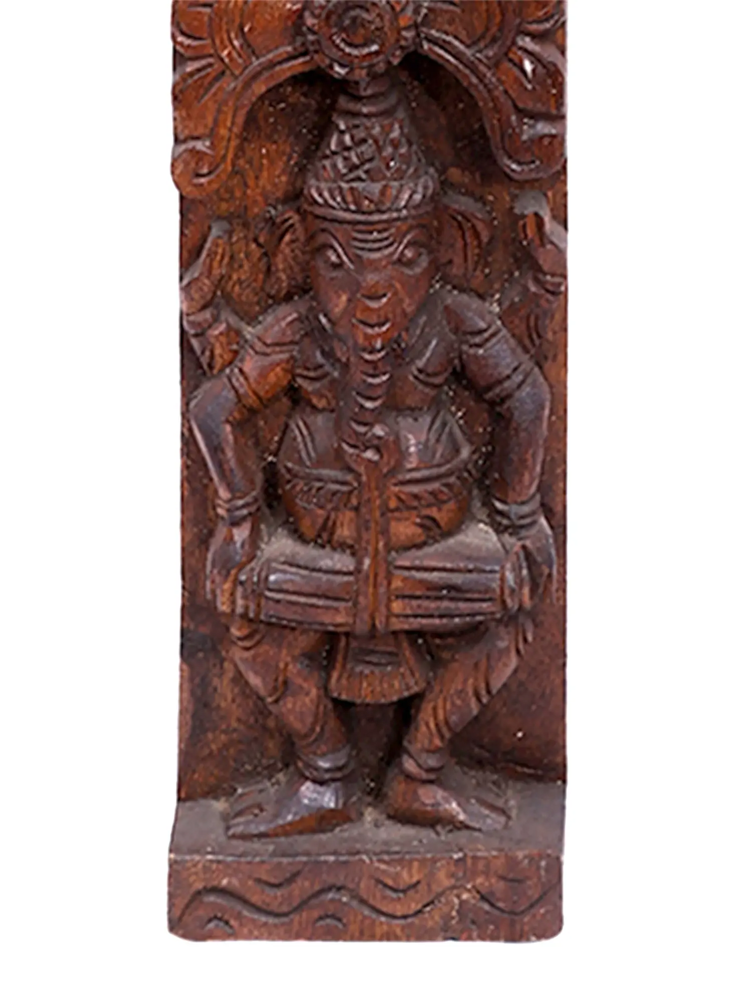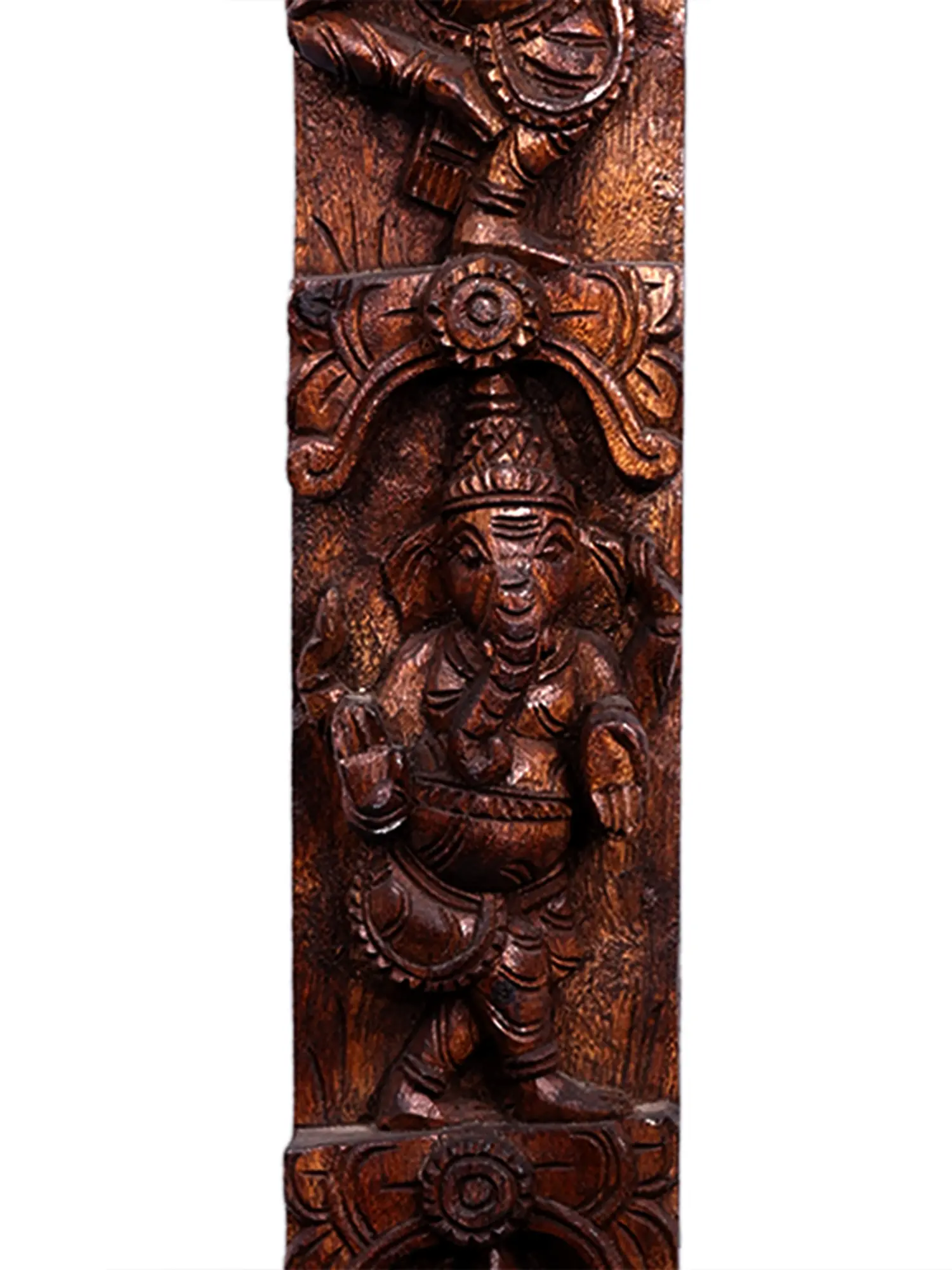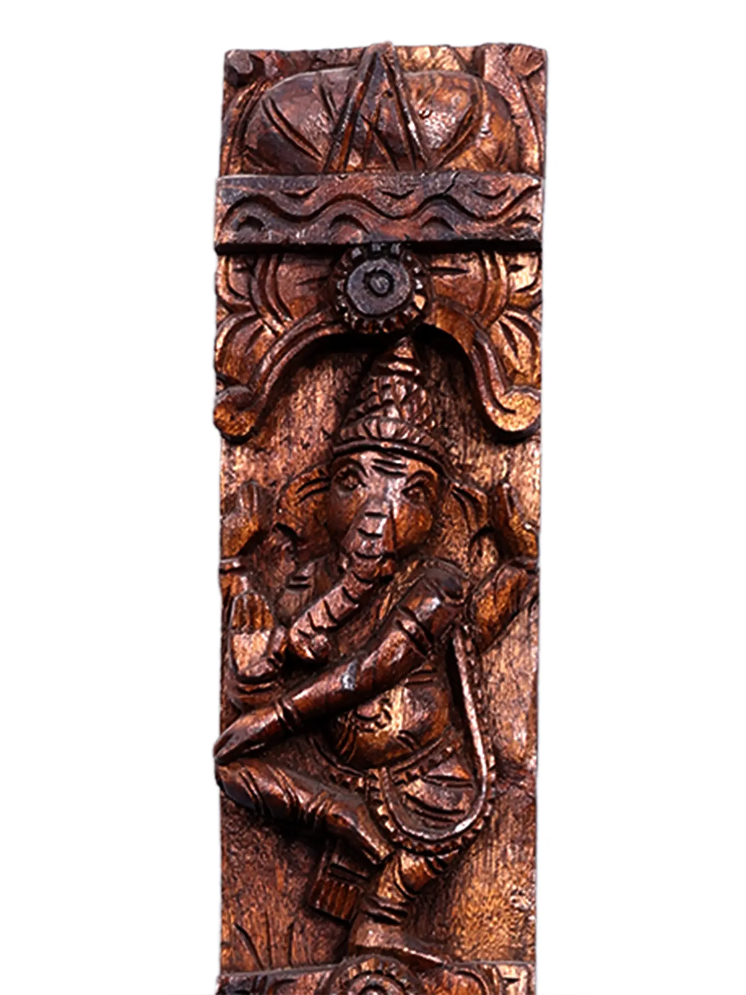 This exquisite wooden panel, meticulously carved from rich, dark wood, stands as a testament to the intricate artistry and profound spiritual heritage of India. At its apex, we are greeted by the beloved form of Lord Ganesha, the elephant-headed deity, remover of obstacles and bestower of wisdom. Depicted here in a dynamic pose, perhaps playing his divine flute, Ganesha embodies the joy and auspiciousness associated with new ventures and creative endeavors. His presence sets a tone of divine blessing for the entire piece, inviting harmony and prosperity into any space it adorns. ––––––––––