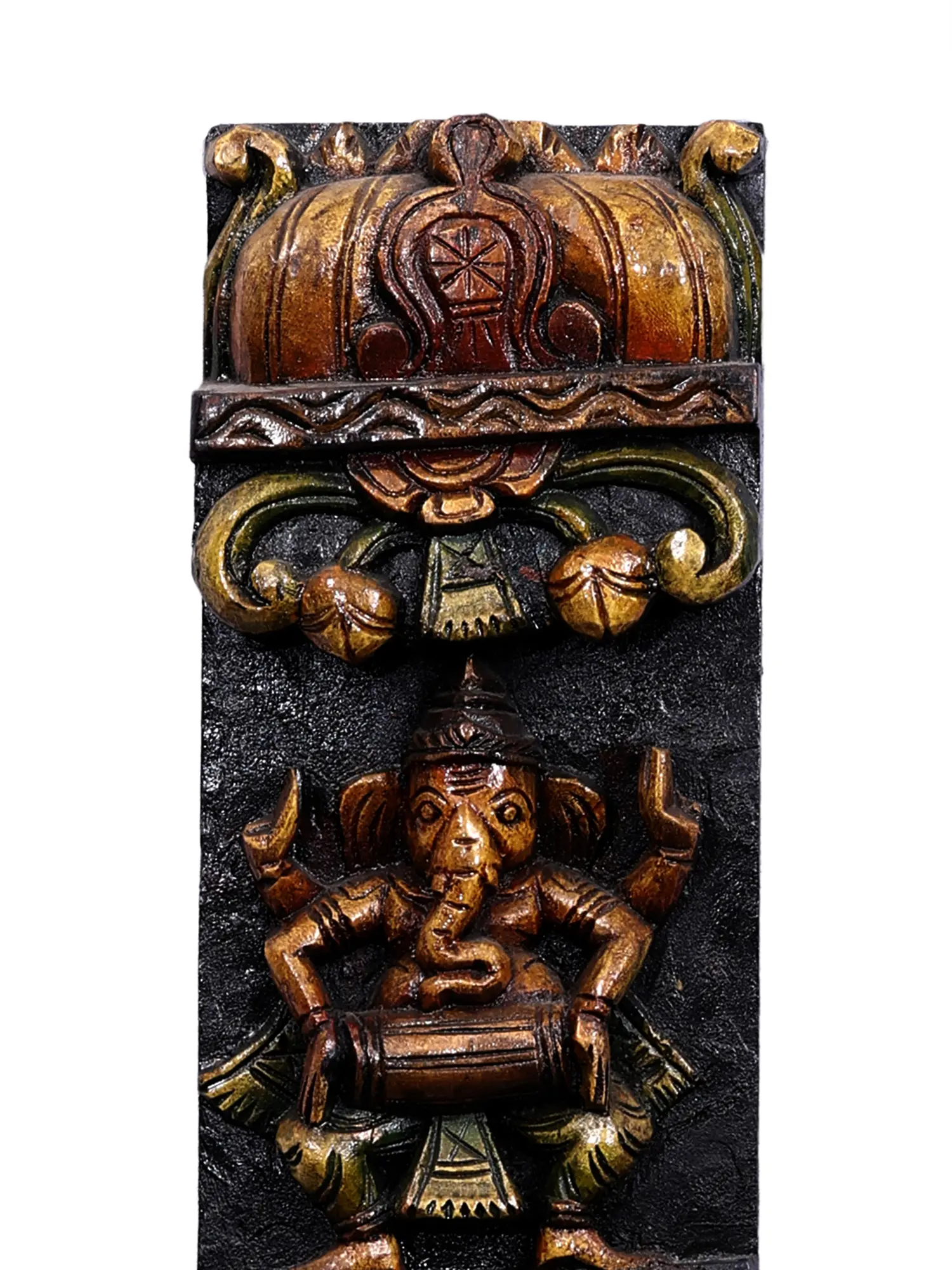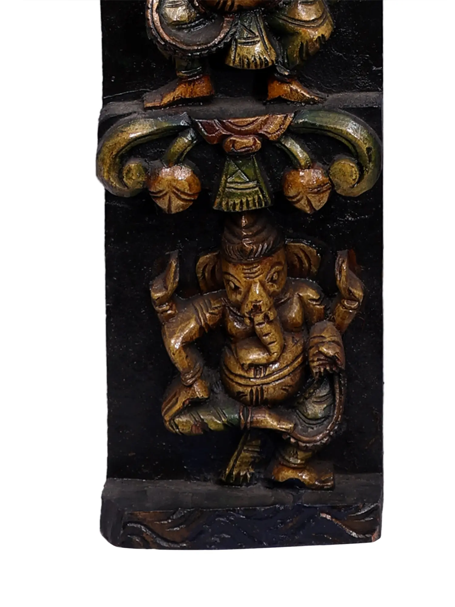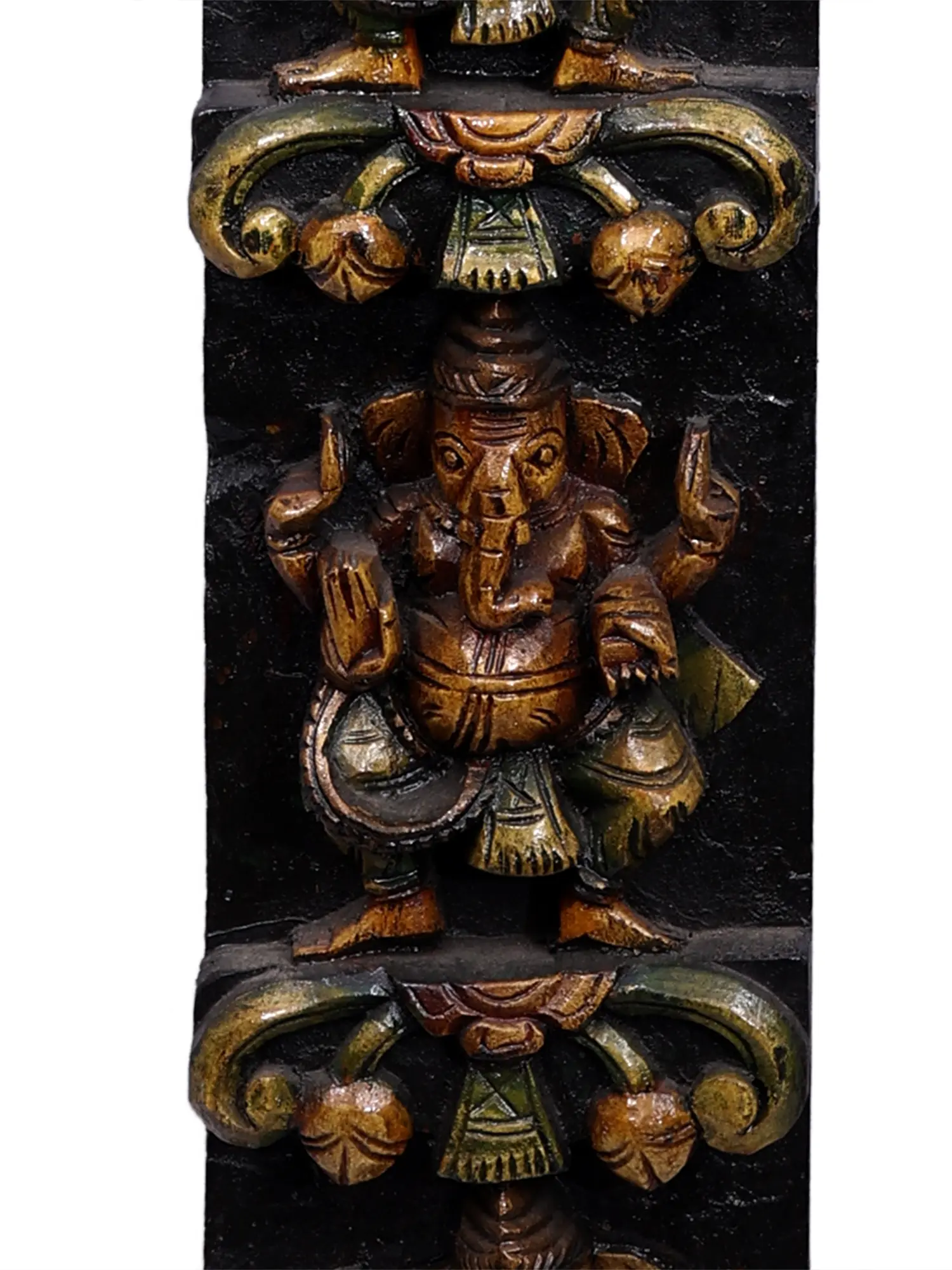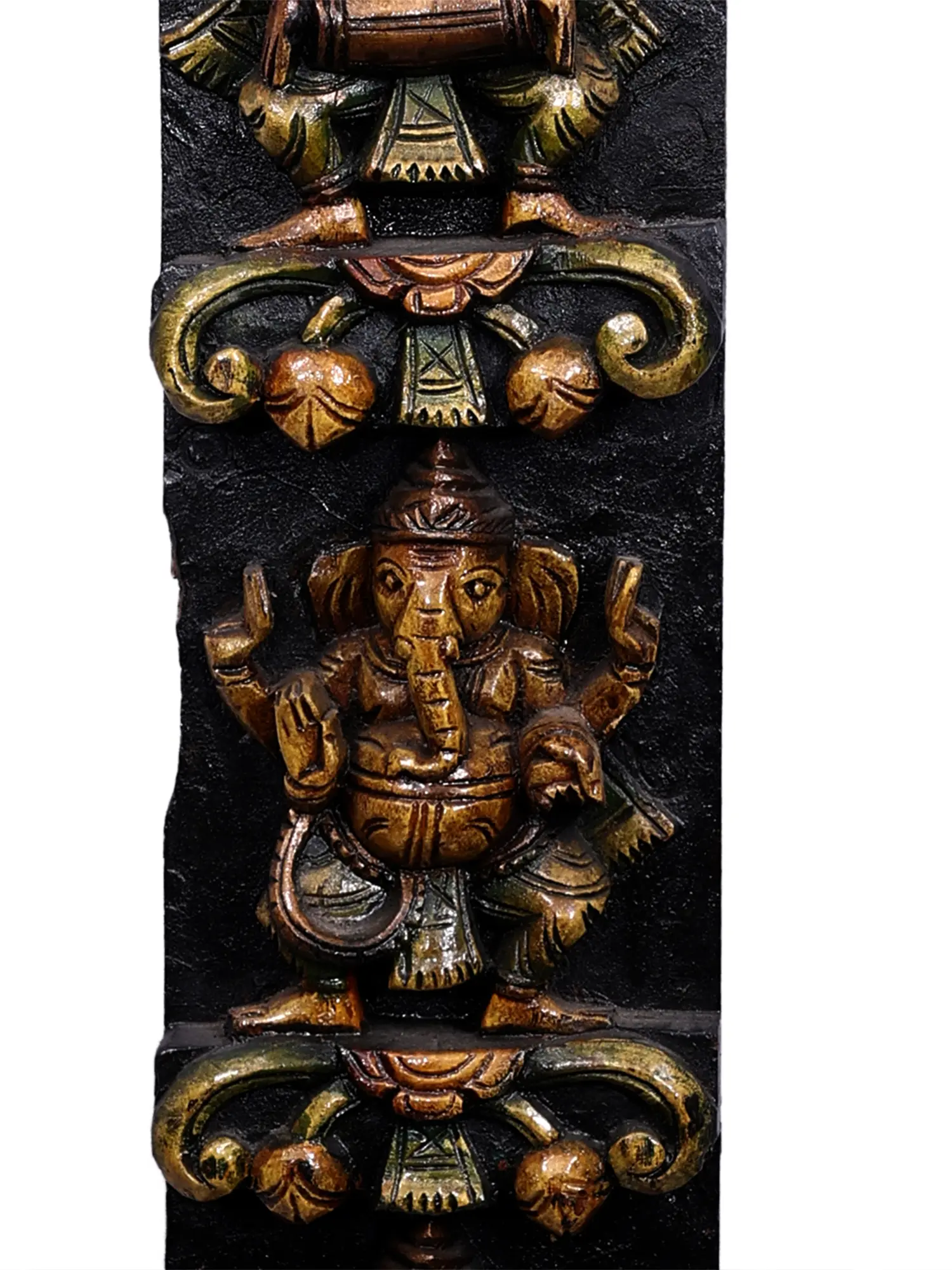 Lord Ganesha, the beloved elephant-headed god, is revered as the remover of obstacles, the patron of arts and sciences, and the intellect personified. In Hindu mythology, Ganesha is often depicted with a divine dance or playing musical instruments, reflecting his joyous and vibrant spirit. This panel captures that essence, portraying him not only as the formidable deity who clears the path for success but also as the celestial musician whose melodies can uplift the soul and bring about an atmosphere of peace and celebration. The inclusion of musical instruments in each carving highlights Ganesha's role as a symbol of creative expression and the rhythmic flow of life. The story of Ganesha's creation by his mother, Goddess Parvati, and his subsequent guardianship of her inner sanctum, is a testament to his protective and nurturing qualities. His divine wisdom is said to be so profound that he was chosen as the scribe for the epic Mahabharata, demonstrating his immense intellectual prowess.