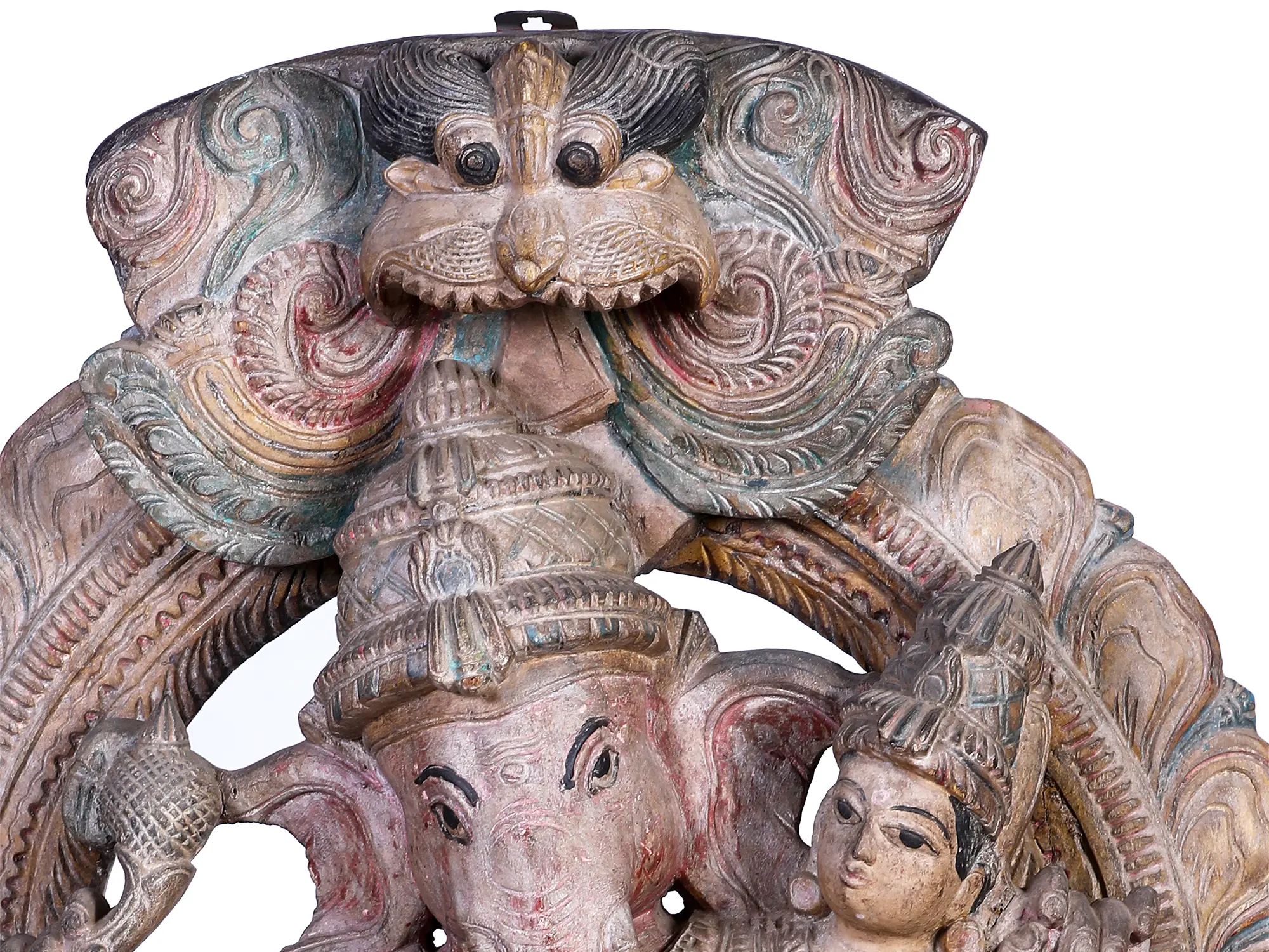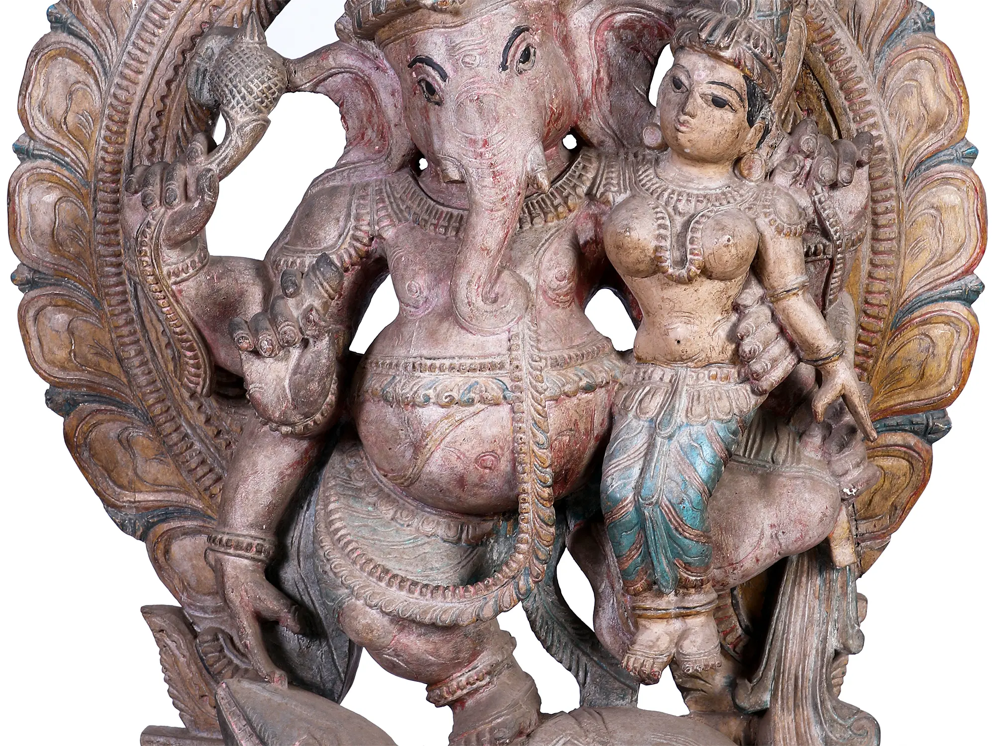 This Ganapati murti is a wood-carved sculpture of substantial proportions. It is a contemporary reproduction of the iconography which is part of ancient South Indian temple architecture. As such, it features a diverse colour palette. The pale colour of crushed lotus petals makes up Ganesha’s complexion, in direct contrast to Siddhi’s olive-coloured nakedness.