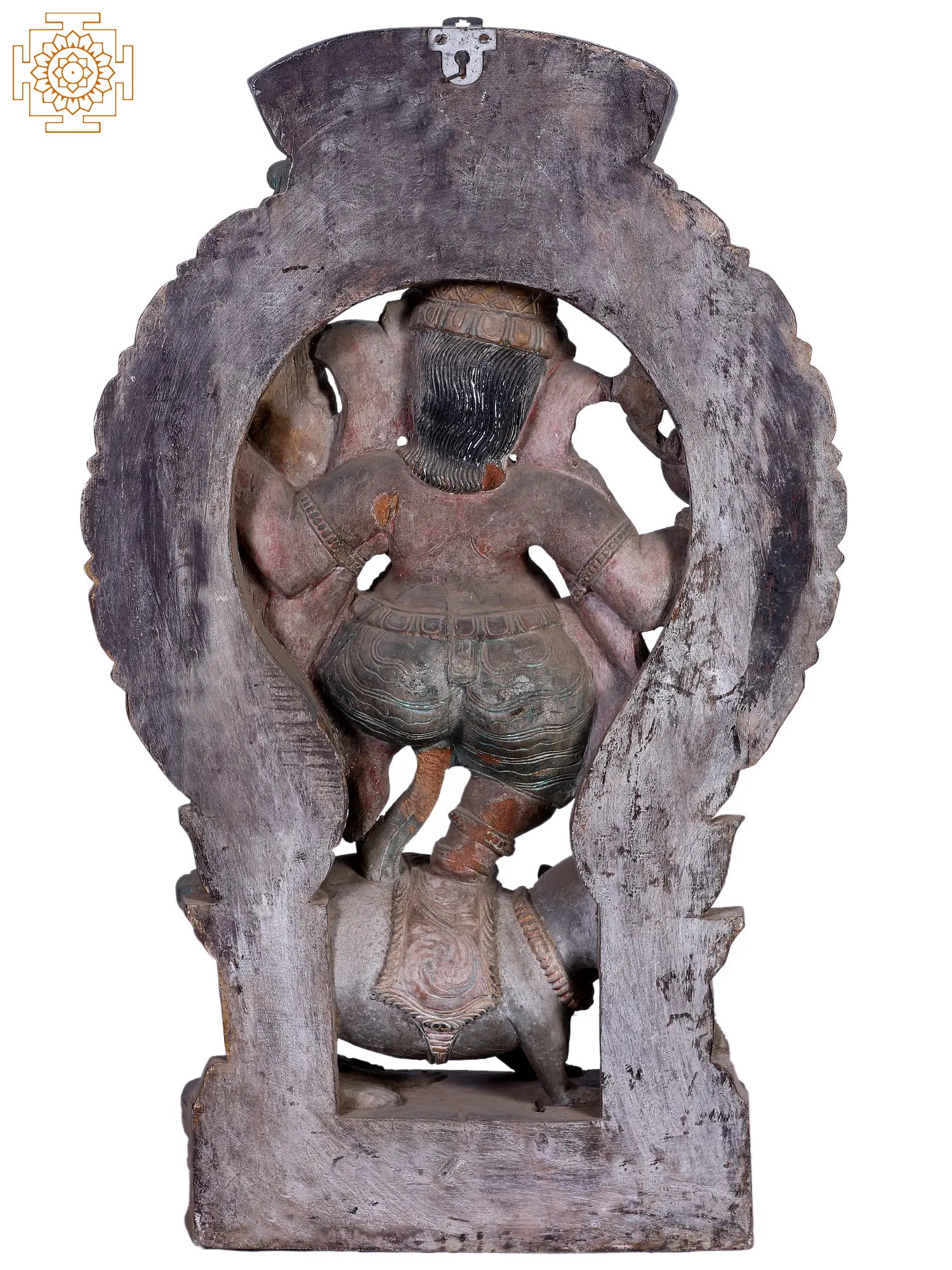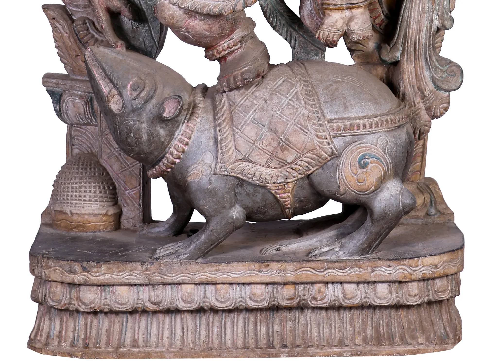 The shashabhujadhari or six-armed roopa of Lord Ganesha. On the back of His vahana, the mouse, He stands, with a single foot pressed against the docile creature. The other leg is bent, the foot raised high in the air. Seated on the bent limb is Devi Siddhi, the little-known wife of Ganesha.