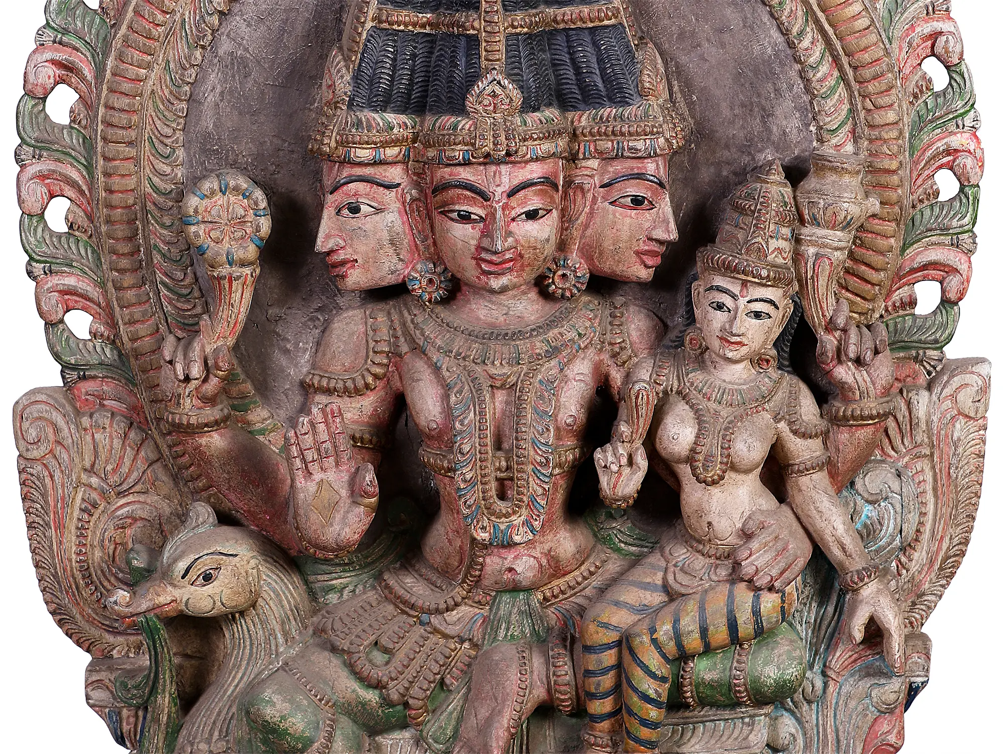 The gentle Lord Brahma, with His three heads turned in three different directions, is seated on the back of a peacock. On His lap is the inimitably beautiful Sarasvati. Deep black crowns of an elongated structure on all three heads of Brahma. At the zenith of them all is the all-consuming Kirtimukham.