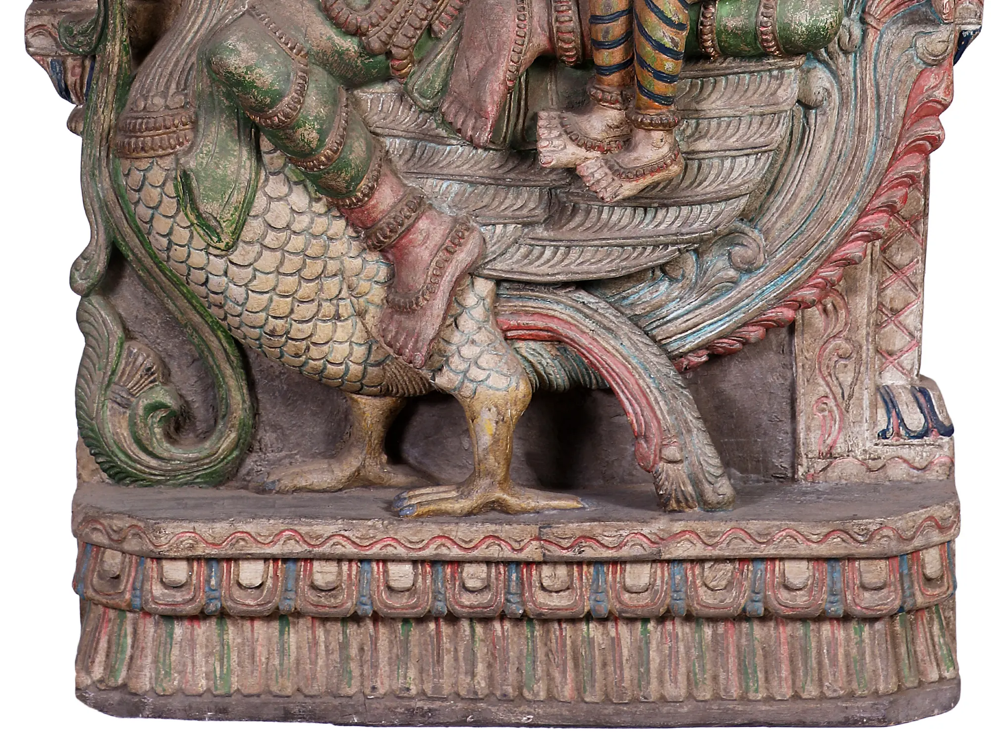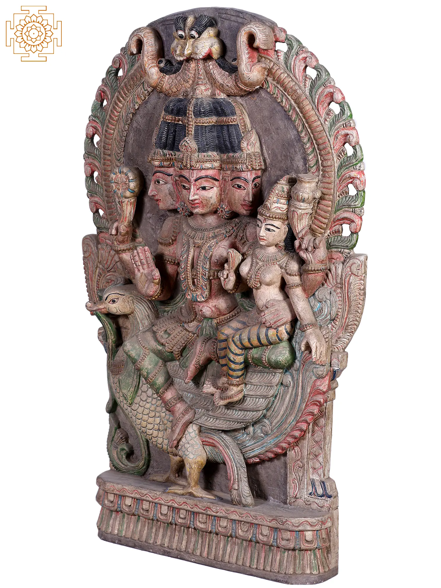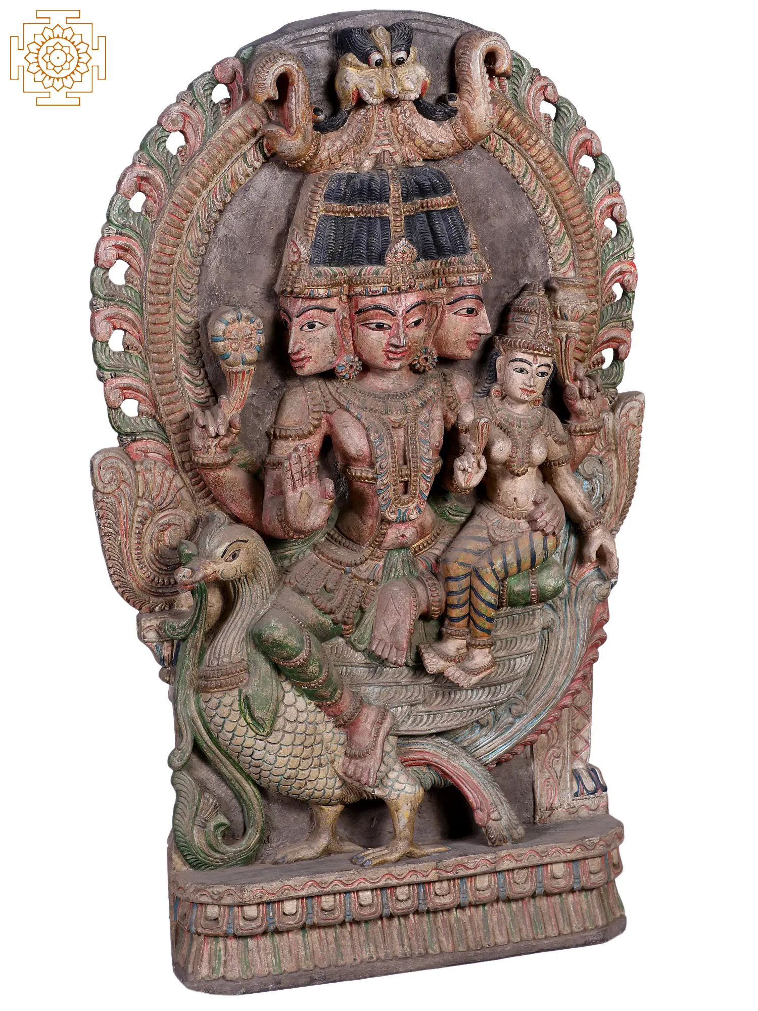 The unusual Brahma-Sarasvati murti that you see on this page is carved from wood. It features the chaturbhujadhari omnipotent Devata in a myriad of colours that look great against the organic medium - green and crimson and ochre. Behind seated divinity, the aureole is as gorgeously done up as the lifelike features of Brahma-Sarasvati’s many faces.