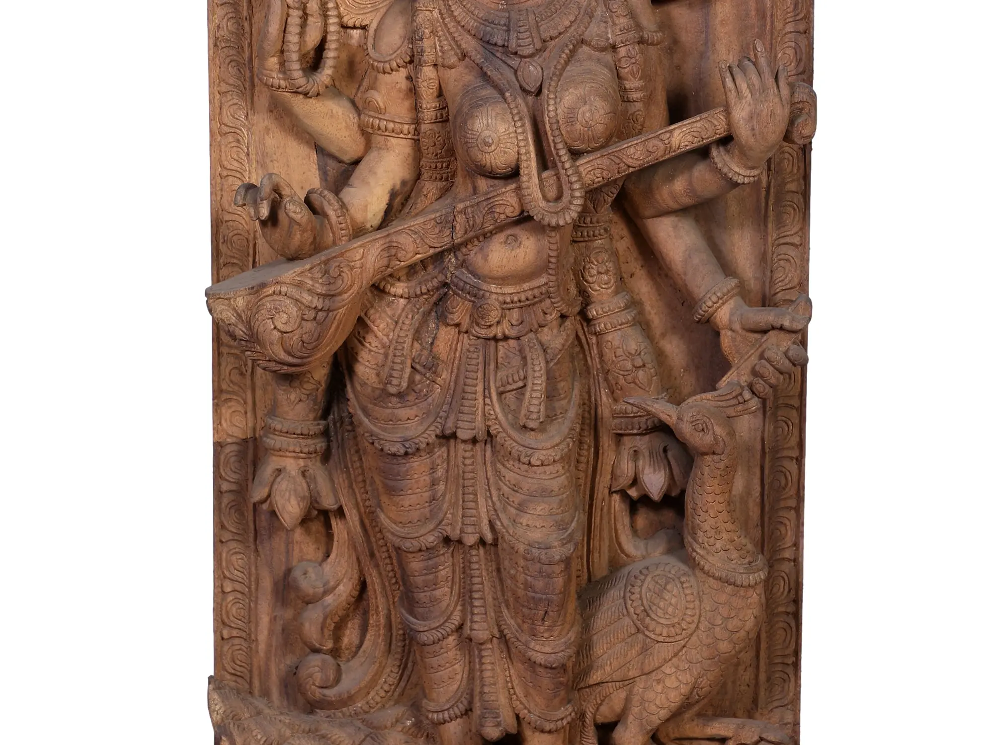 36" Large Wooden Standing Devi Saraswati with Peacock