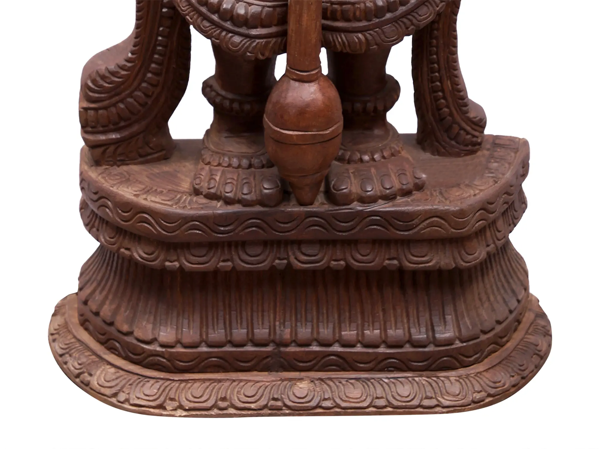 Hanuman is exquisitely adorned, with fine details on the wood adding richness to his ornamentations. With a sacred Tilak on his forehead and a heavenly tranquility on his face, Bhagawan Hanuman fills the statue with his presence.