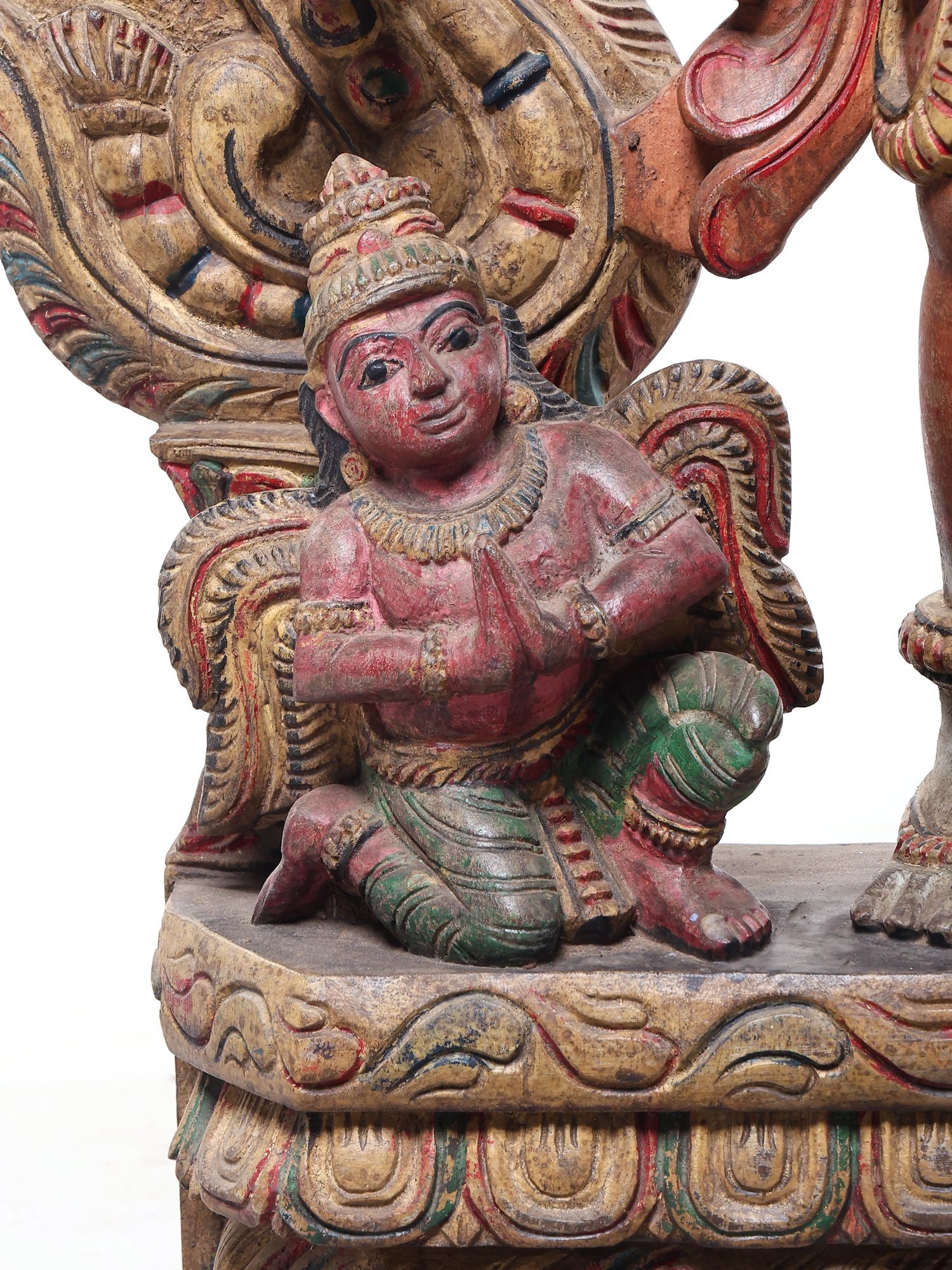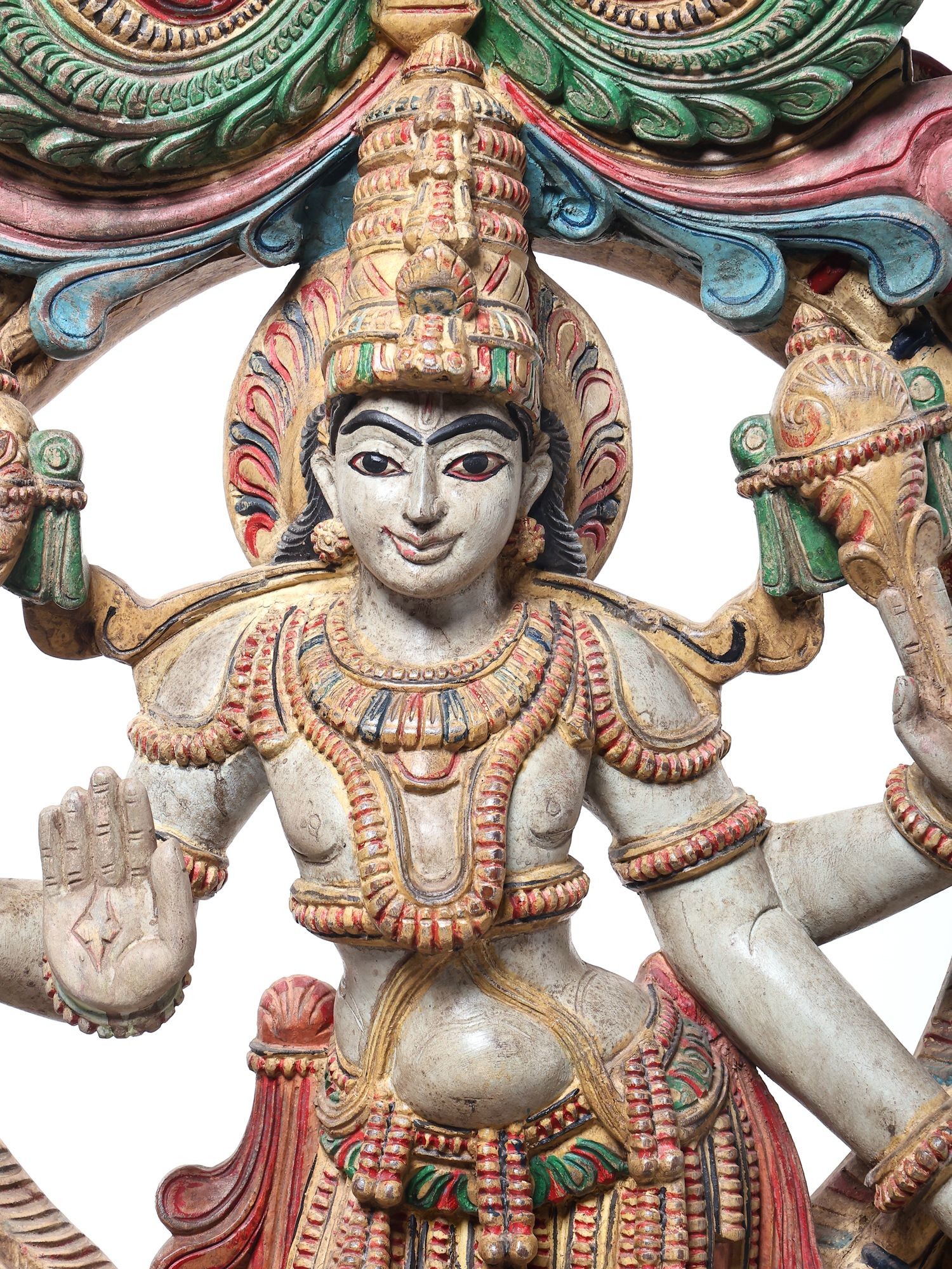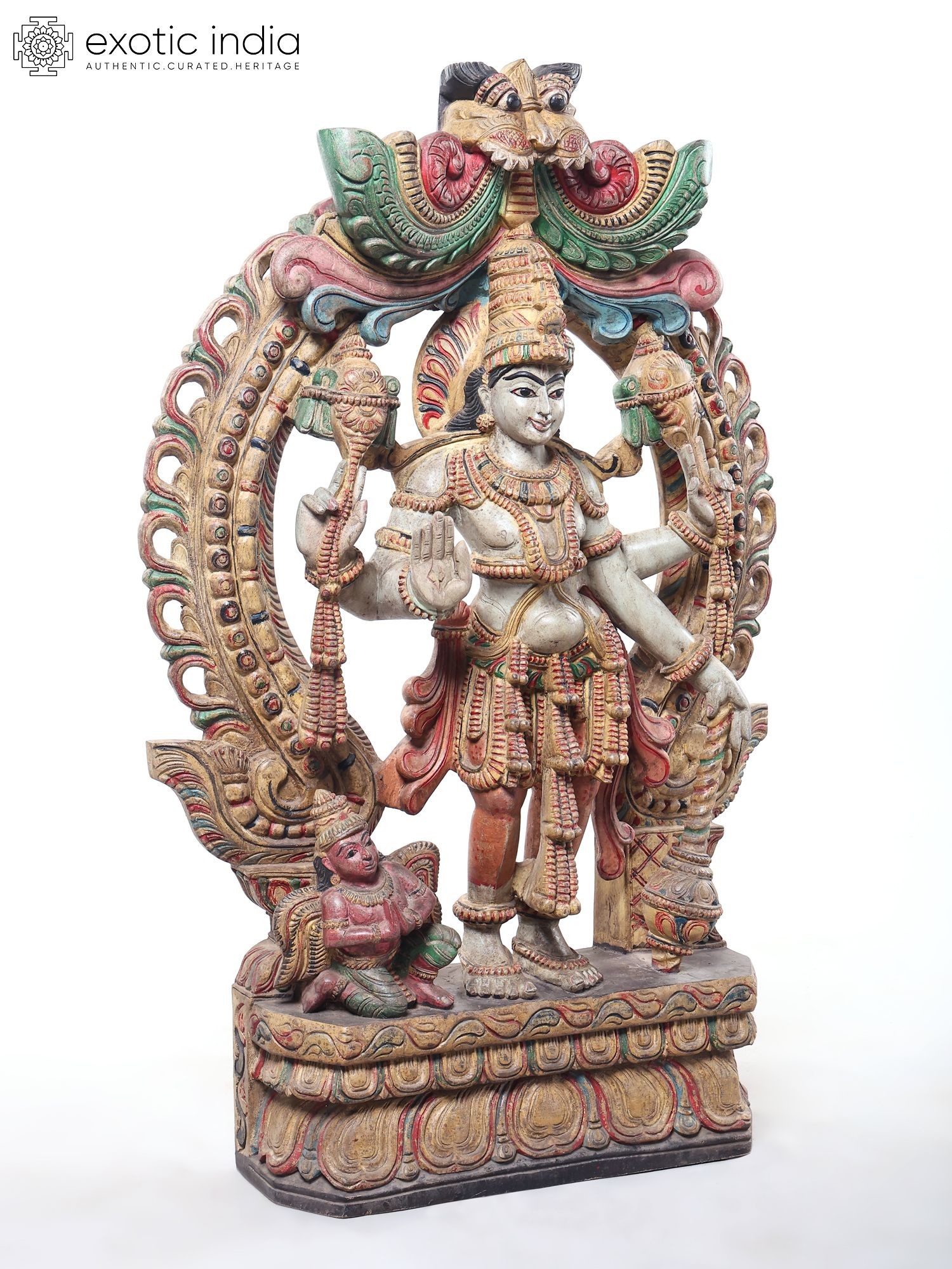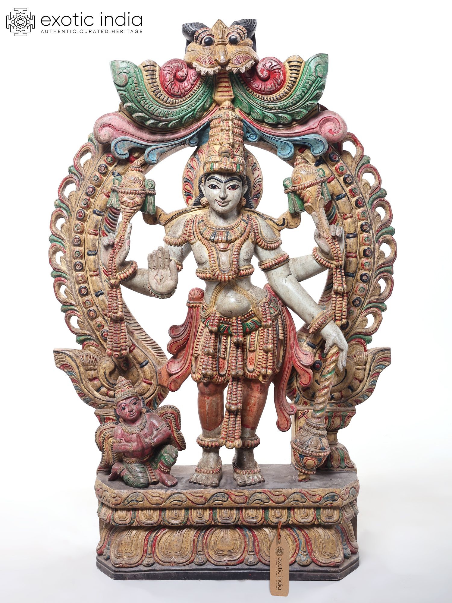 Symbolic iconography includes the divine conch shell and discus, representing cosmic order and power.