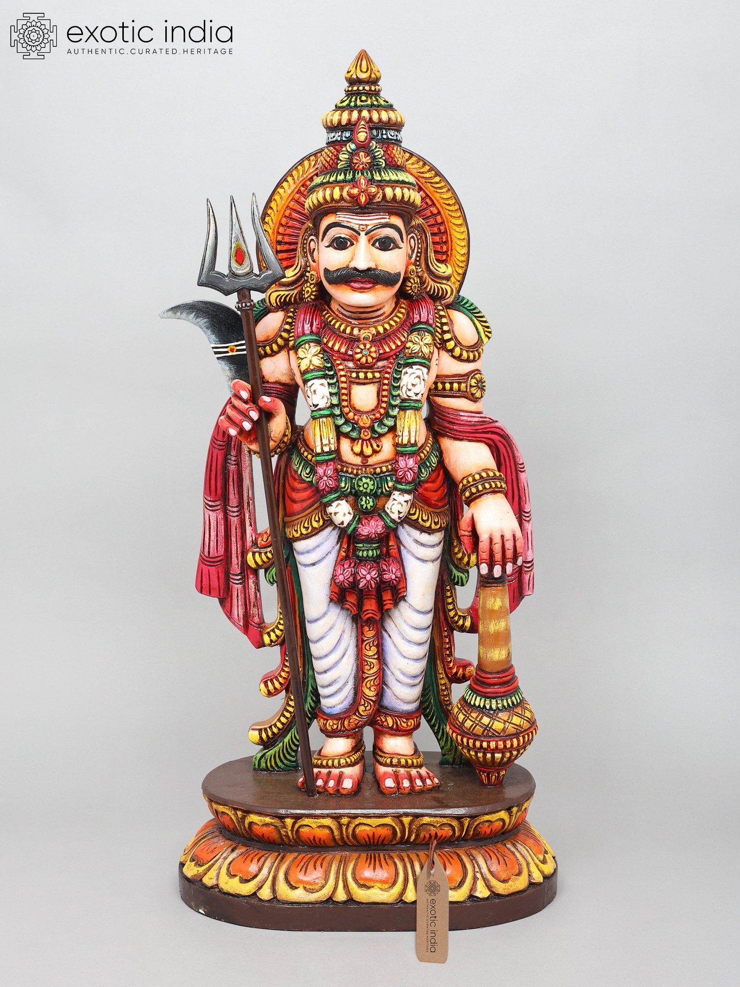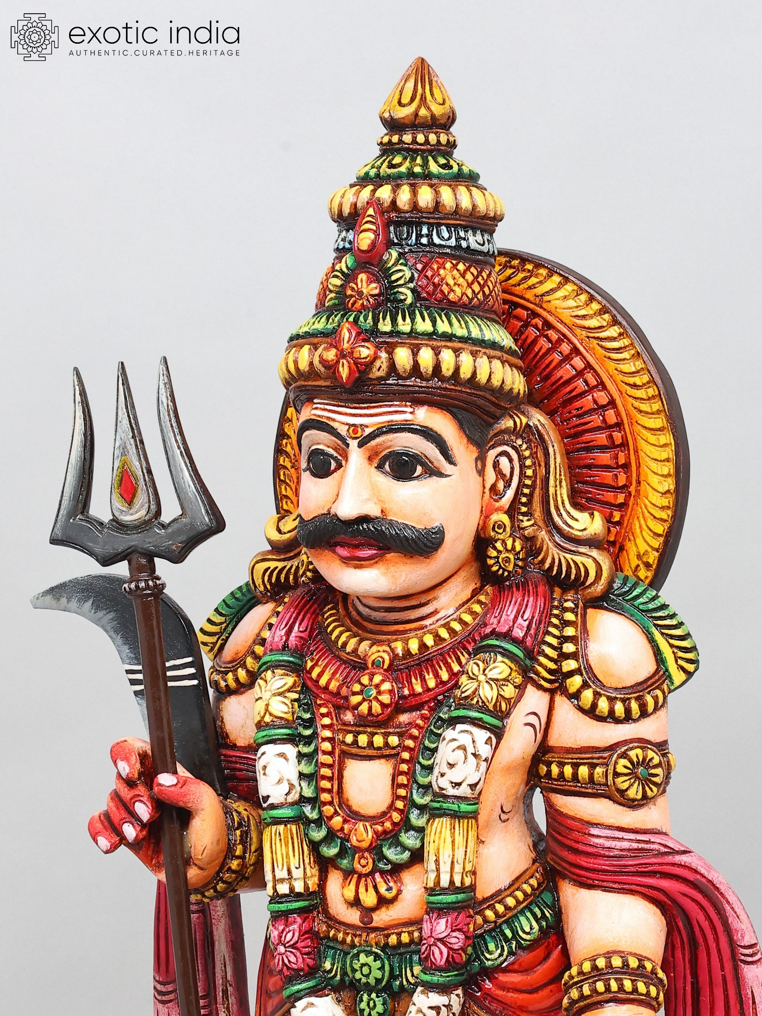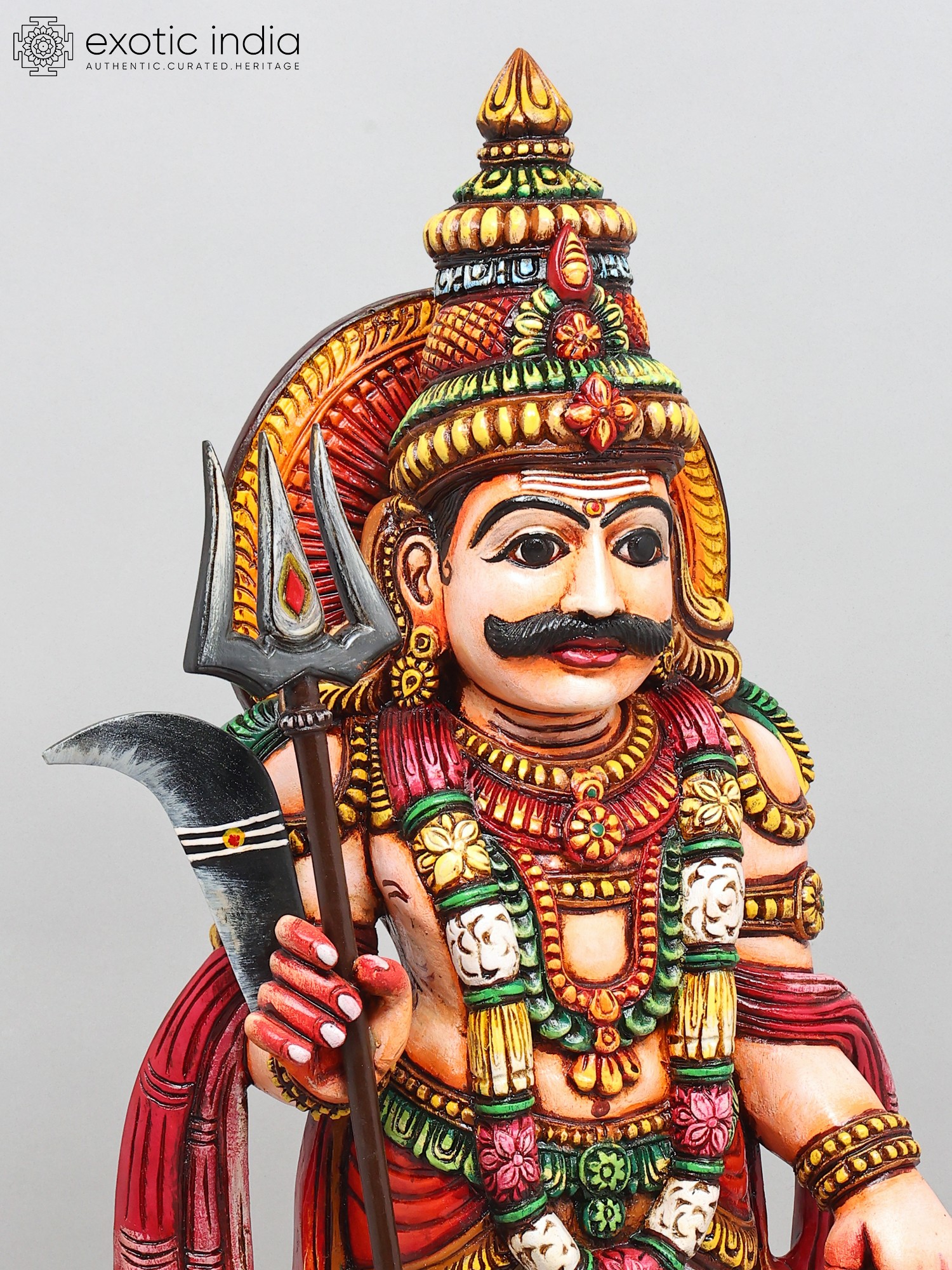 Muniswaran is a benevolent deity revered in South Indian folk Hinduism, often considered a form of Lord Shiva or a guardian deity. He is believed to bestow protection, ward off evil spirits, and grant blessings of health, wealth, and happiness to his devotees. The iconography of Muniswaran is rich and symbolic. Often depicted with a stern yet compassionate expression, he carries traditional weapons like a trident (Trishul) and a mace (Gada), signifying his power to combat negativity and uphold righteousness. His distinctive mustache adds to his commanding yet approachable aura. This wooden idol captures these divine attributes with remarkable fidelity, making it a powerful focal point for your spiritual practices.