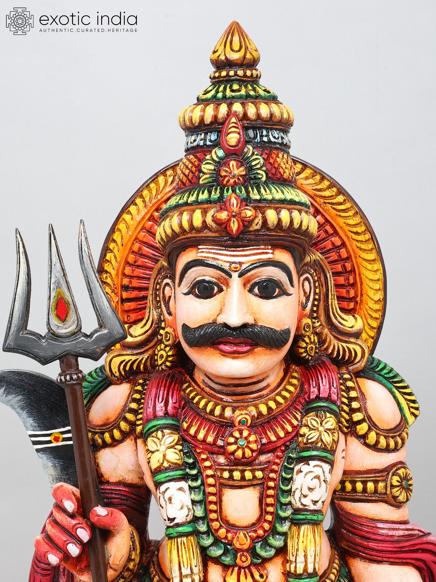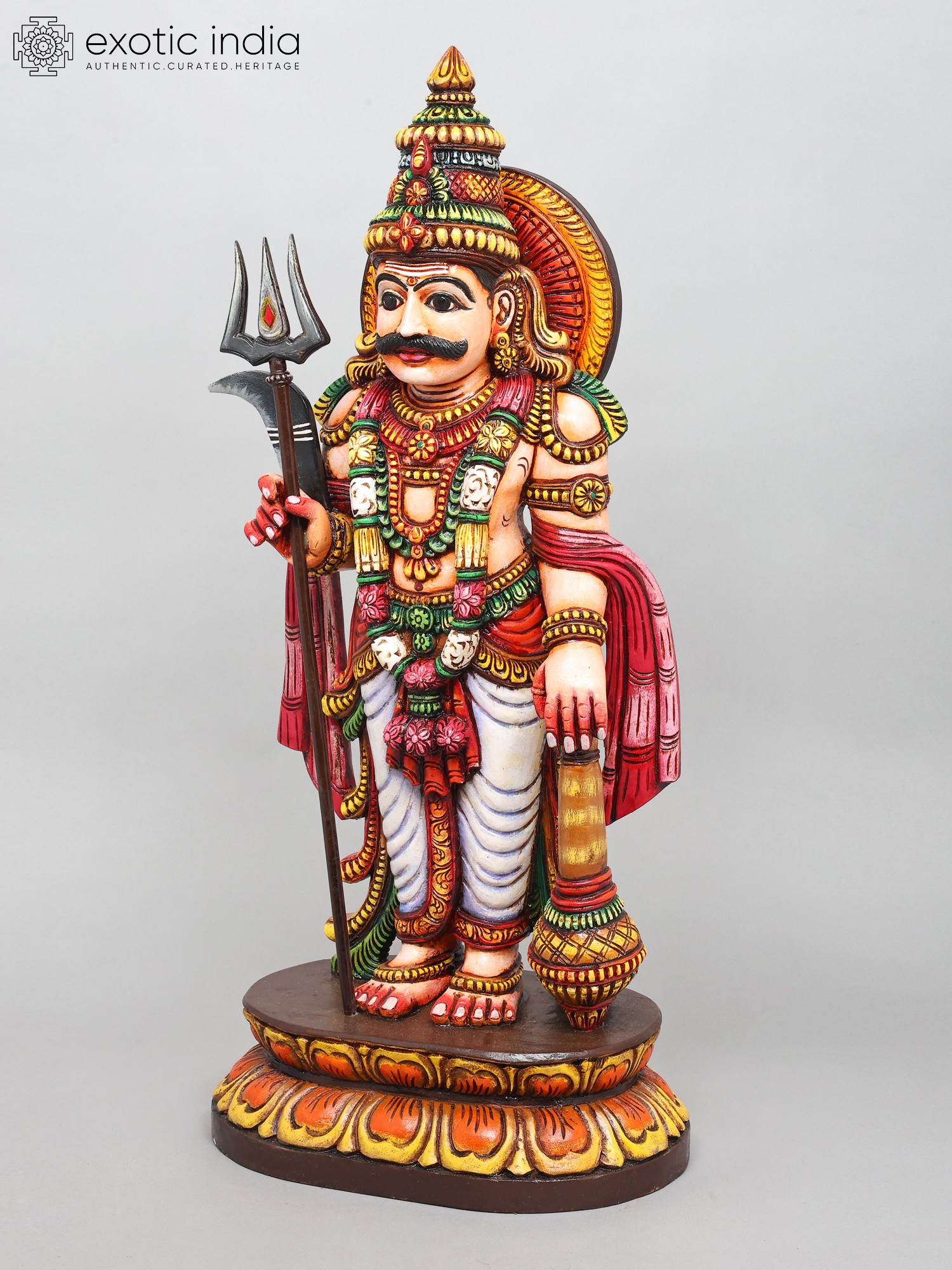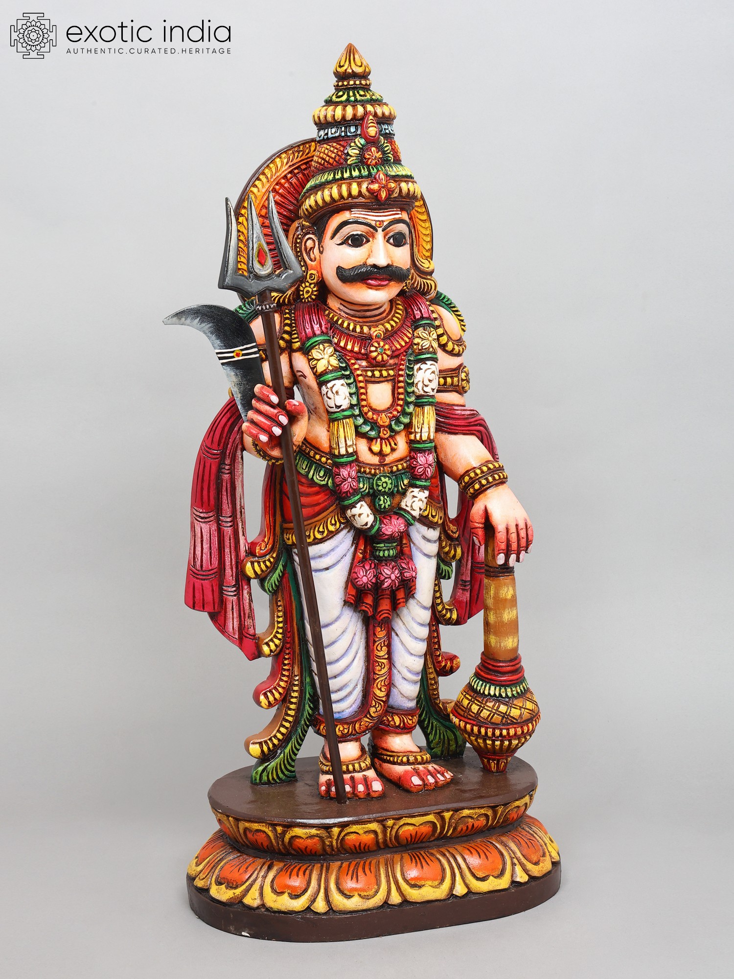 Muniswaran is a benevolent deity revered in South Indian folk Hinduism, often considered a form of Lord Shiva or a guardian deity. He is believed to bestow protection, ward off evil spirits, and grant blessings of health, wealth, and happiness to his devotees. The iconography of Muniswaran is rich and symbolic. Often depicted with a stern yet compassionate expression, he carries traditional weapons like a trident (Trishul) and a mace (Gada), signifying his power to combat negativity and uphold righteousness. His distinctive mustache adds to his commanding yet approachable aura. This wooden idol captures these divine attributes with remarkable fidelity, making it a powerful focal point for your spiritual practices.