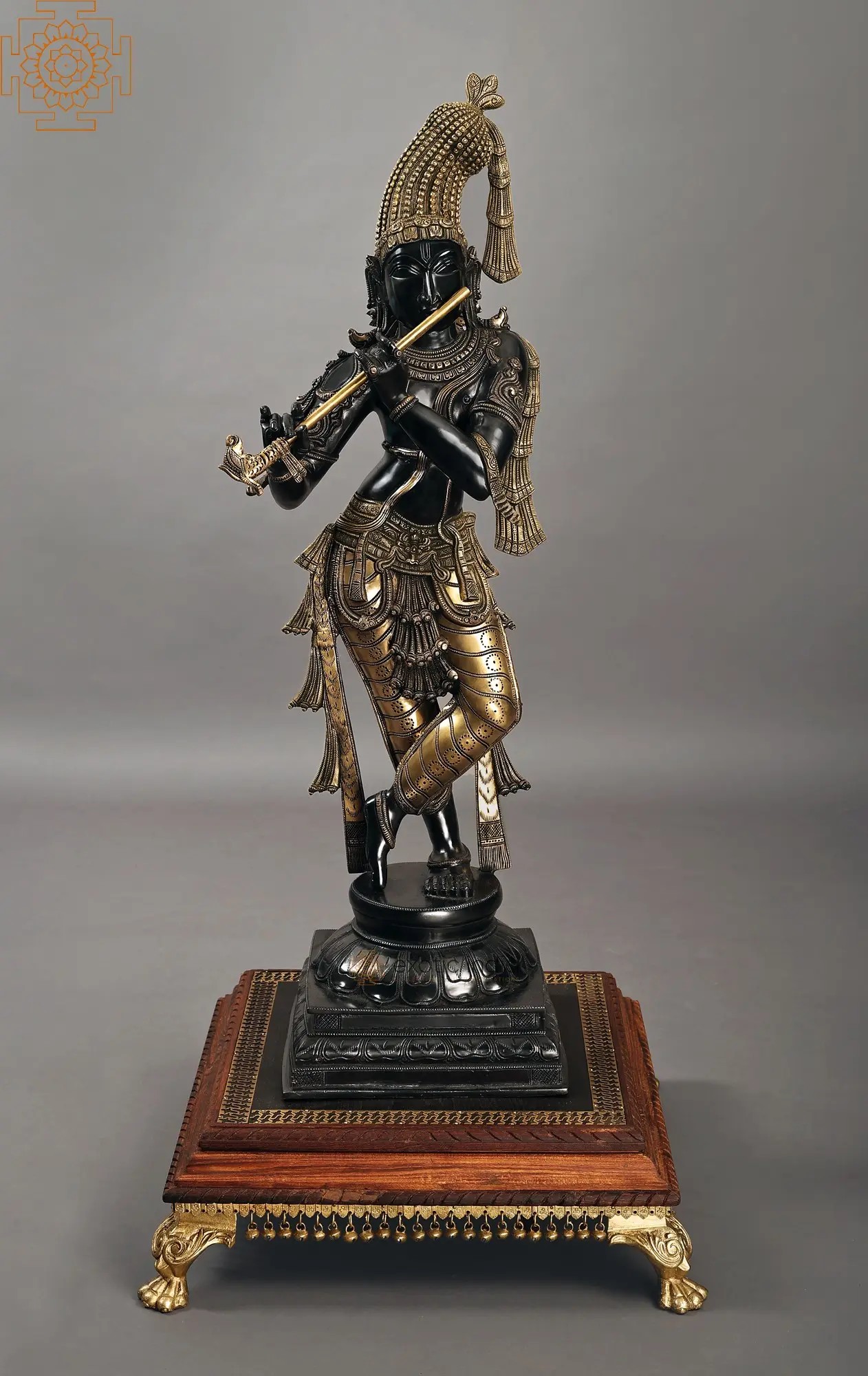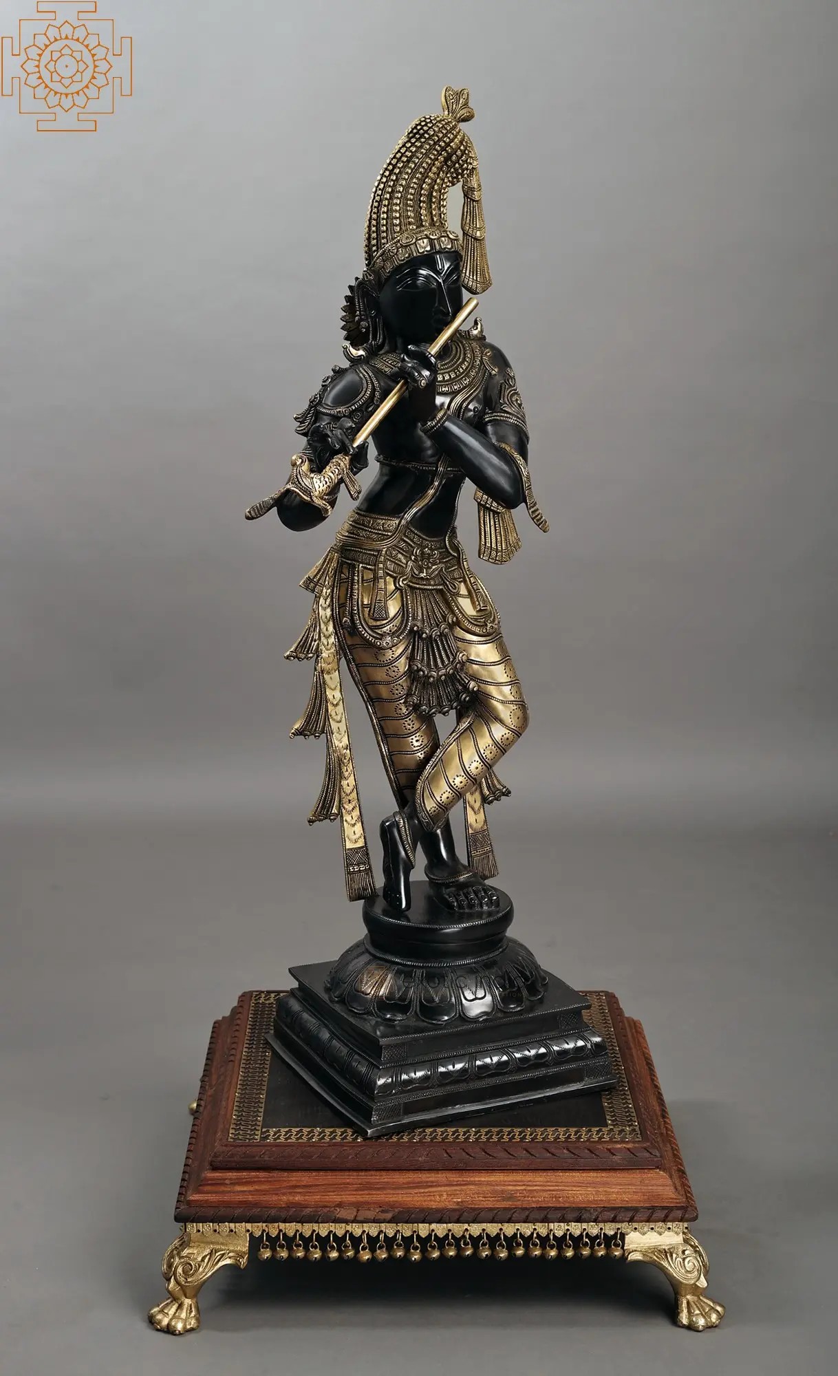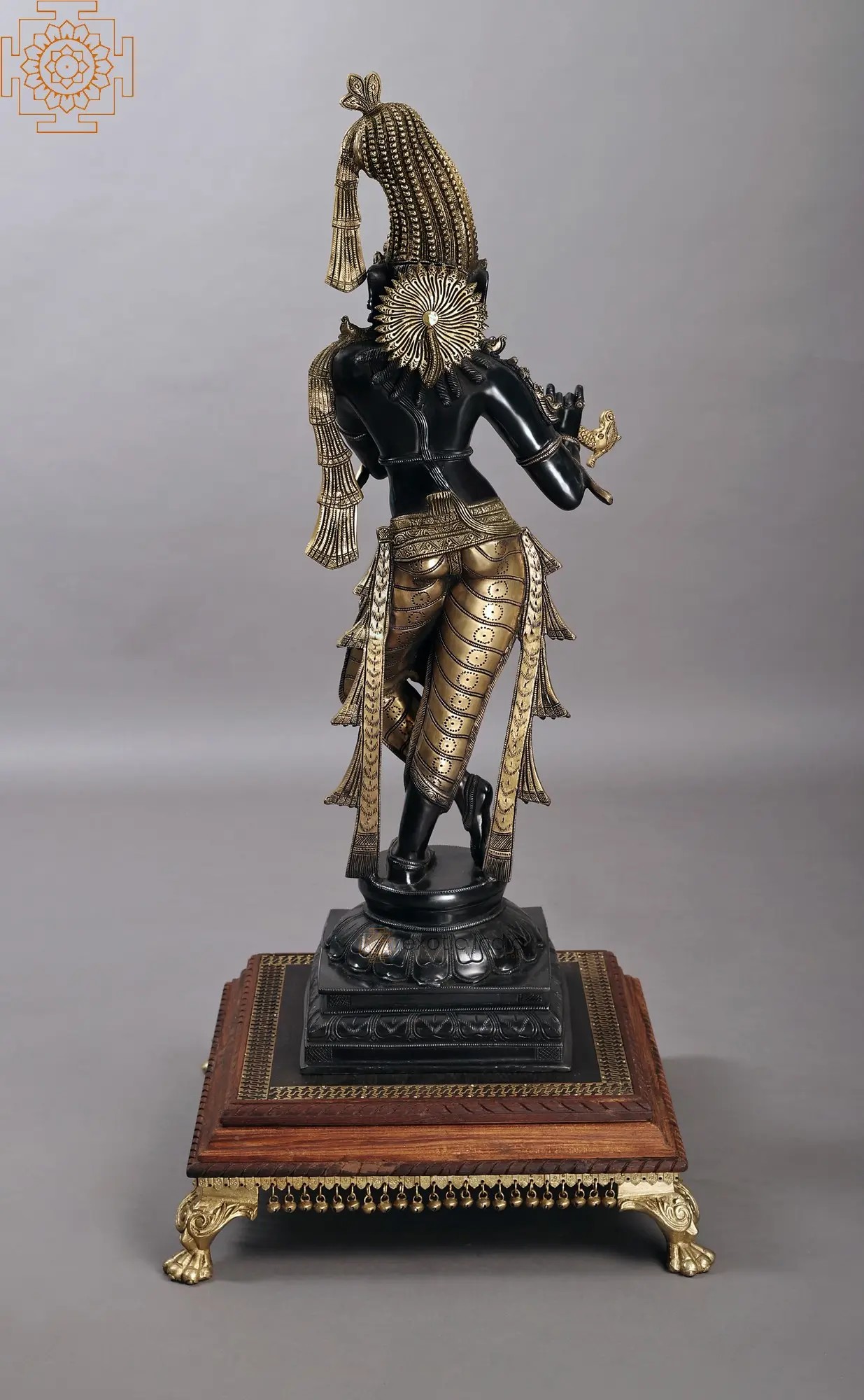 A statement brass designed to grace the home of the finest of Vaishnava devotees. This supersized figure of the tribhanga murari is a skilful execution of the characteristic iconography of Lord Krishna.