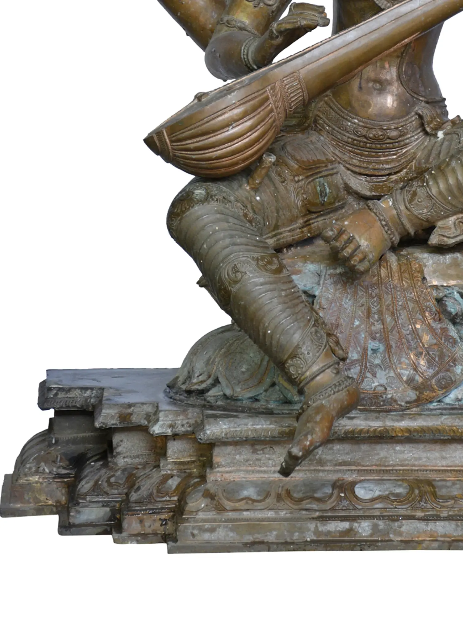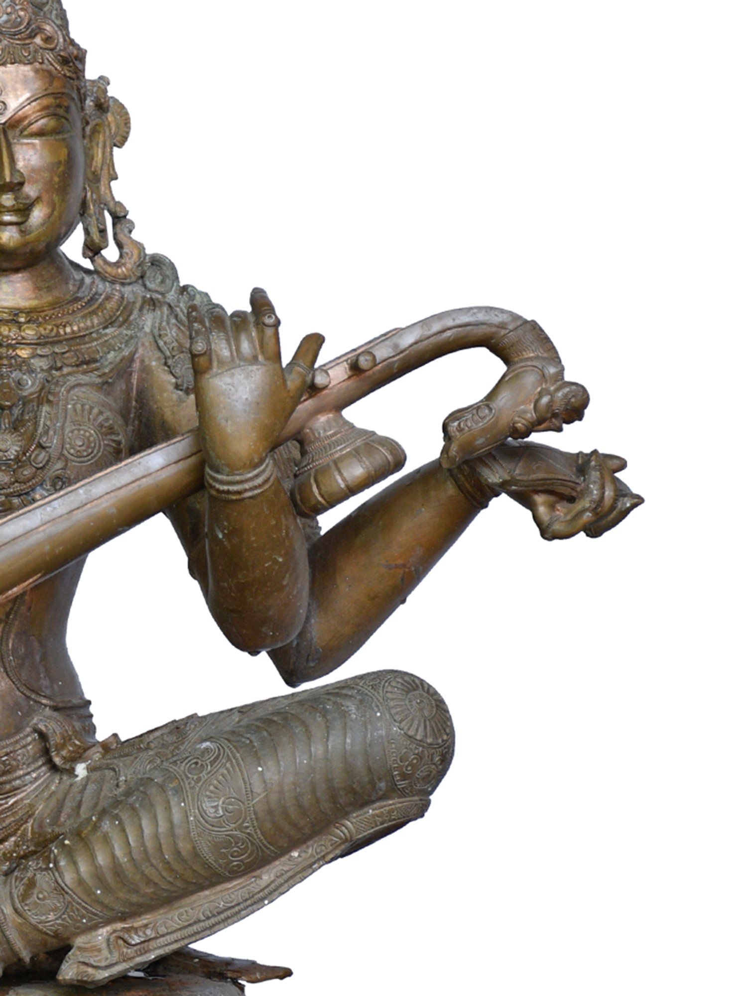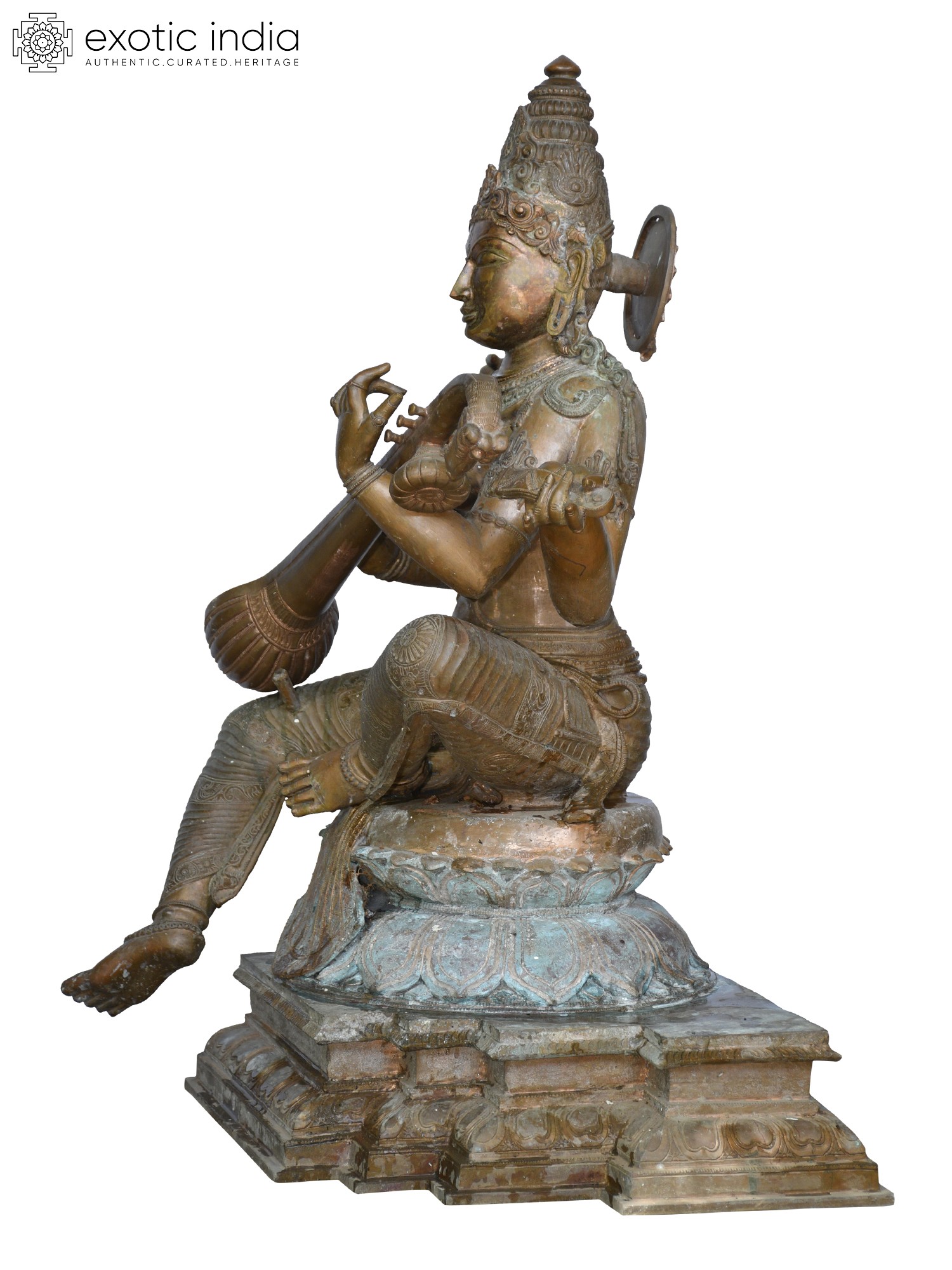 This magnificent statue captures the essence of Goddess Saraswati, the celestial patron of knowledge, music, art, and wisdom. Rendered in solid copper, the sculpture stands as a testament to timeless artistry and spiritual devotion. Saraswati, often depicted as 'Veena Vadini' (one who plays the Veena), is shown in her characteristic posture, fingers poised to create enchanting melodies that resonate with the divine. Her serene countenance, adorned with intricate jewelry and a majestic crown, exudes an aura of profound peace and intellectual brilliance. The traditional cross-legged seated position, resting upon a beautifully detailed lotus pedestal and layered platform, signifies her elevated status and calm transcendence. The choice of solid copper for this artwork is significant. Copper, in various ancient traditions, is associated with purity, conductivity, and the channeling of divine energies. Its inherent warmth and malleability allow for the creation of such detailed and evocative representations, ensuring that every curve of the Veena, every fold of her divine garment, and every subtle expression on her face is rendered with remarkable precision. The patina developed over time on this copper statue speaks of its age and the reverence it has garnered, adding a depth and character that synthetic materials cannot replicate. ––––––––––––––––––