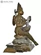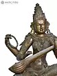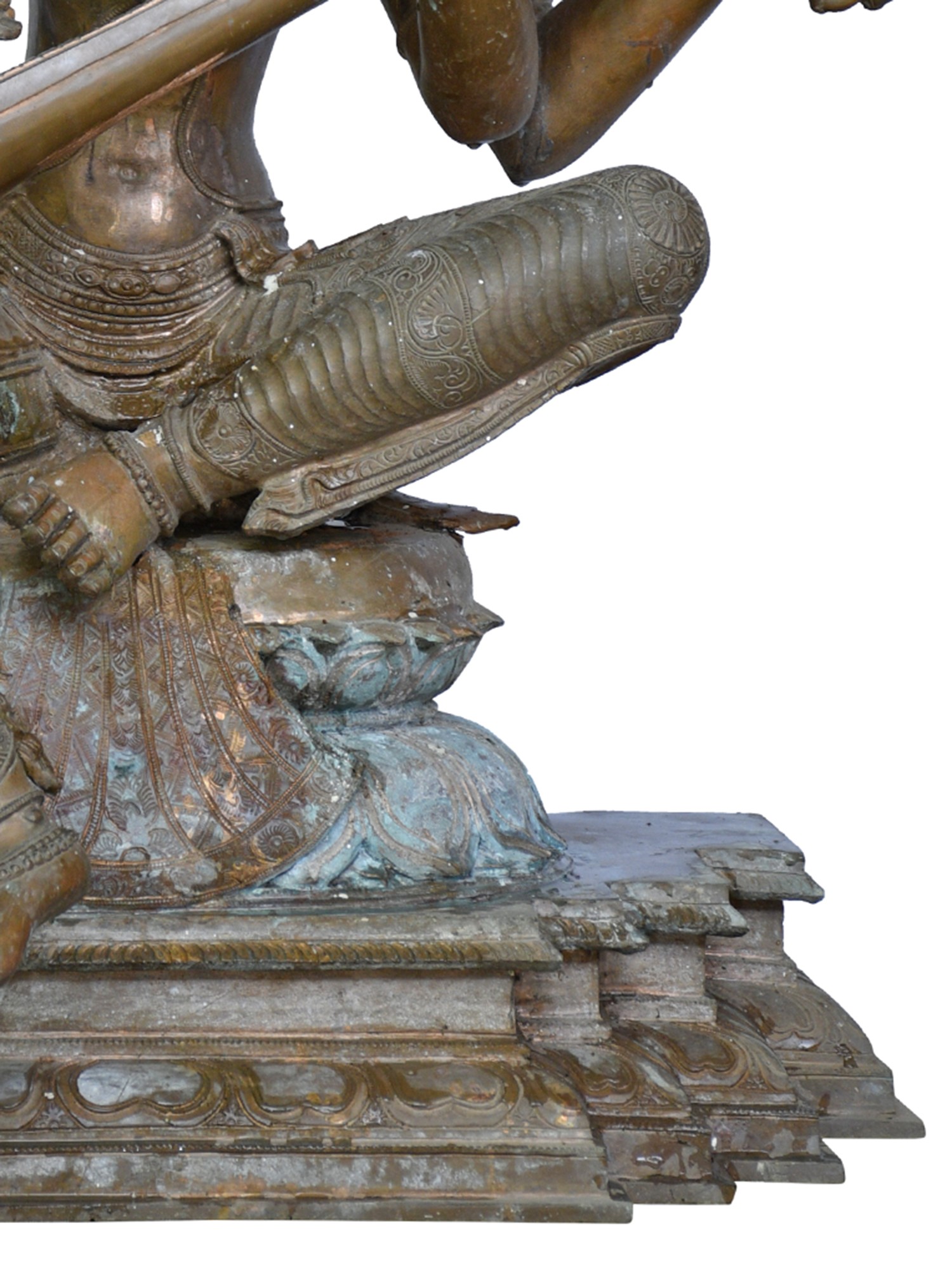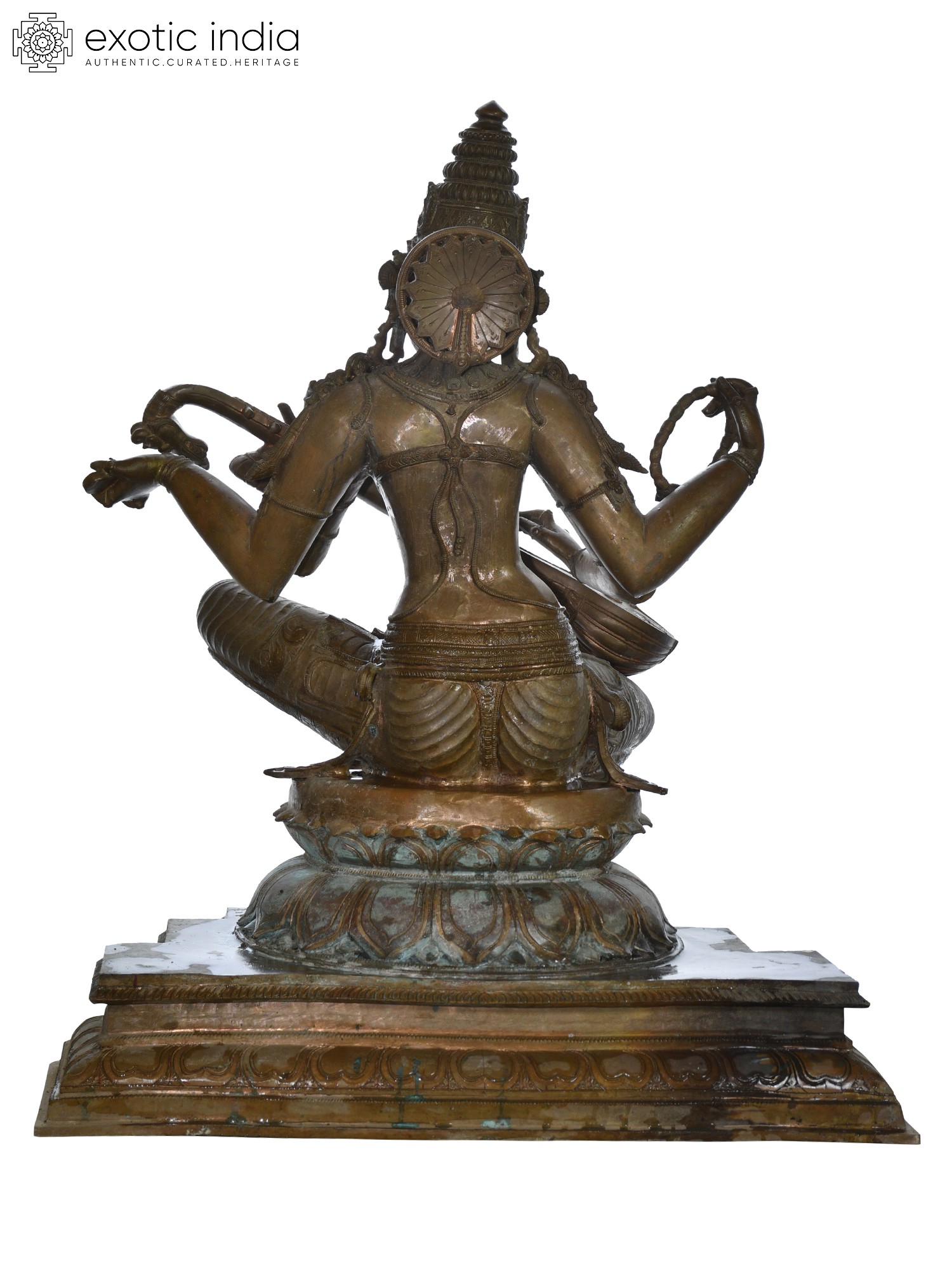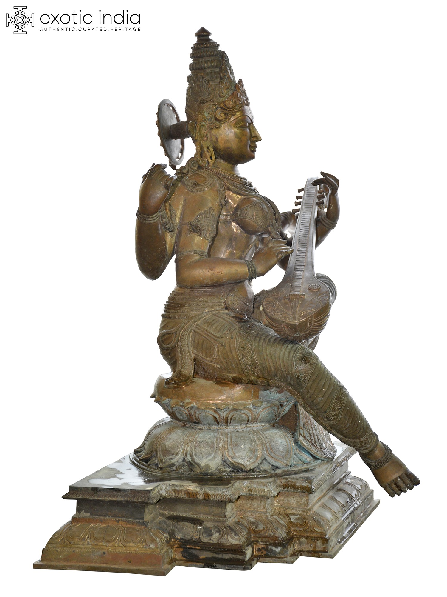 This magnificent statue captures the essence of Goddess Saraswati, the celestial patron of knowledge, music, art, and wisdom. Rendered in solid copper, the sculpture stands as a testament to timeless artistry and spiritual devotion. Saraswati, often depicted as 'Veena Vadini' (one who plays the Veena), is shown in her characteristic posture, fingers poised to create enchanting melodies that resonate with the divine. Her serene countenance, adorned with intricate jewelry and a majestic crown, exudes an aura of profound peace and intellectual brilliance. The traditional cross-legged seated position, resting upon a beautifully detailed lotus pedestal and layered platform, signifies her elevated status and calm transcendence. The choice of solid copper for this artwork is significant. Copper, in various ancient traditions, is associated with purity, conductivity, and the channeling of divine energies. Its inherent warmth and malleability allow for the creation of such detailed and evocative representations, ensuring that every curve of the Veena, every fold of her divine garment, and every subtle expression on her face is rendered with remarkable precision. The patina developed over time on this copper statue speaks of its age and the reverence it has garnered, adding a depth and character that synthetic materials cannot replicate. ––––––––––––––––––