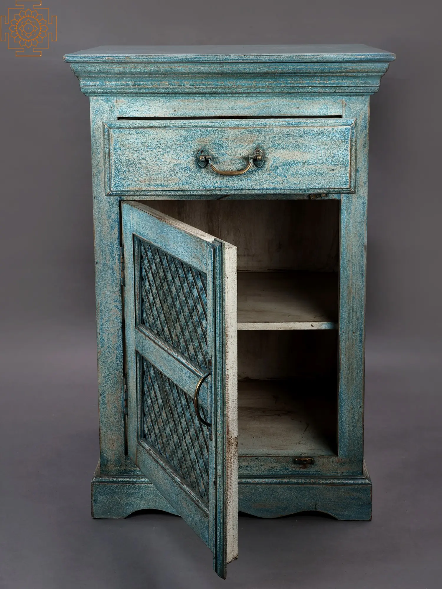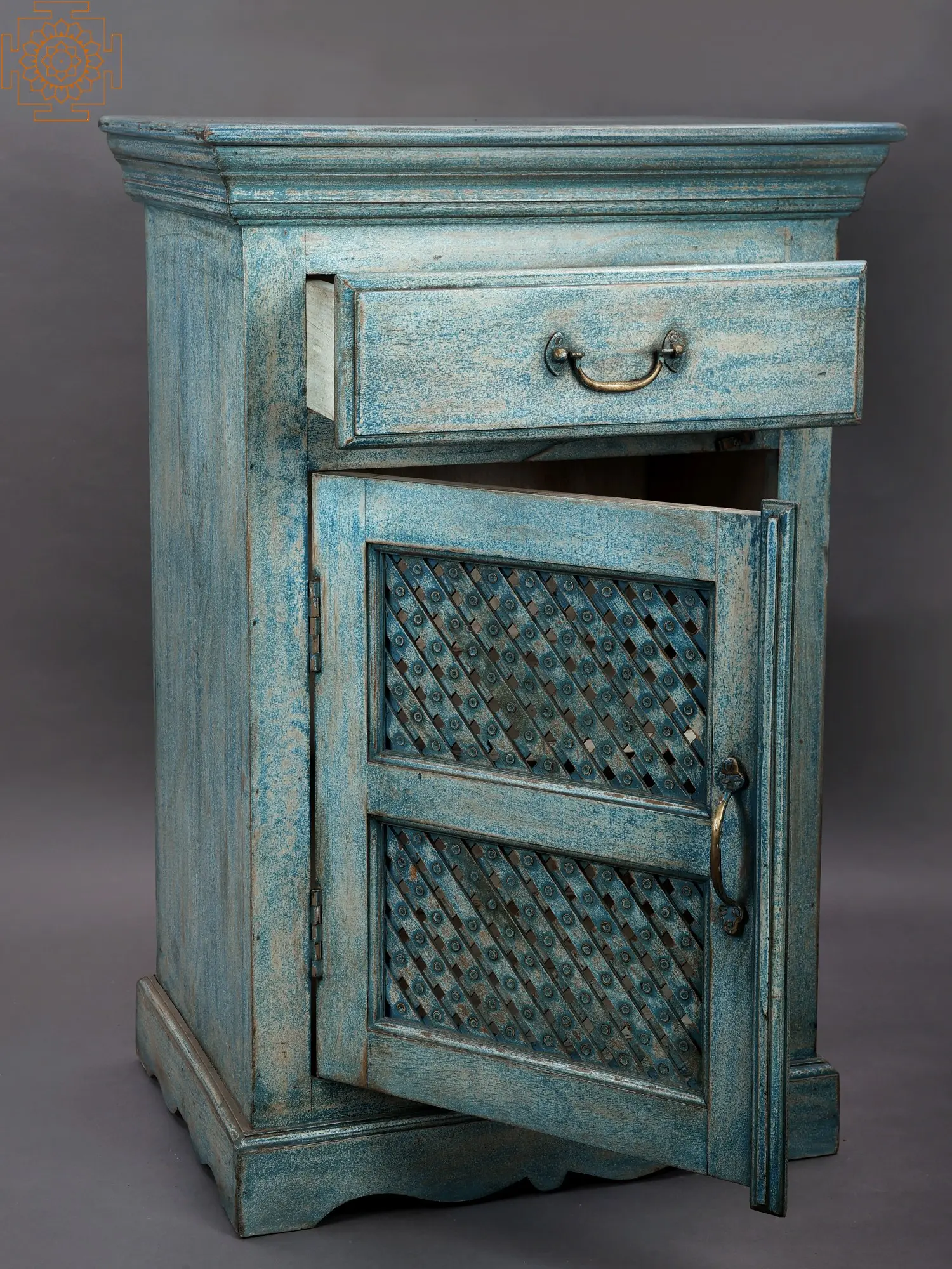 The presence of the symbol adorning the top left corner of the cabinet adds a layer of profound cultural significance. This particular emblem, often associated with mandalas or sacred geometry, symbolizes wholeness, cosmic harmony, and spiritual elevation. Its inclusion suggests a piece that is not merely functional, but also imbued with a sense of purpose and connection to something greater. In ancient traditions, such symbols were integrated into daily life, adorning tools, homes, and temples to invite blessings and maintain balance. This cabinet, therefore, offers not just storage, but a touch of sacred geometry to your personal sanctuary, a reminder of the interconnectedness of all things and the beauty that can be found in both the divine and the mundane. The single drawer, crowned with an elegant pull, offers a practical space for smaller items, while the main cabinet behind the lattice door provides ample room for larger possessions, all housed within an object of exceptional beauty and symbolic depth.