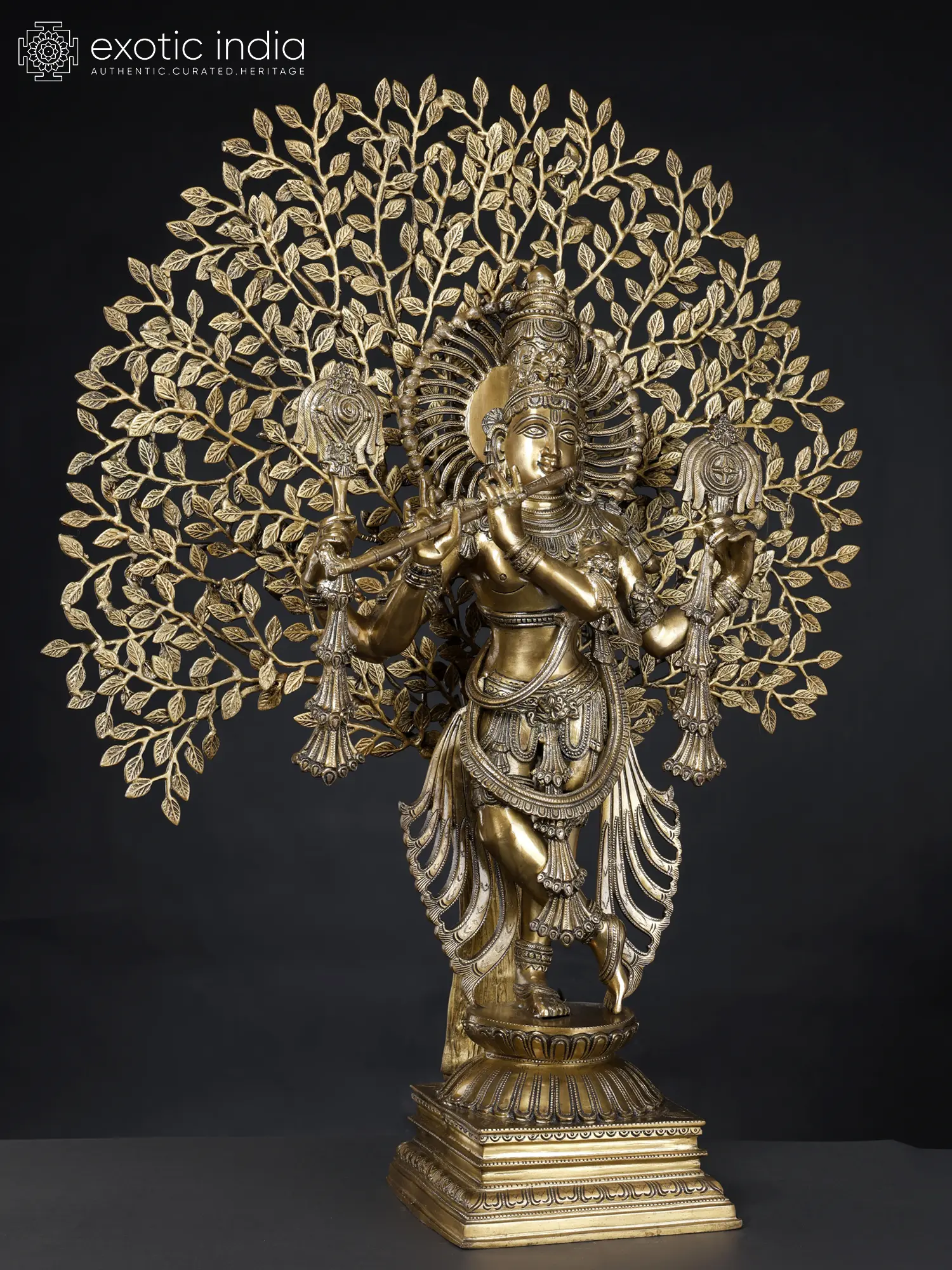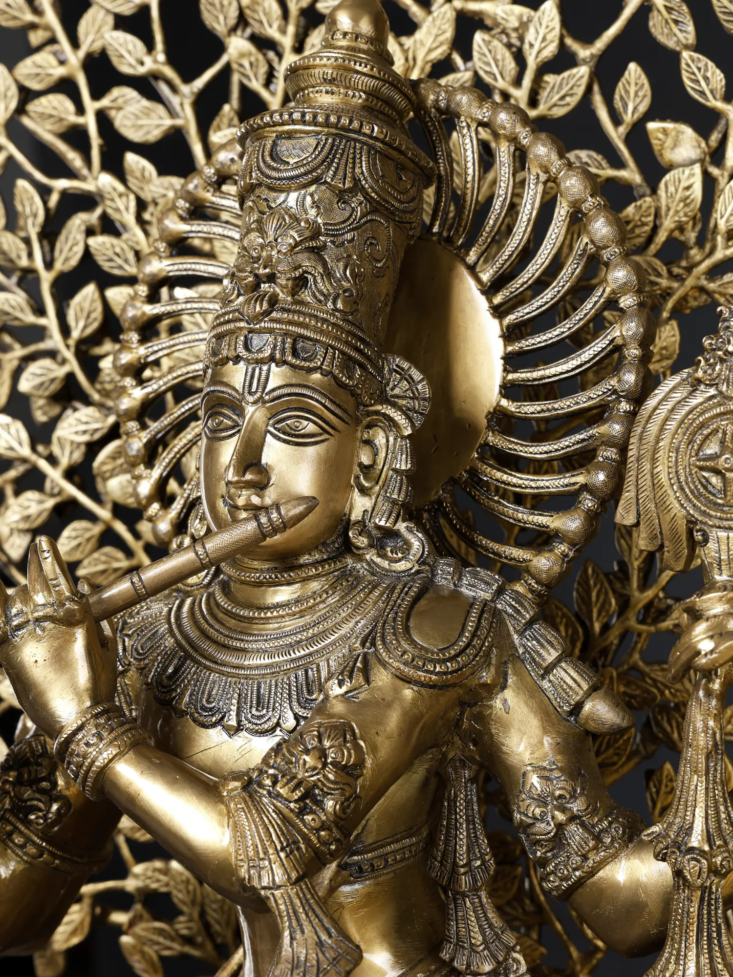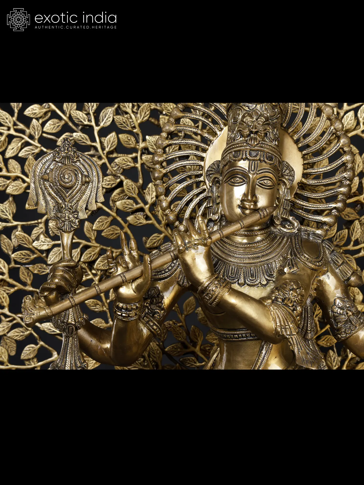 This magnificent brass sculpture captures a divine moment, portraying Lord Krishna in his enchanting form as the divine flutist. Standing tall and regal, Krishna is depicted in a characteristic pose, his fingers gracefully poised over the flute, ready to release a melody that has captivated the hearts of devotees for millennia. Behind him, a sprawling tree, intricately detailed with countless leaves and branches, forms a majestic canopy. This is no ordinary tree; it evokes the symbolism of the Kalpavriksha, the mythical wish-fulfilling tree of Hindu mythology, believed to grant all desires and sustain life itself. The interplay of light and shadow on the polished brass accentuates the divine aura of the Lord and the intricate craftsmanship of the tree, creating a breathtaking visual spectacle.