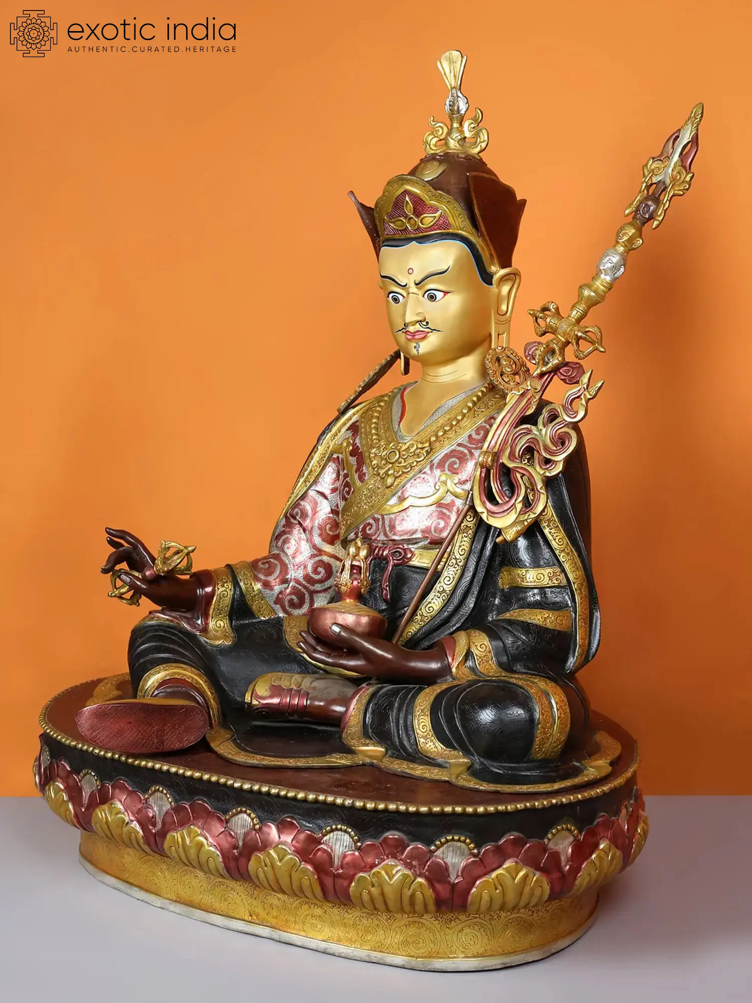 Guru Padmasambhava or Rinpoche is the seminal venerable one in Himalayan Buddhist tradition, where a connection with the Guru or teacher is crucial in the attainment of salvation. The gilded copper statue of Padmasambhava you see here is draped in a splendid multi-toned robe, ornaments, and a distinctive Tibetan cap and holds a skull cup, staff, and Vajra.