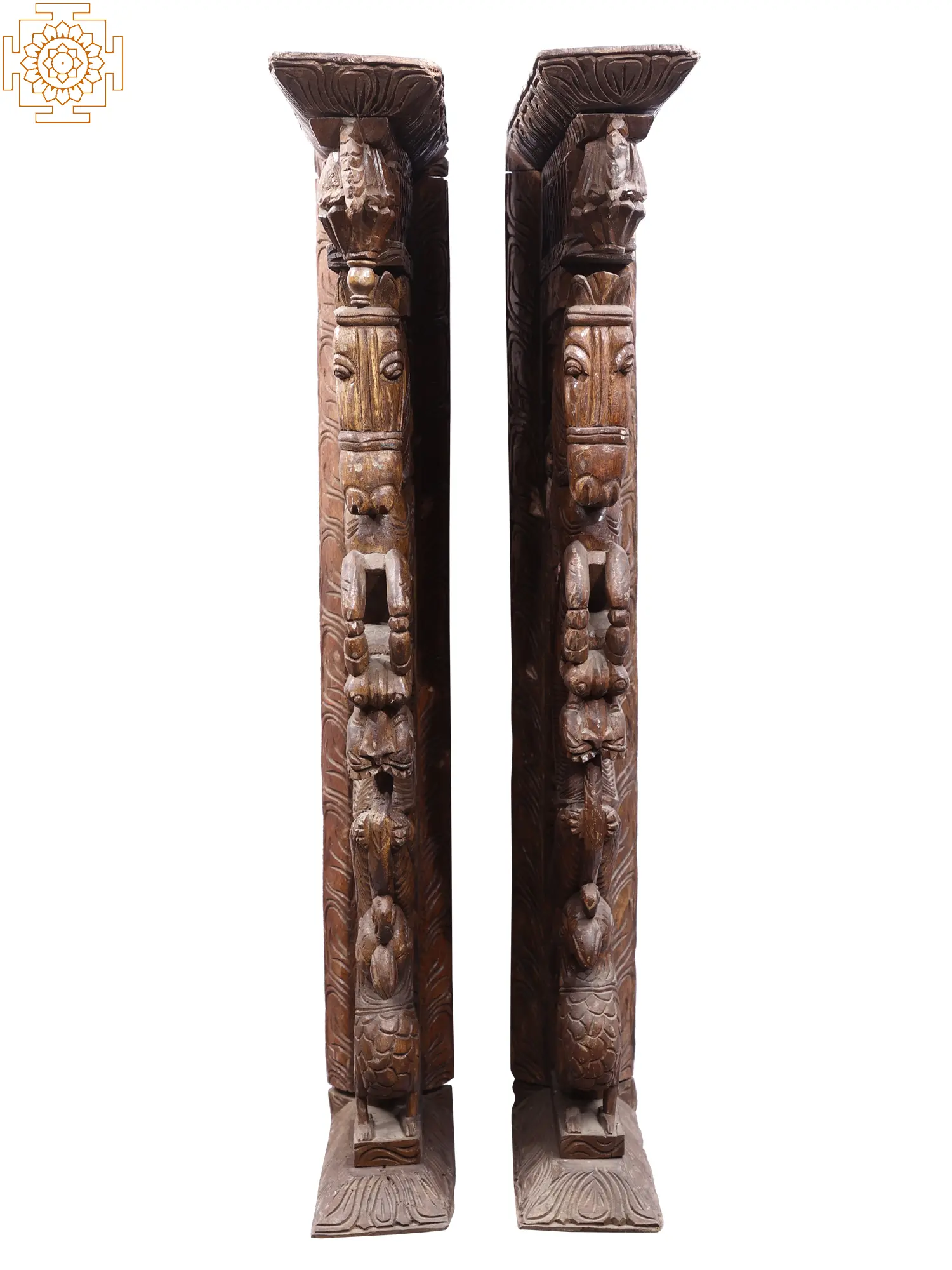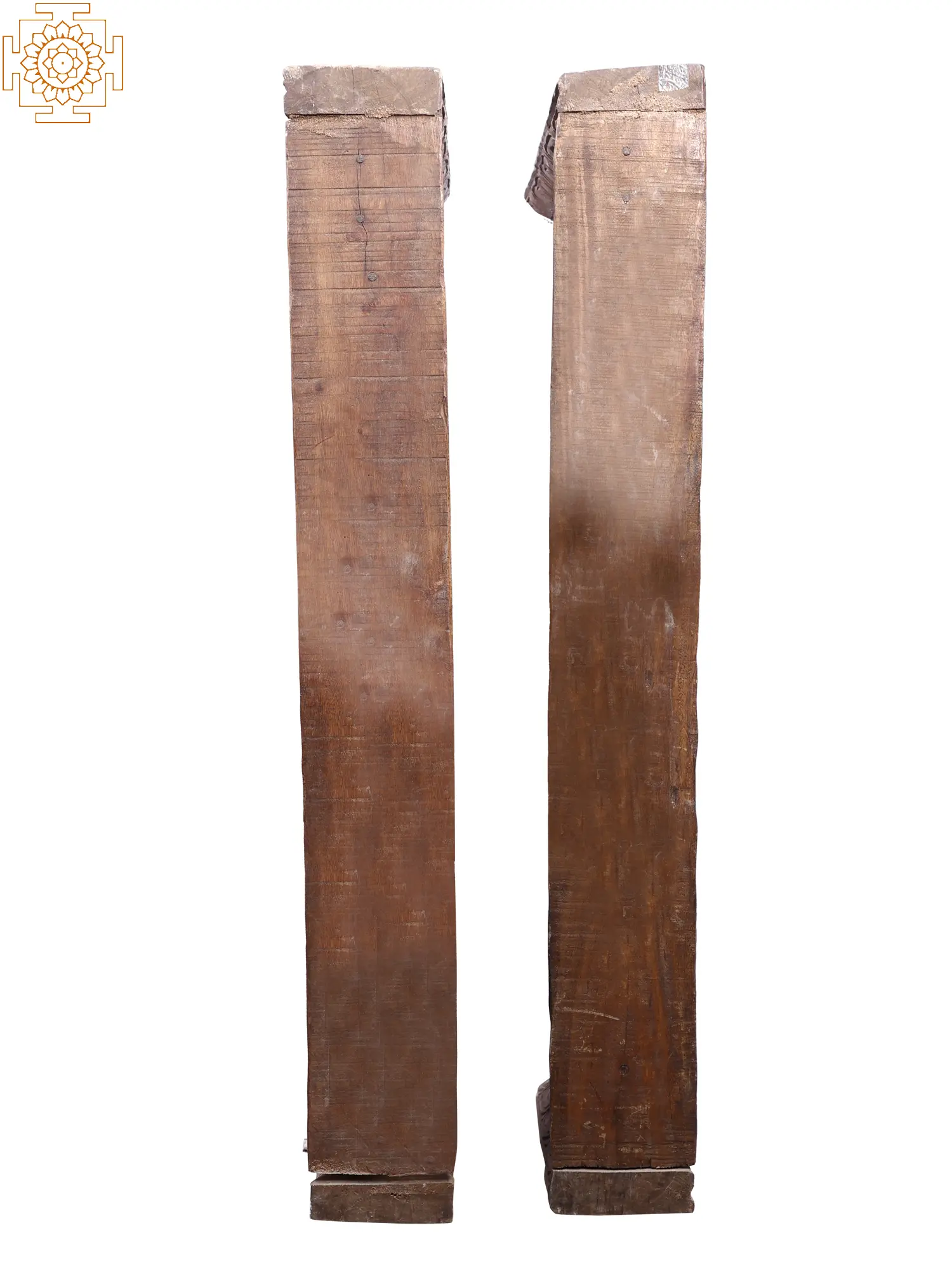Beneath the warrior and his steed, a series of mythical creatures unfolds, adding layers of depth and wonder to the carvings. The serpent-like beings, with their intricate scales and powerful forms, often represent cosmic forces, guardians of hidden knowledge, or elemental spirits. They can be seen as protectors of sacred spaces or symbols of renewal and transformation. The presence of peacocks, with their resplendent plumage, introduces an element of beauty, grace, and prosperity. In Indian mythology, the peacock is associated with various deities, including Saraswati, the goddess of wisdom, and Lord Krishna. They are also seen as protectors and omens of good fortune. The combination of these creatures within the design evokes a sense of a protected, vibrant, and sacred environment, reminiscent of the elaborate gateways and temple art found in ancient civilizations. These brackets evoke the spirit of traditional Indian craftsmanship, where every carving tells a story and imbues the object with spiritual significance. They can serve as dramatic architectural accents, framing doorways, windows, or alcoves, or as standalone statement pieces that bring a touch of the exotic and the profound into your home. Their generous size ensures they will be a focal point, sparking conversation and inspiring imagination. Add these majestic wooden brackets to your collection and invite a piece of ancient artistry and rich mythology into your modern living space.