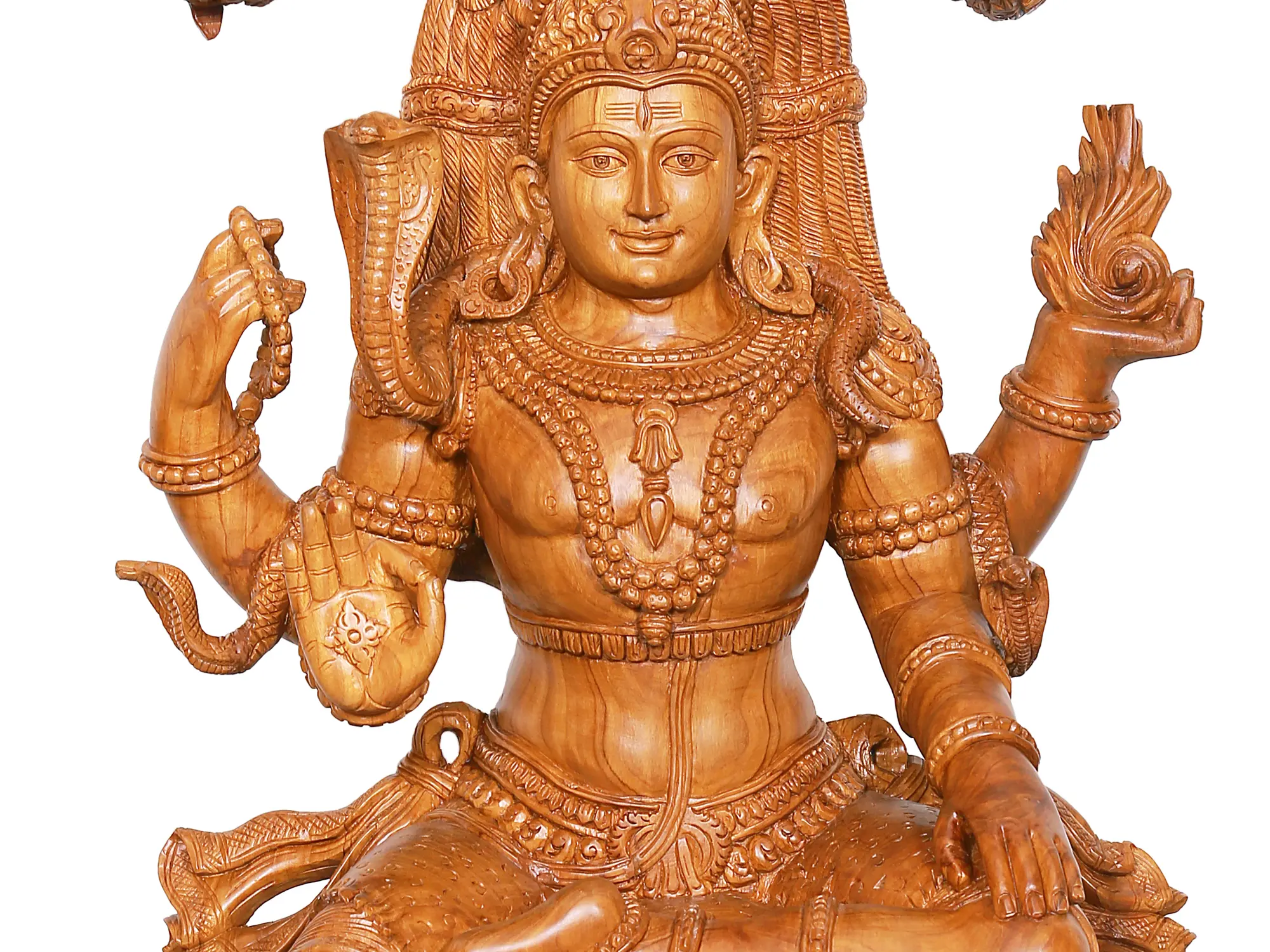 The Dakshinamurti Shiva that you see on this page is made from teakwood. It has a natural, bright ochre colour. The characteristic texture of the medium is particularly evident in the bare-skinned parts of the divine anatomy, such as the belly, the foreleg, and the smooth contours of the face.