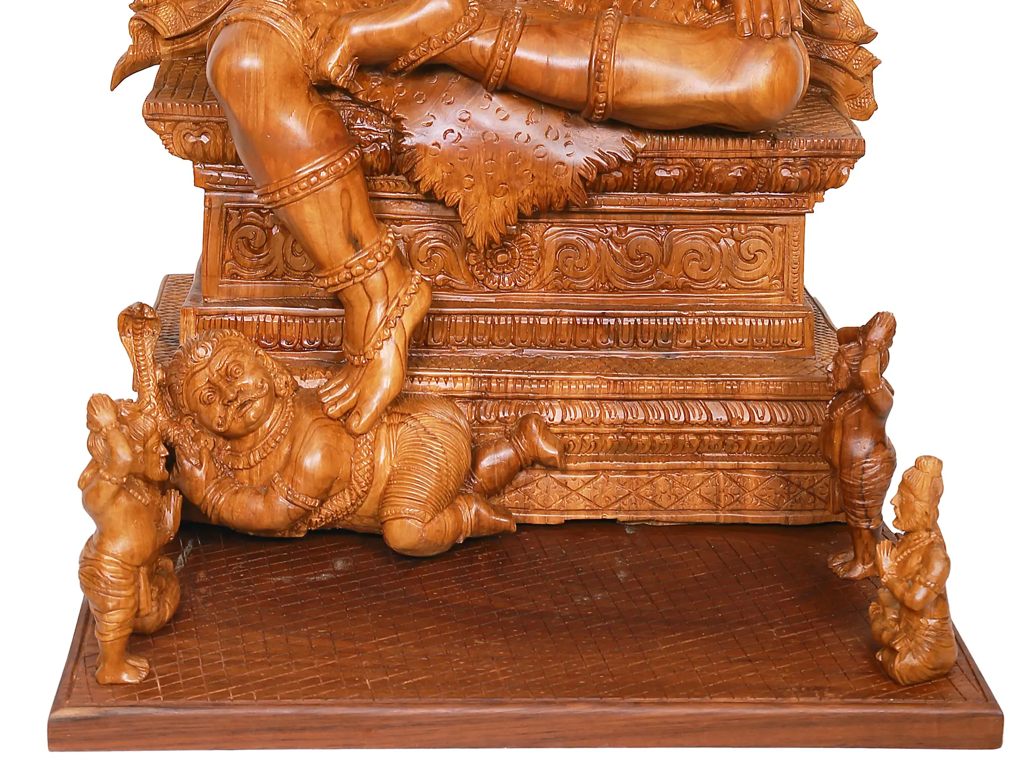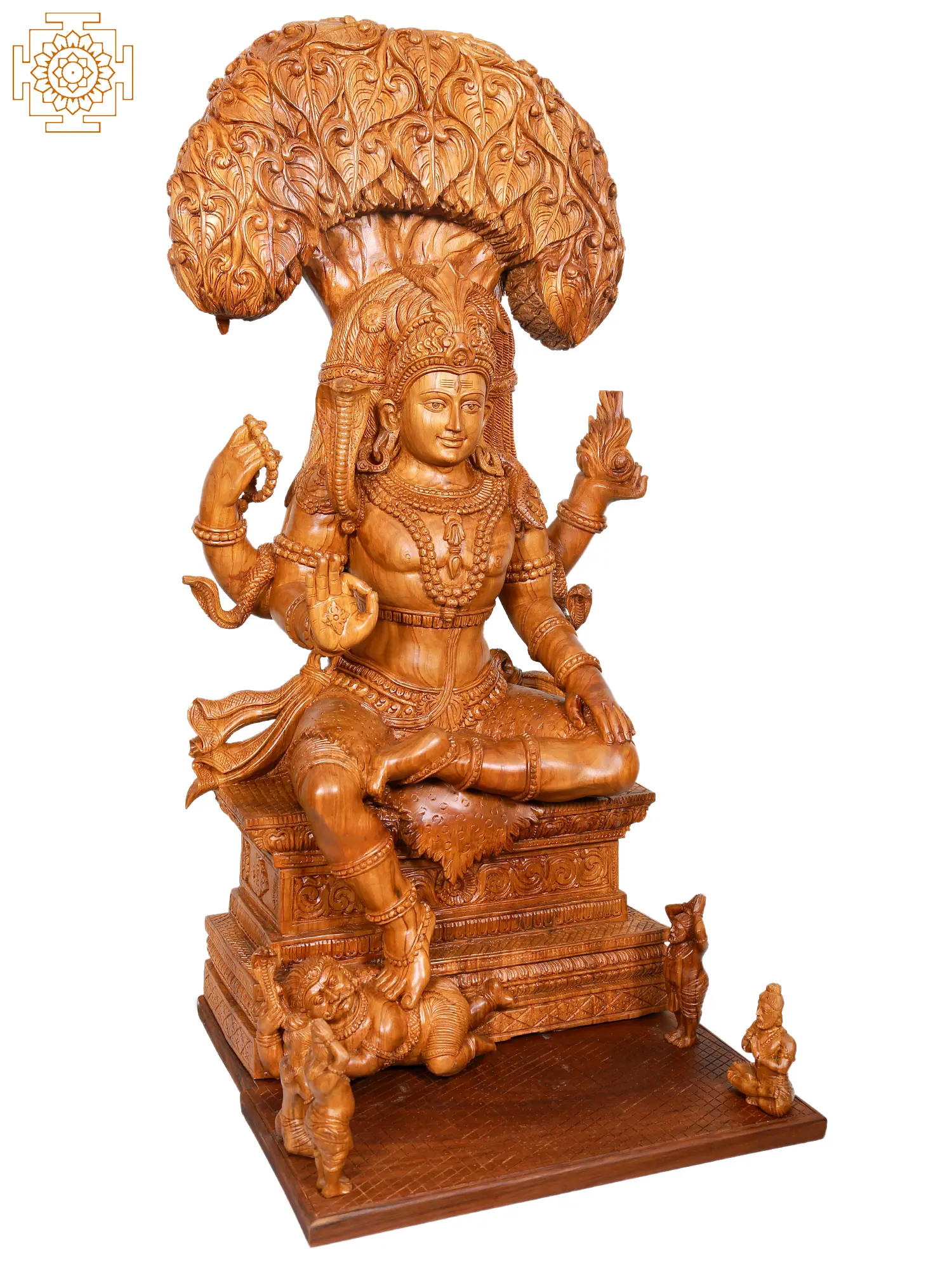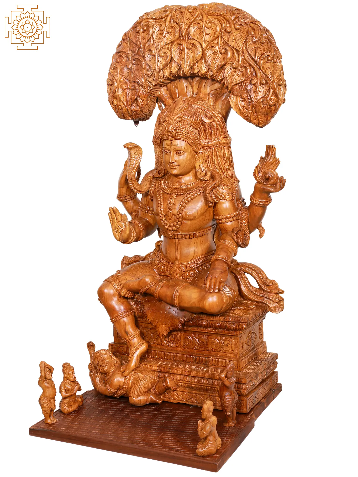 This magnificent Dakshinamurthy Shiva statue, meticulously carved from premium teakwood, stands as a profound representation of Lord Shiva in his aspect as the divine teacher and the embodiment of knowledge. Dakshinamurthy, meaning "South-facing teacher," is revered as the dispeller of ignorance and the bestower of spiritual wisdom. In Hindu mythology, Shiva is often depicted in a meditative pose, surrounded by nature, symbolizing his detachment from the material world and his profound connection to the cosmic order. This exquisite carving captures that serene yet powerful presence, making it a captivating centerpiece for any sacred space or discerning collection. ––––––––––––––––––