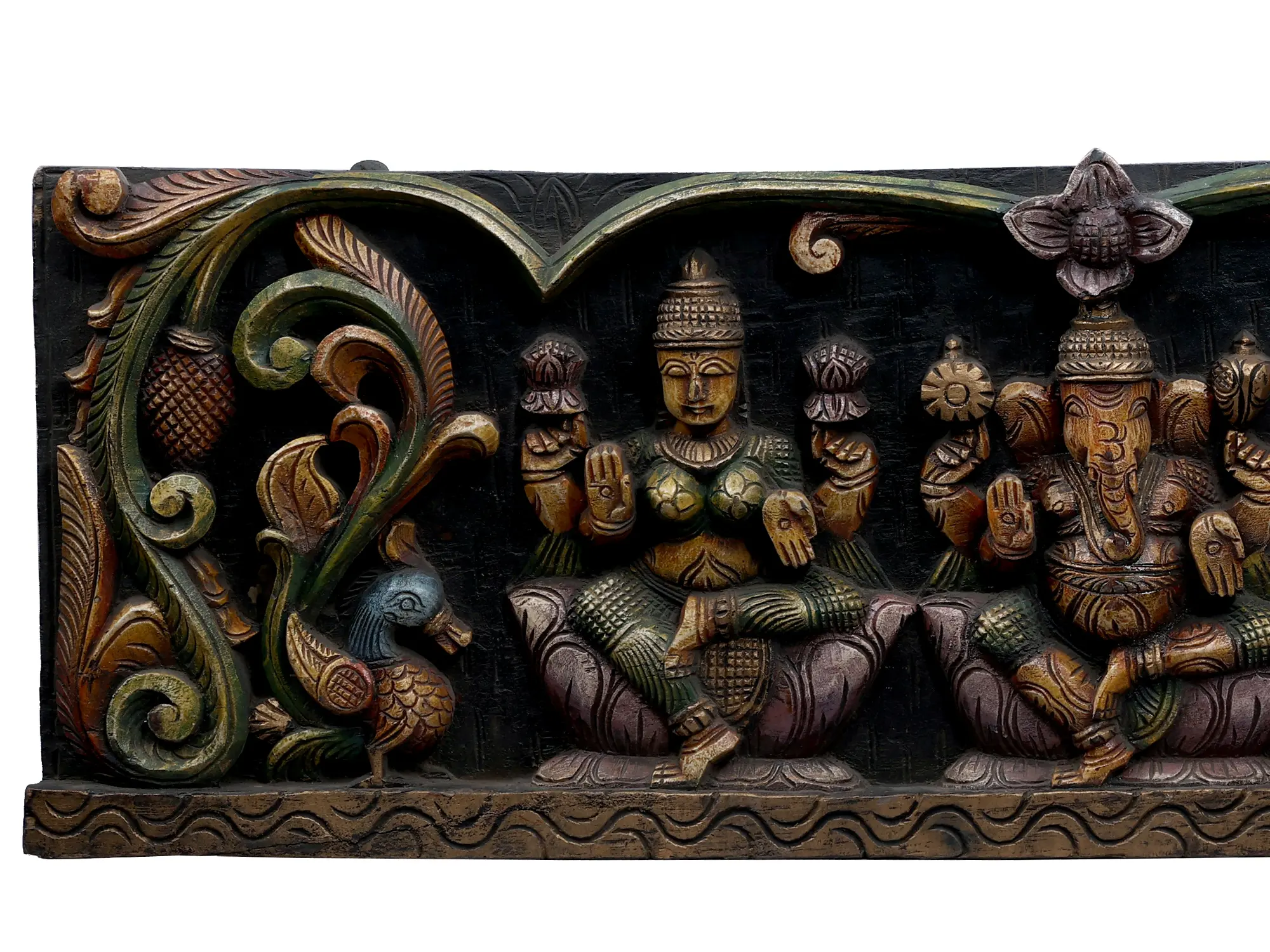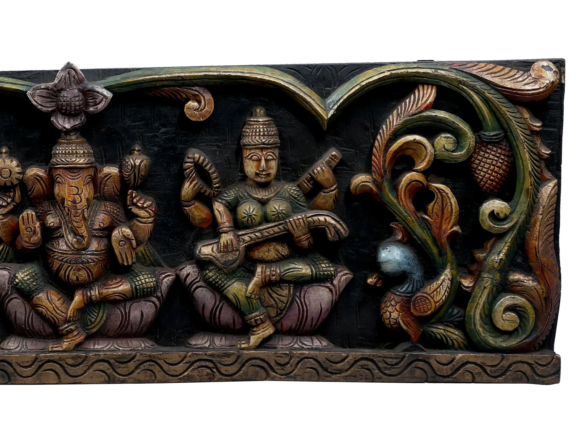 Within the vine-framed space, the sacred statues of Lord Ganesha, Goddess Saraswati, and Goddess Lakshmi are placed harmoniously. Each deity represents distinct qualities, Ganesha for wisdom, Saraswati for knowledge, and Lakshmi for wealth. The combination of intricate carvings and vibrant colors enhances the divine presence, turning the wall panel into a visual masterpiece that not only beautifies the space but also conveys spiritual significance. This fusion of Thamampatti artistry with sacred symbolism makes the Large Wooden Sitting Lakshmi Ganesha Saraswati Wall Panel a testament to the cultural richness and craftsmanship of Indian artistic traditions.