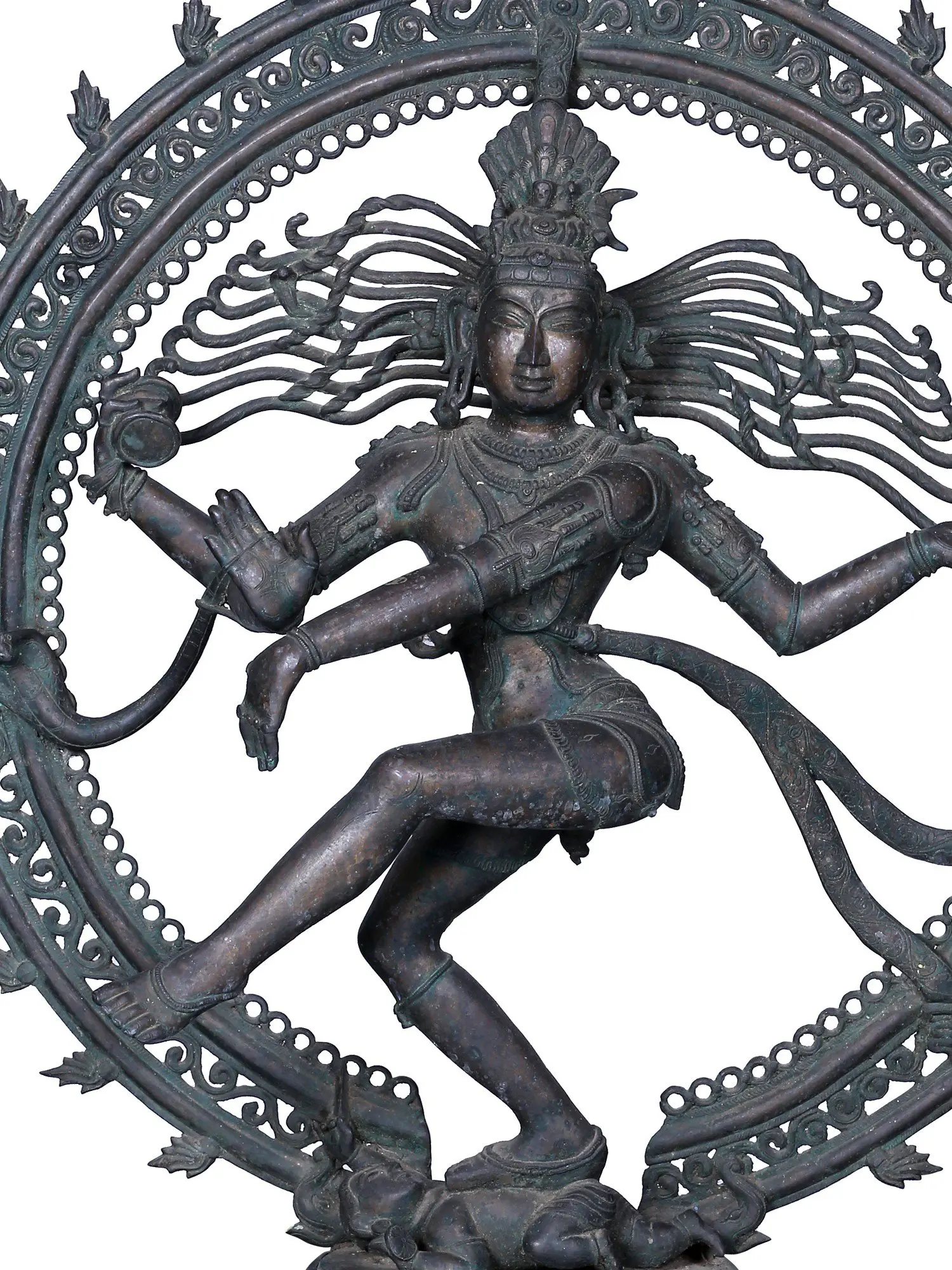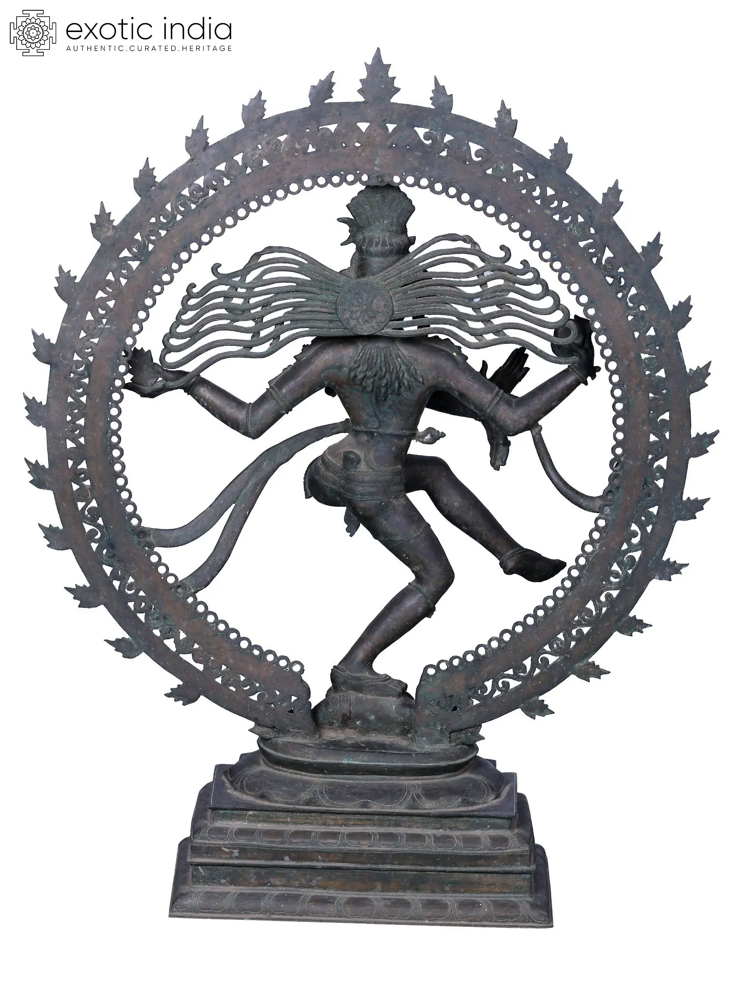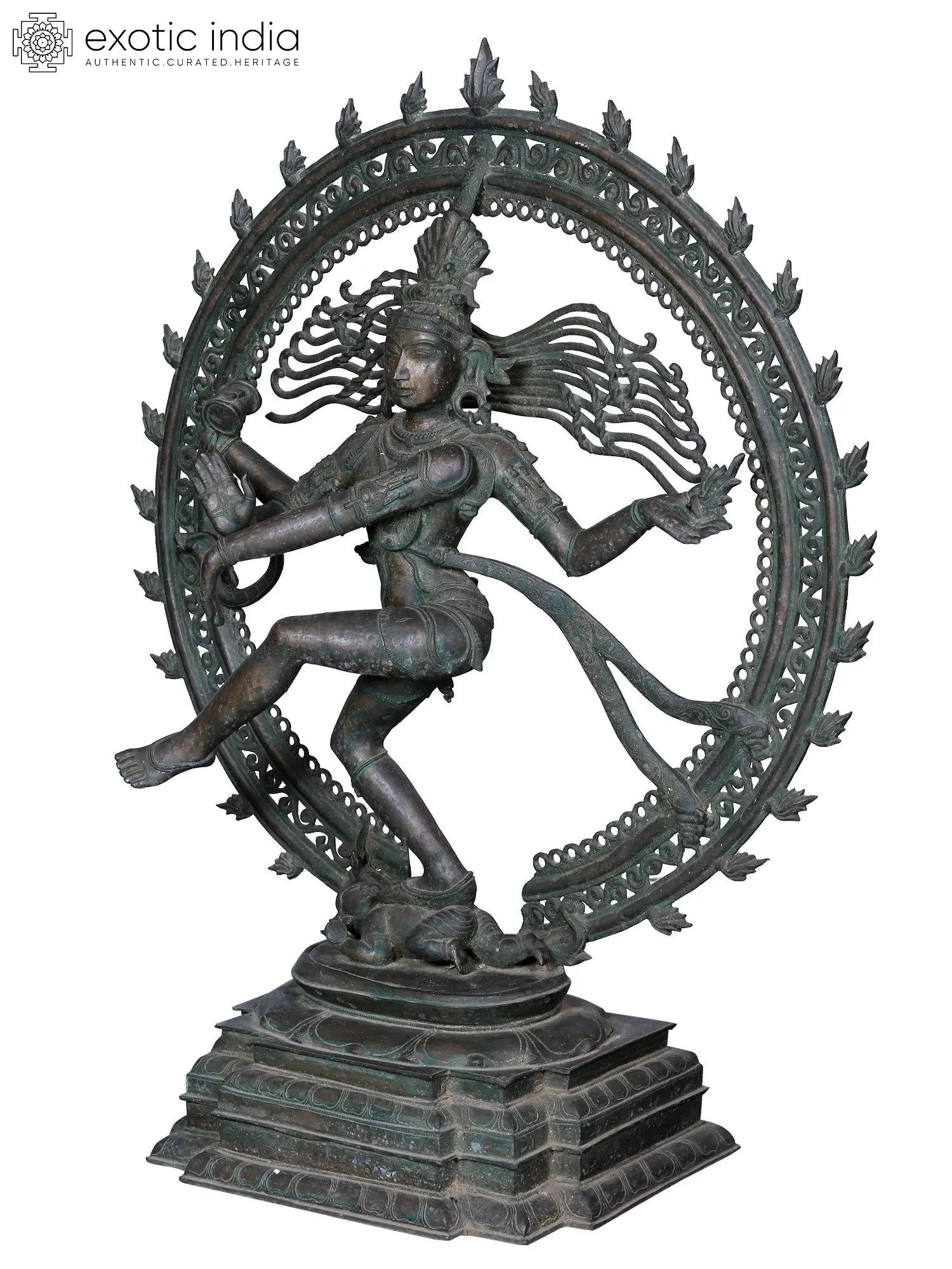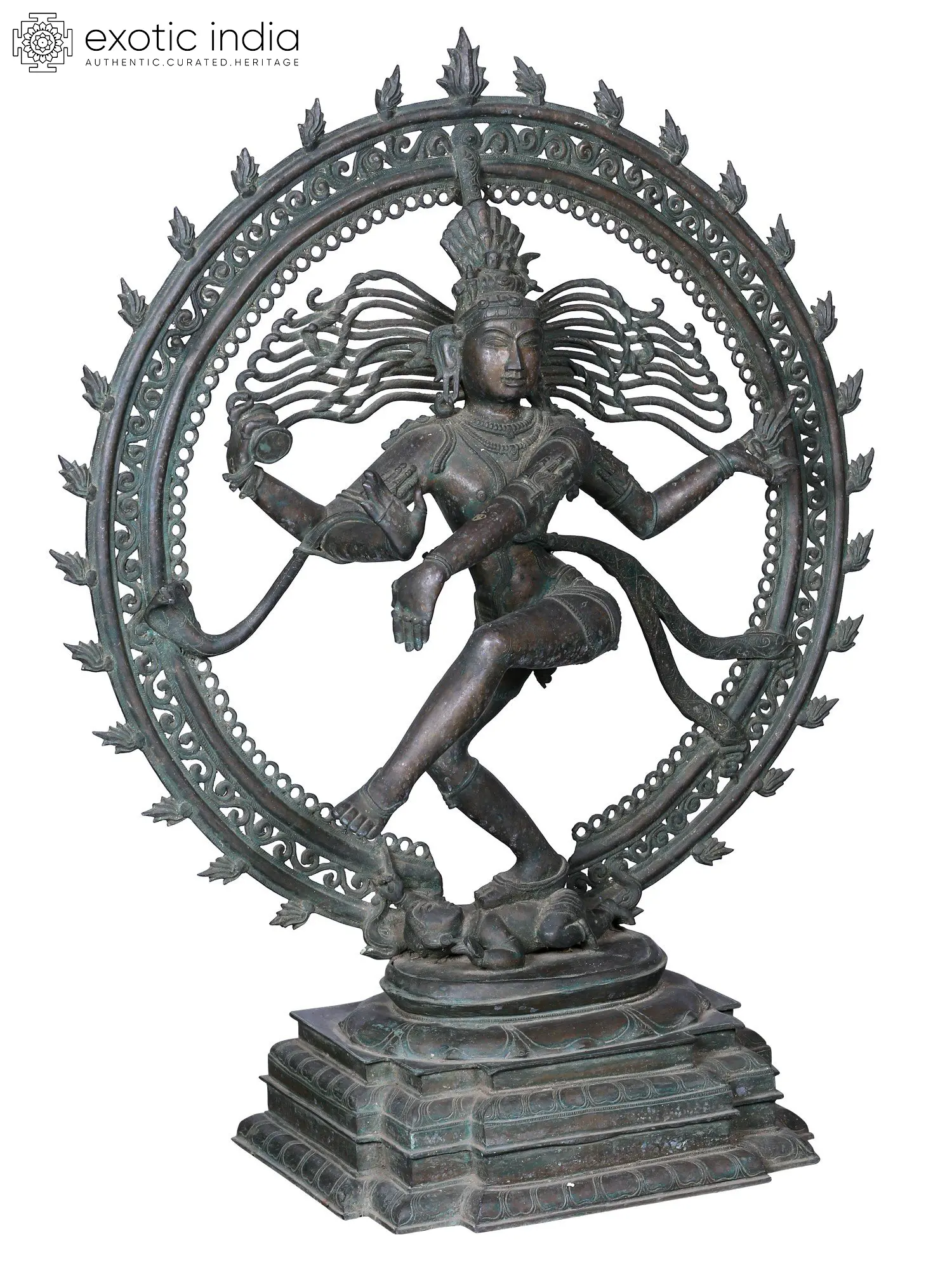 This breathtaking Nataraja sculpture in Panchaloha bronze from Swamimalai is a stunning embodiment of Lord Shiva's cosmic dance, the Ananda Tandava that captures the Dancing lord’s dreadlocks flying free in the cosmic dance, resembling the sun's radiant rays.