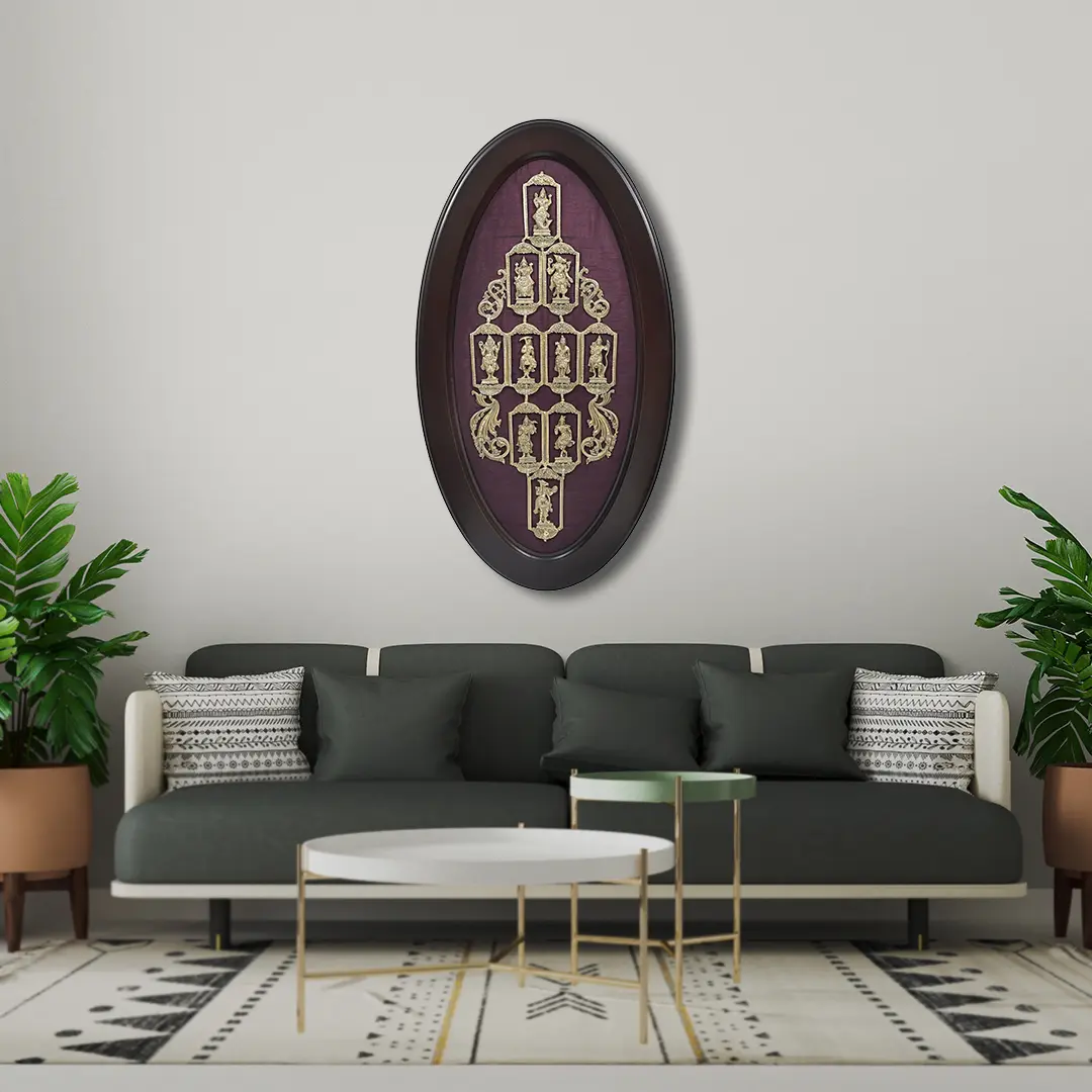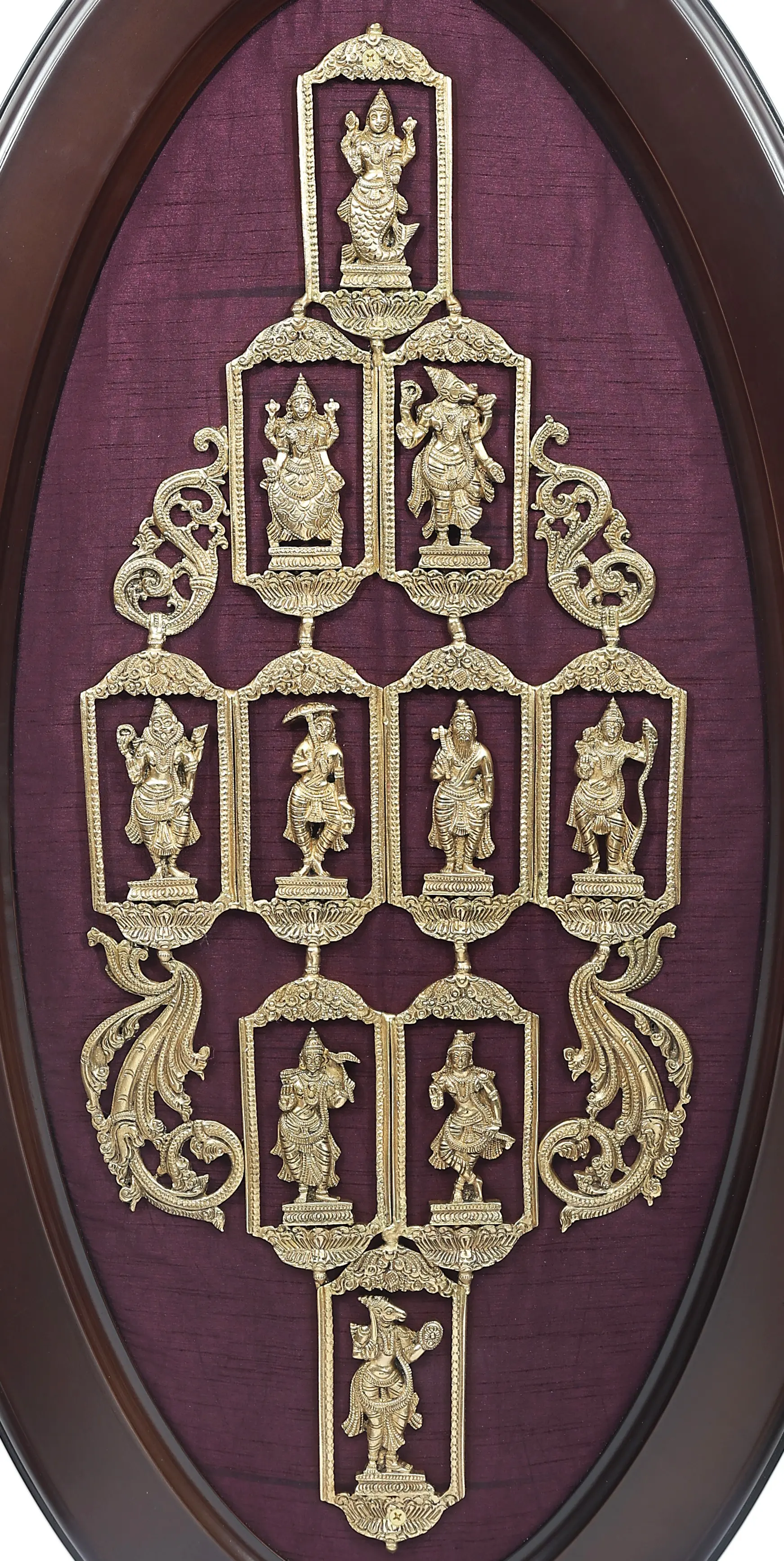 Certain situations cause you to reconsider the normal course of events. This Oval Framed Dashavatara Wall Hanging in Brass is a masterwork that forces the beholder to ask if they have seen something like this before or if it is feasible for any artist to recreate this treasure of an art piece again. This piece is one of a million that combines the ordinary and the uncommon to create something unique. This intricately crafted brass wall hanging showcases the ten incarnations of Lord Vishnu, the Dashavatara, enclosed within an elegant oval frame with a purple-cloth background.