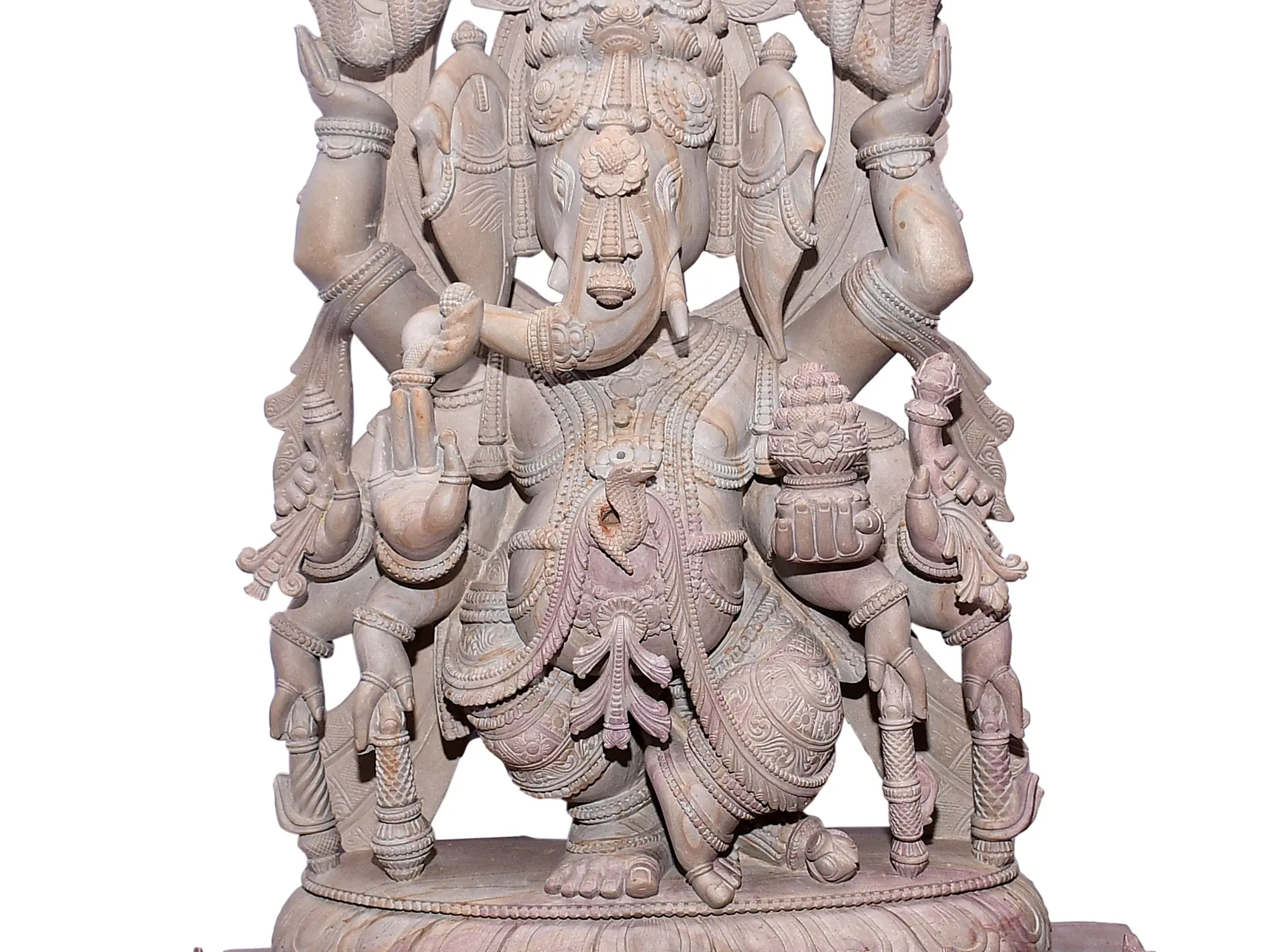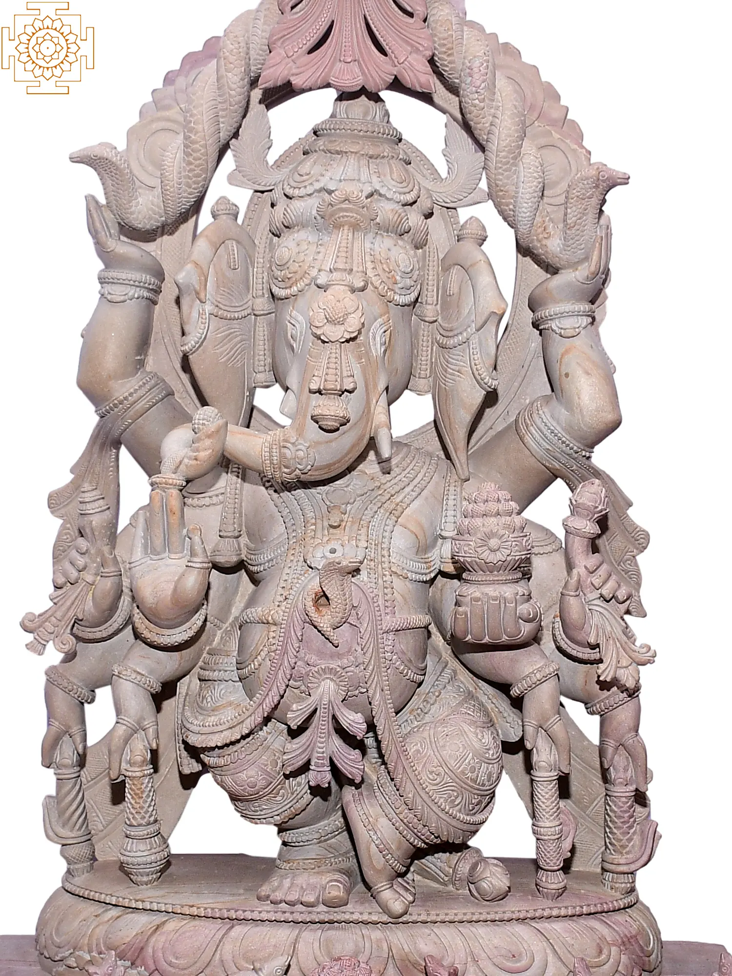 Cast in the heavenly shades of the pink stone, Lord Ganesha appears in his rather inimitable form- Holding his own Prabhamandala with a Kirtimukha (face of flory), he also is seen dripping onto the pillars as the source of retaining the cosmic cycle and doing away with the obstructions in the symbolic sense. Assuming his own Ashtabhuja (eight-armed) avatar, his feet are positioned in Kunchita padam as he stands on the lotus disc! At his feet offered are his favorite bhoga - laddoos; while the Mushakas (mice) join their hands together in his veneration.