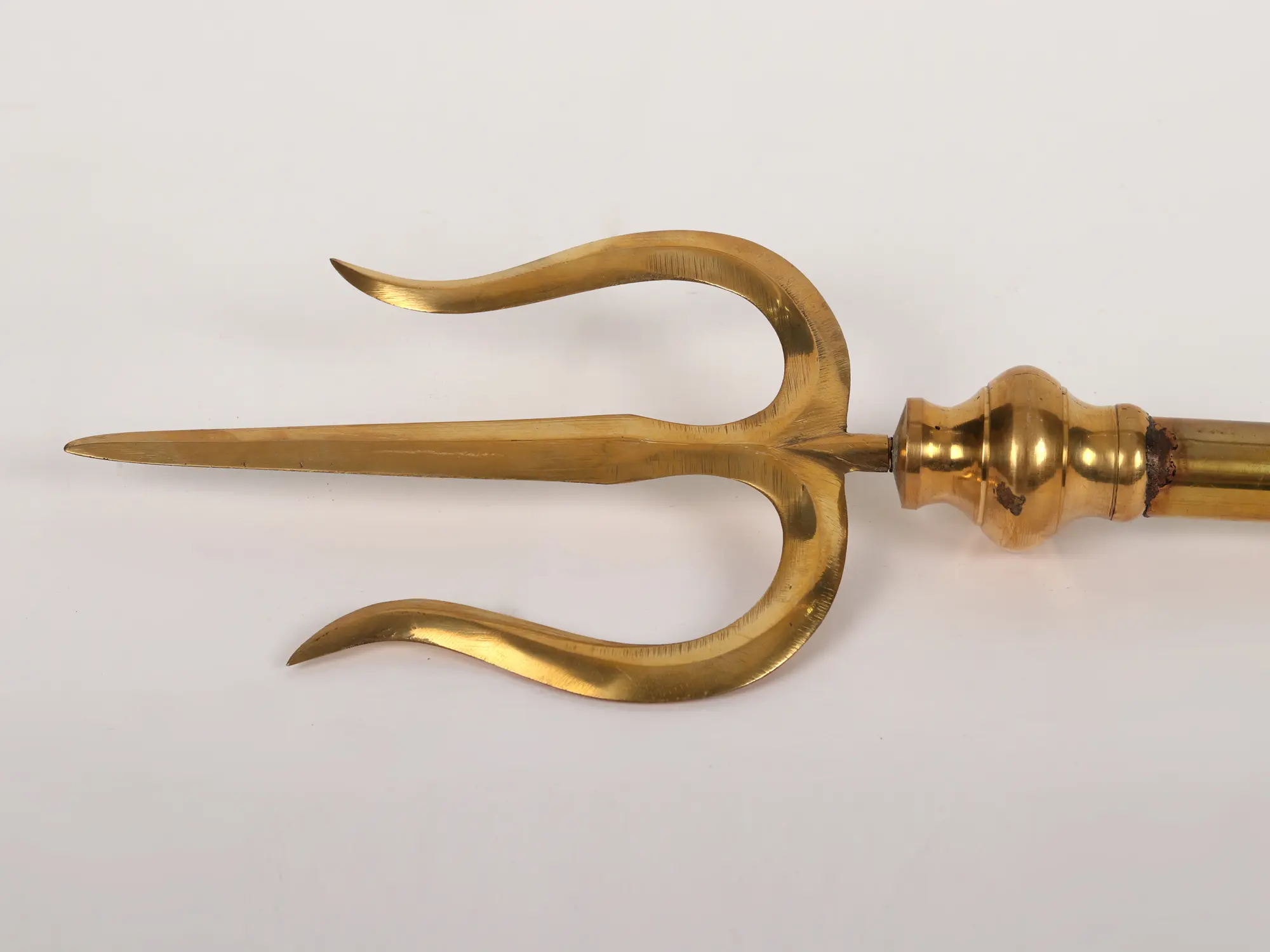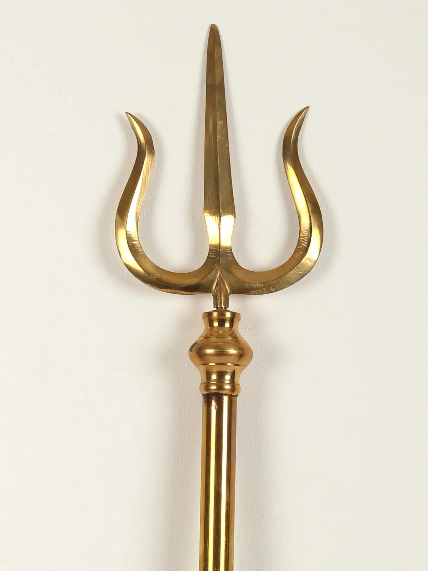 The Brass Trishul is a powerful emblem, representing the divine trinity of Brahma, Vishnu, and Shiva. Each prong embodies a facet of existence: creation, preservation, and destruction. The central trident signifies Shiva, the cosmic dancer, and destroyer of illusions. As Lord of the dance, he keeps the universe in balance. The damaru drum and the flame in his hand symbolize rhythm and transformation, while the cobra entwined around the Trishul represents his mastery over fear and desire. This trishul is more than a sculpture; it's a reminder of life's intricate dance.