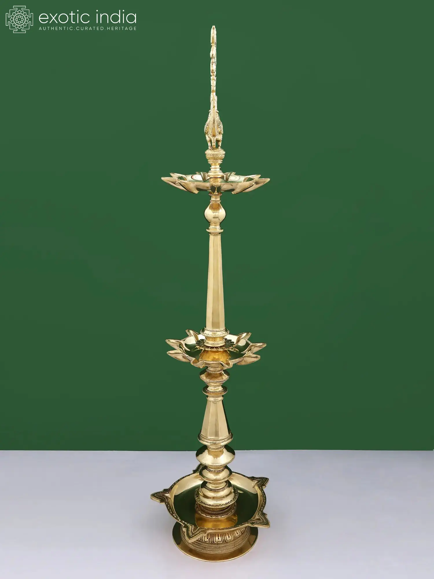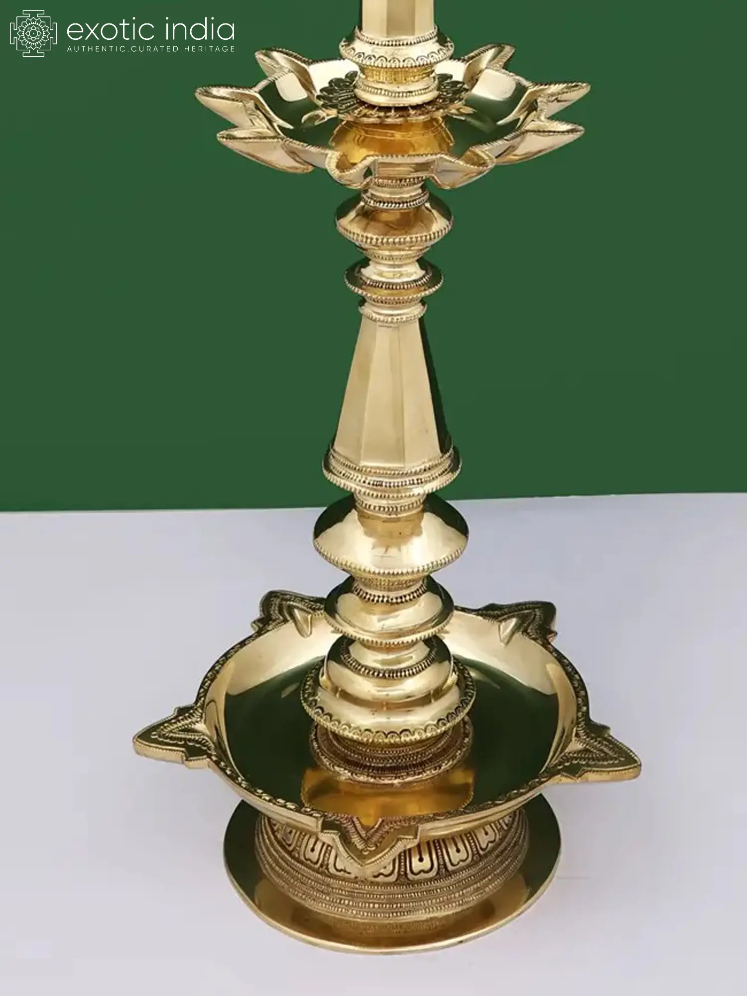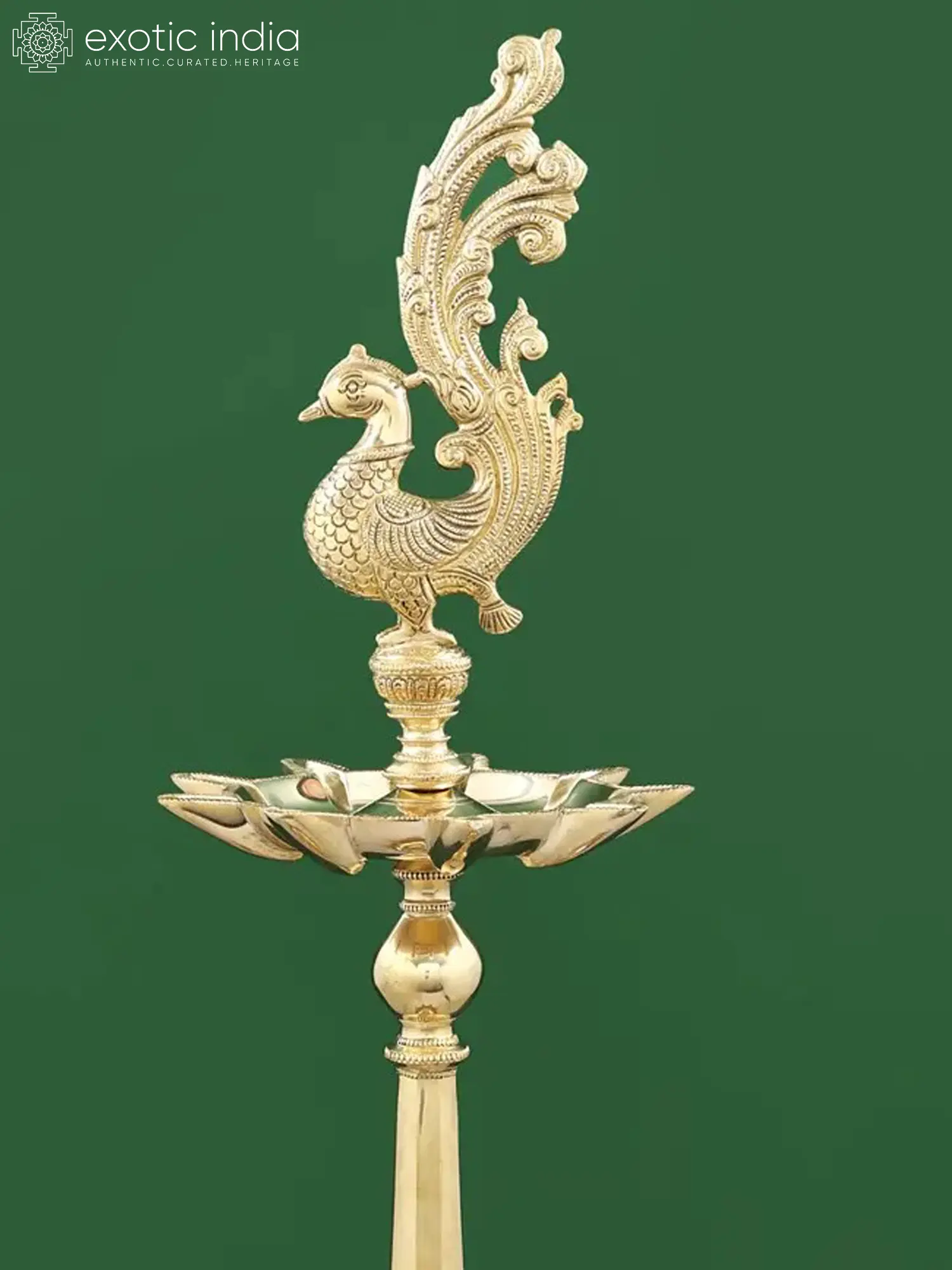 A Nachiarkoil lamp is another name for the Kuthu Vilakku, or Peacock Oil light. It draws its name from the village of Nachiyar Koli in Tamil Nadu, where the Pather (Kammalar) clan has been creating these lamps since ancient times. This brass lamp is a lovely Nachiarkoil light with a distinctive annam or peacock pattern on top. It is a three-layer columnar lamp with multi-wick lights. The basic support that runs through the layers of the lamp adds a simple beauty to the design. The lamp's overall image is very basic but majestic. This lamp, with its majestic and sturdy stand, represents self-illumination and harmony, as well as spiritual enlightenment.
