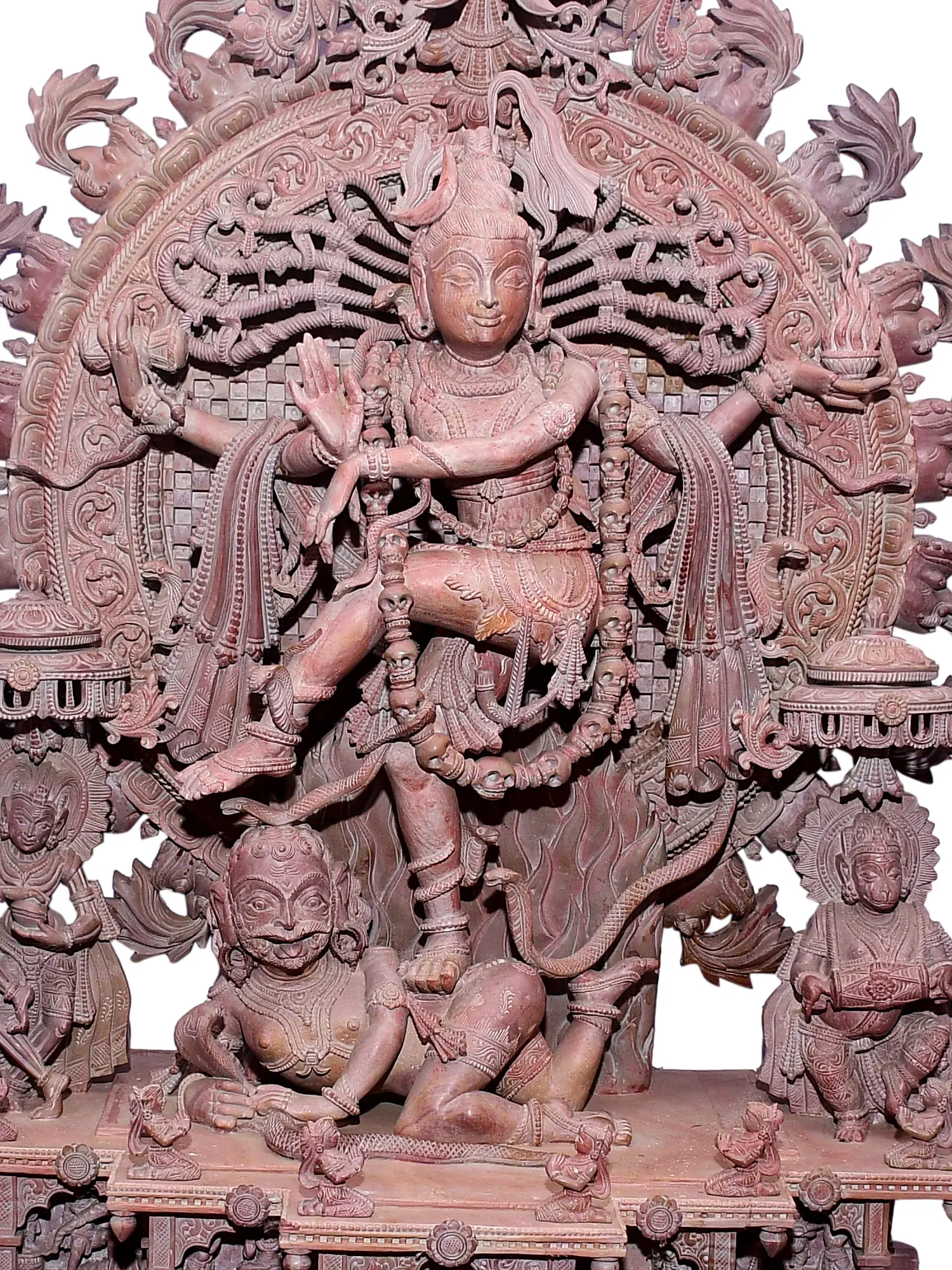 The King of Dancers, Nataraja is a form of the Hindu God Siva who is a well-known symbol in the West for Hinduism and Eastern mysticism. In this majestic statue made of pink stone, Nataraja is dancing with his right foot supported by Apasmara (demon of ignorance) and the left foot elegantly raised in absolute bliss. The river Ganga sits in his hair and a cobra uncoils from his lower, the crescent moon and a skull are on his crest. This is called Ananda Tandava, the dance of bliss. Lord Shiva dances within a circle of flames, symbolizing the continuous cycle of life, death, and rebirth. The dance represents the rhythmic movement of the universe and the divine energy that sustains it.