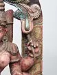 This magnificent wooden sculpture captures the awe-inspiring essence of the Goddess Kali, a powerful and complex deity in Hinduism, often depicted as a fierce manifestation of Devi, the supreme goddess. In this captivating portrayal, she is shown in the midst of her cosmic dance, a dynamic and energetic posture that signifies the cyclical nature of creation, preservation, and destruction. The intricate carvings and the rich patina of age speak to the deep spiritual significance and artistic mastery involved in its creation. The multi-armed form of the Goddess is a visual representation of her omnipresence and her ability to undertake numerous tasks simultaneously. Each hand is poised with intent, some holding symbolic implements, while others are in mudras (gestures) that convey blessings or protection. The serene yet powerful expression on her face, coupled with her fierce gaze, embodies the duality of her nature – the destroyer of evil and the protector of the righteous. Her adornments, intricately carved, suggest a regal bearing even in her most tempestuous form.