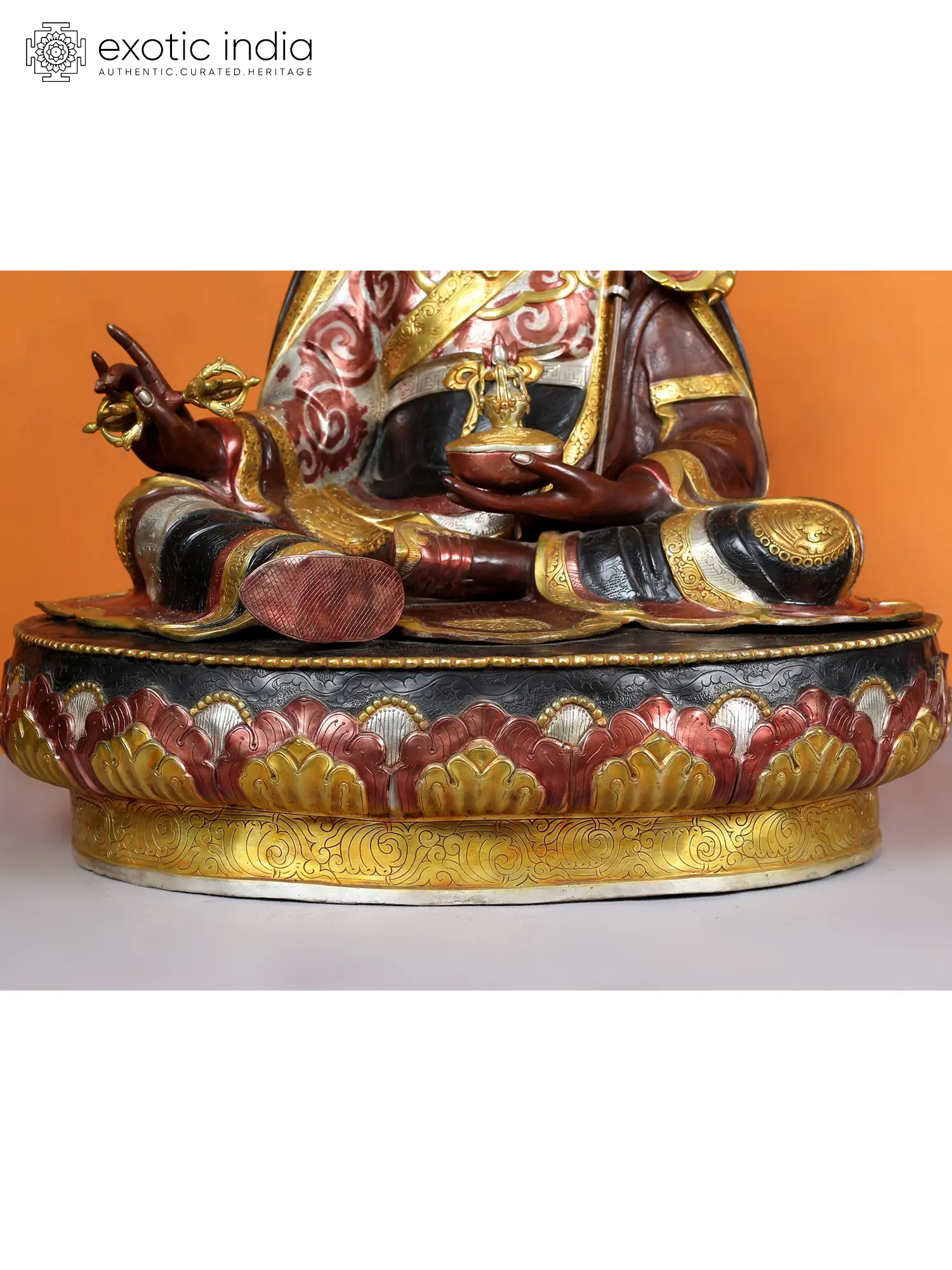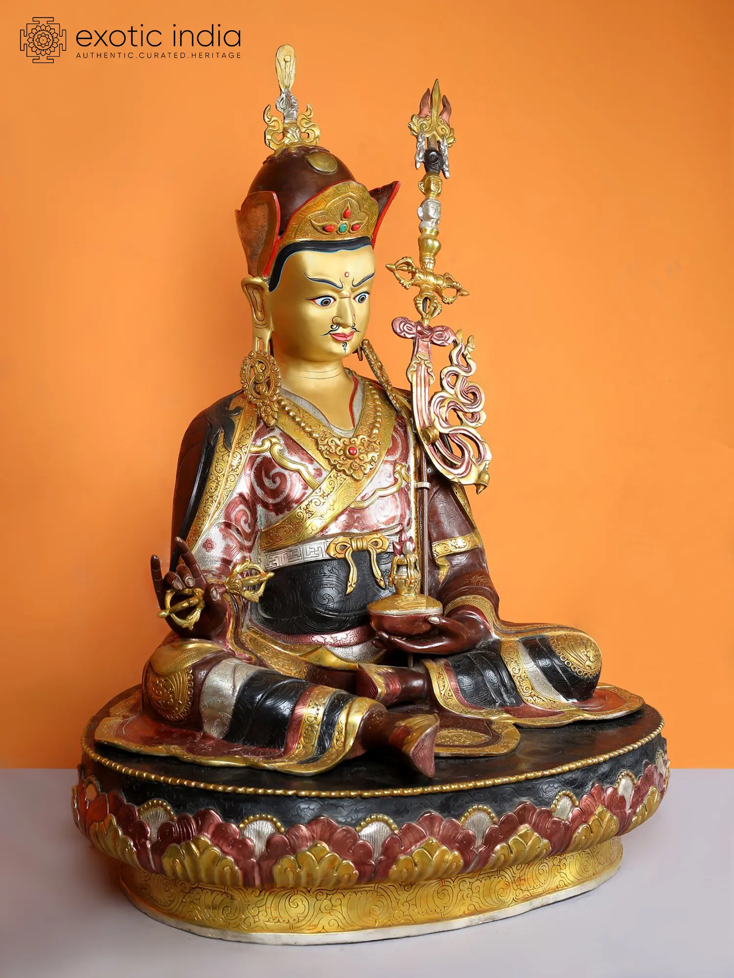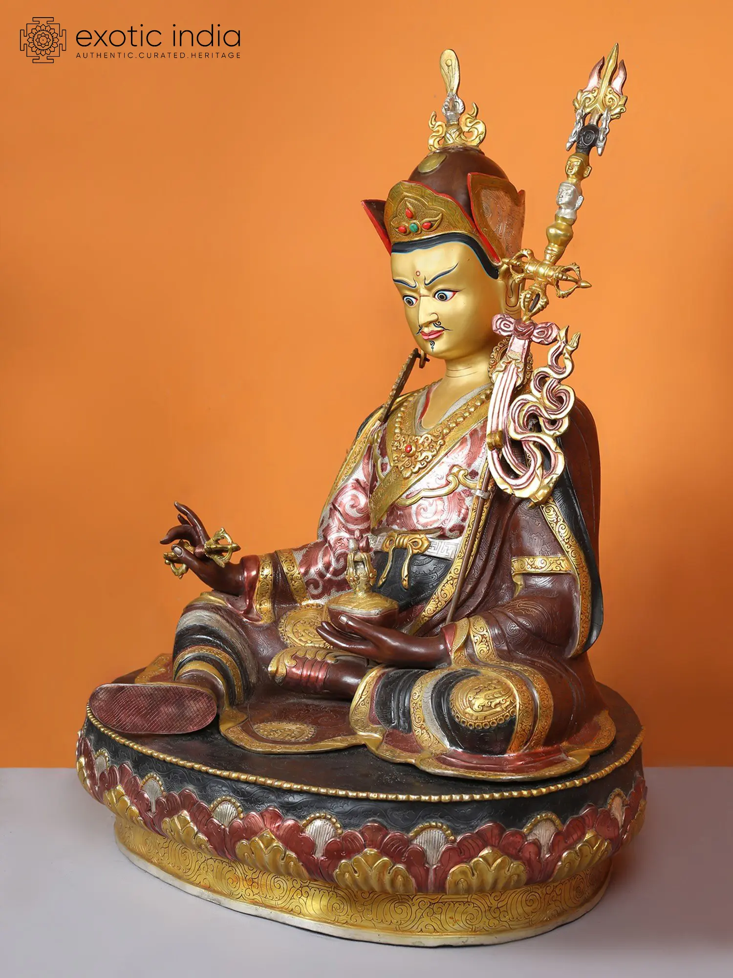 Padmasambhava- the supreme leader of the Nyingmapa or “Order of Elders” is a powerful Buddhist revered figure in Vajrayana Buddhism. The gilded copper Nepalese Padmasambhava statue here presents the great teacher in the attire of a wandering monk- cap, shoes, robes, and staff, reminding us of the long journeys undertaken by Guru Padmasambhava for reaching Tibet. The realistically drawn eyes of Padmasambhava carry the powerful spiritualism of Buddha, which is also present as the Vajra in his right hand.