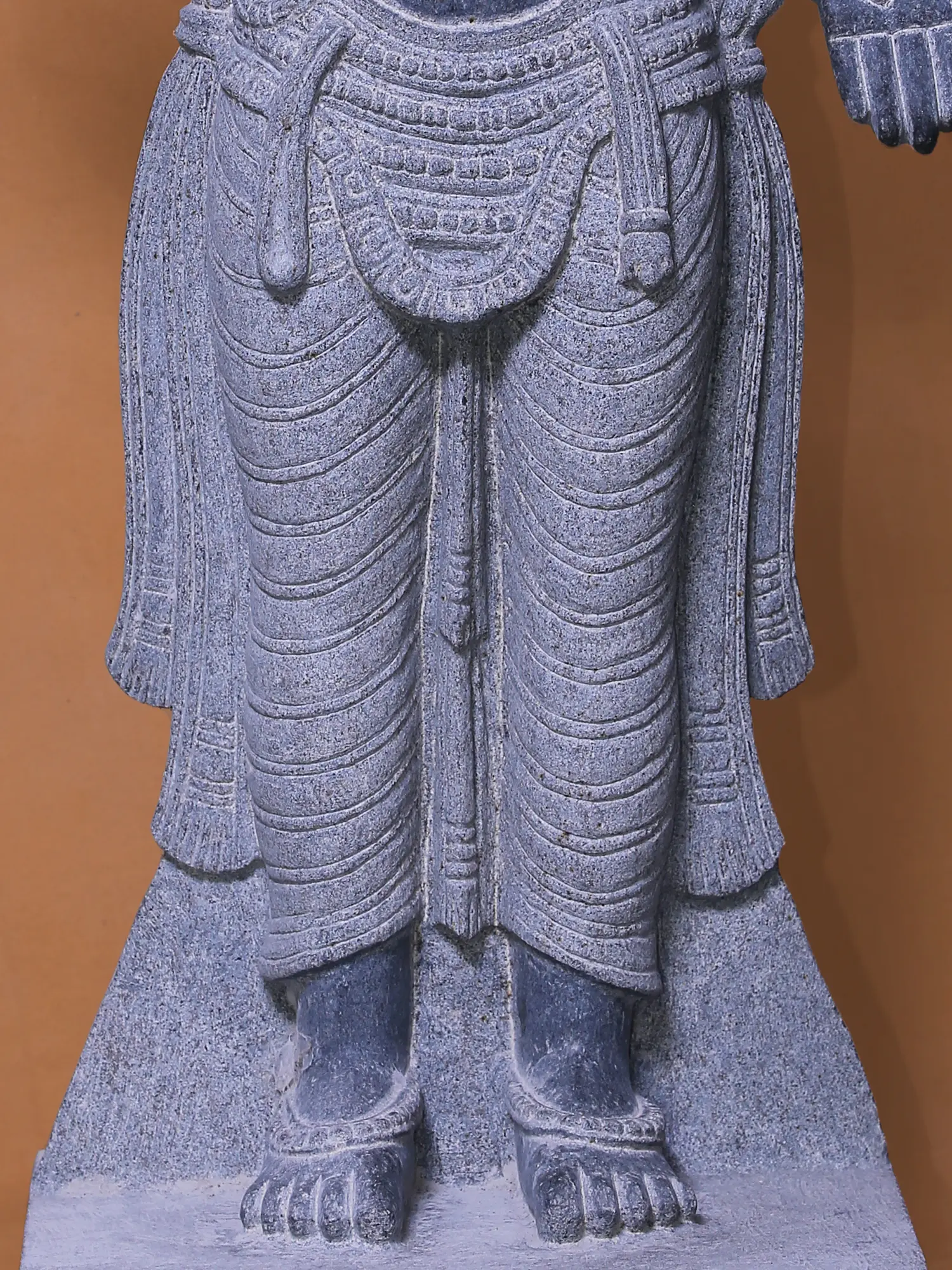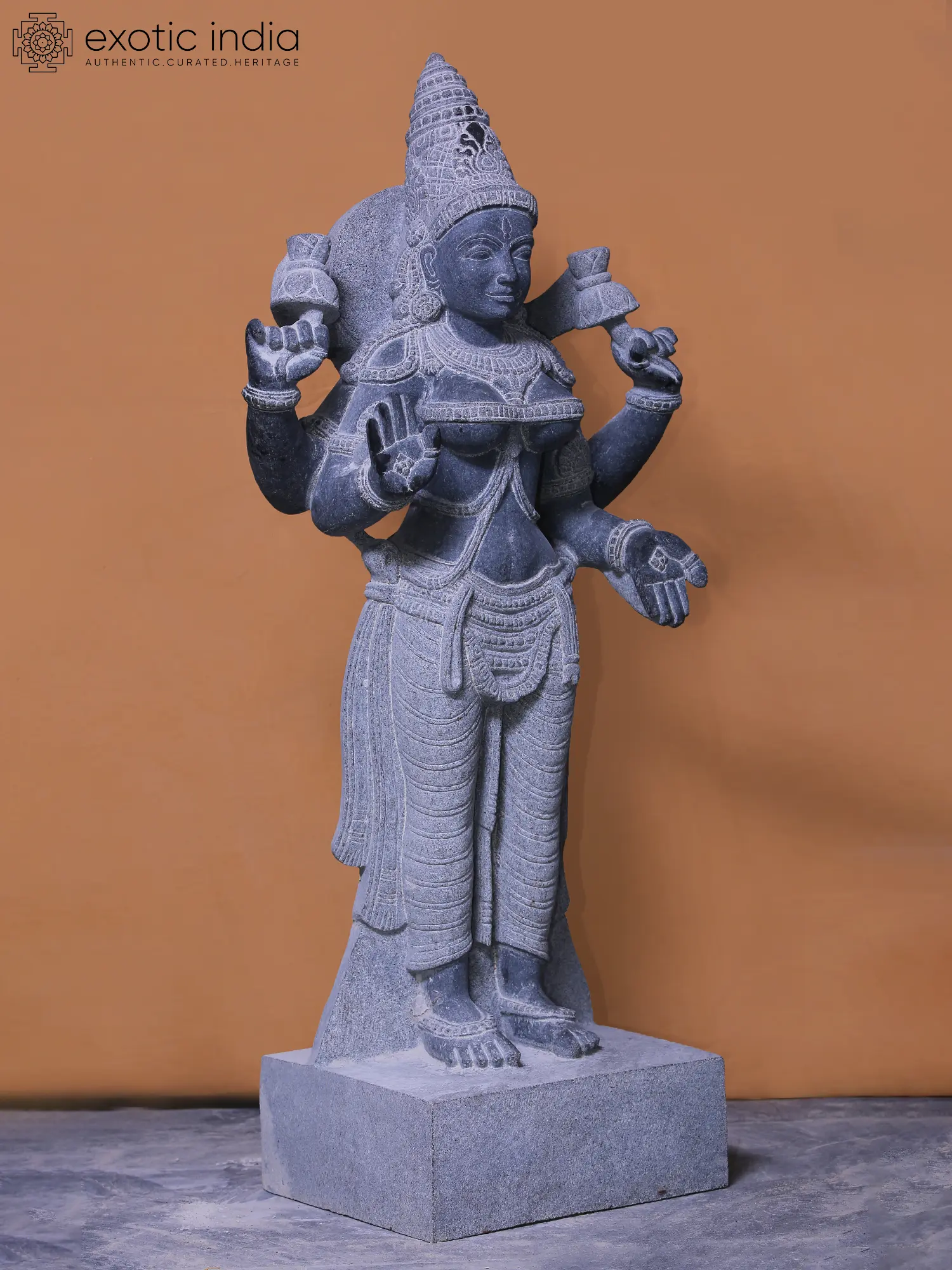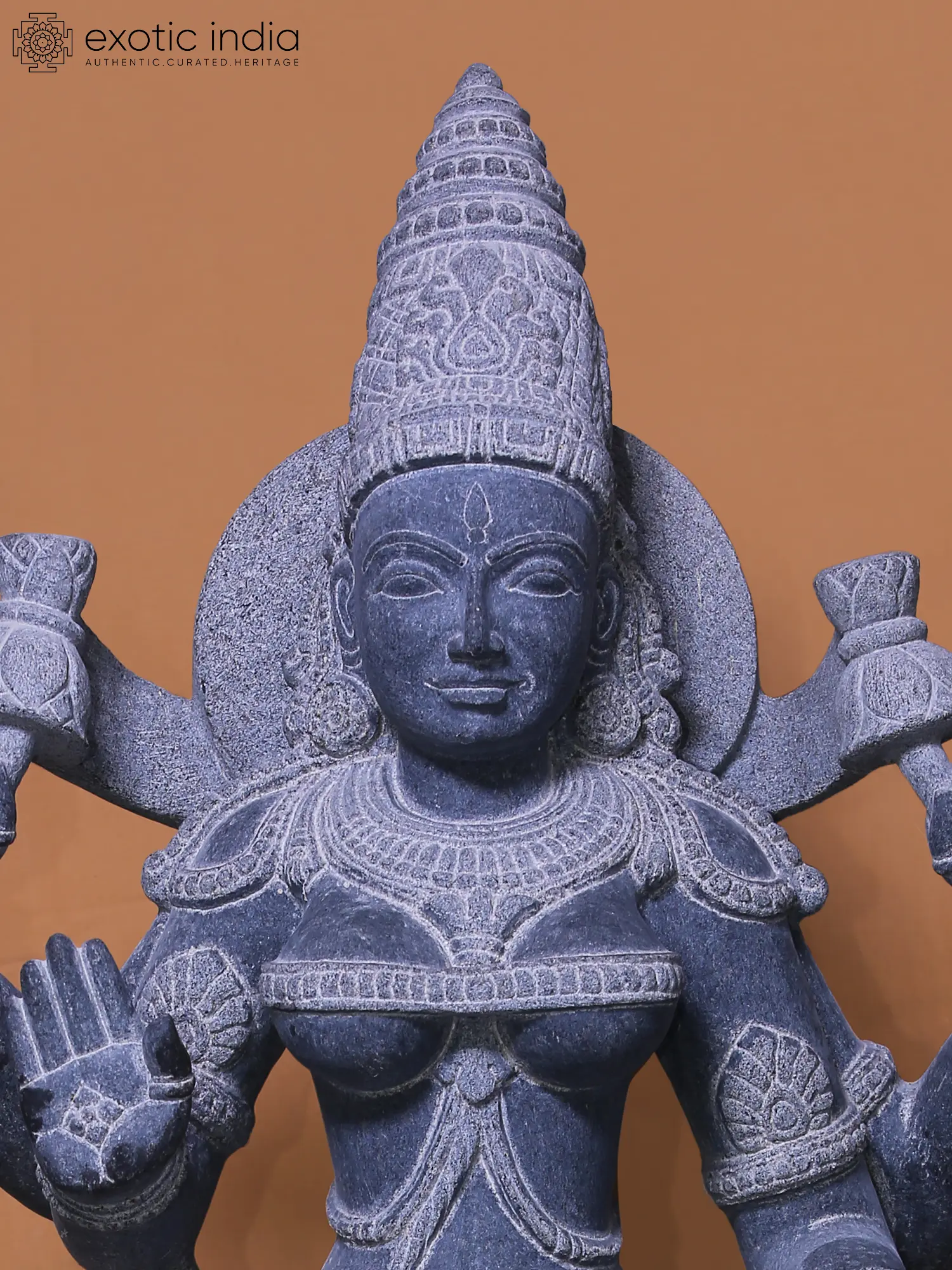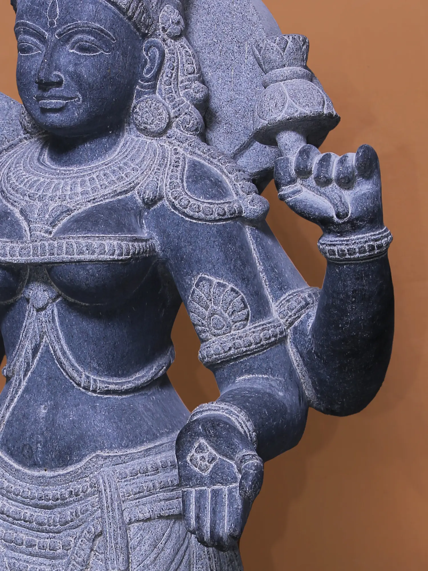 The Shakti or energy of the universal preserver Sri Vishnu, Devi Lakshmi in this beautiful 3-feet granite statue represents the stability of wealth, luxury, and fulfillment desired by the devotees.