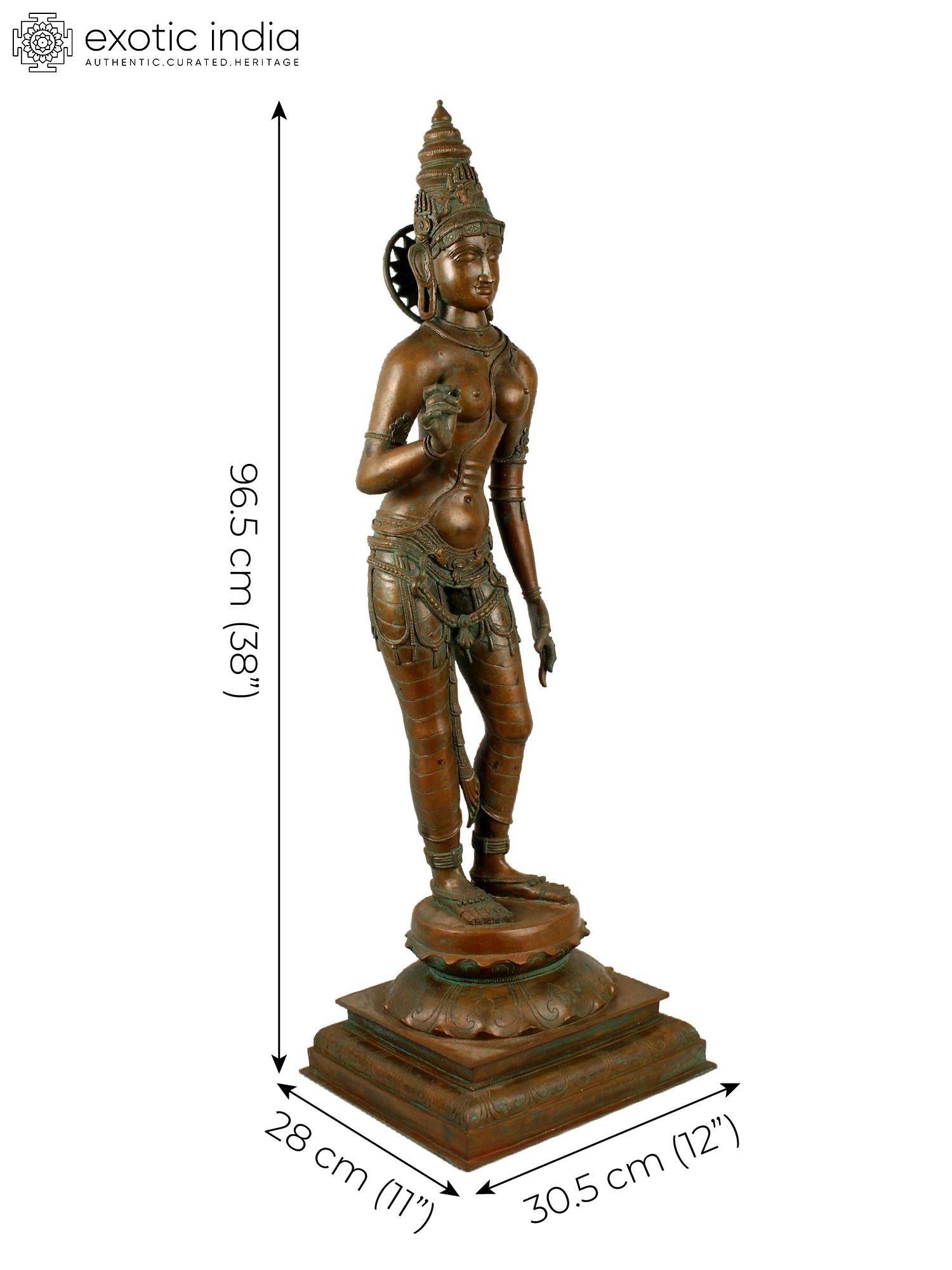 With a style hailing from the quiet town of Swamimalai, this idol of Goddess Sivagami, the companion to Lord Shiva, is intricately cast in bronze using the art of the lost wax. With her divinely sharp features, elongated hands, tapered waist, and her tilted stance, she represents love, fertility and devotion. She is divine energy herself and the queen of parloka (heaven). She is an important part of Shiva’s form as the Nataraja, accompanying him in the dance that marks him as the destroyer of universes. She is the incarnation of Goddess Parvati, often called Uma. She is the daughter of the mountains of Himalaya, emerging after the death of Lord Shiva’s first wife, Sati. Lord Shiva had gone into deep grief after Sati’s death, meditating to cope and refusing to marry anyone else.
