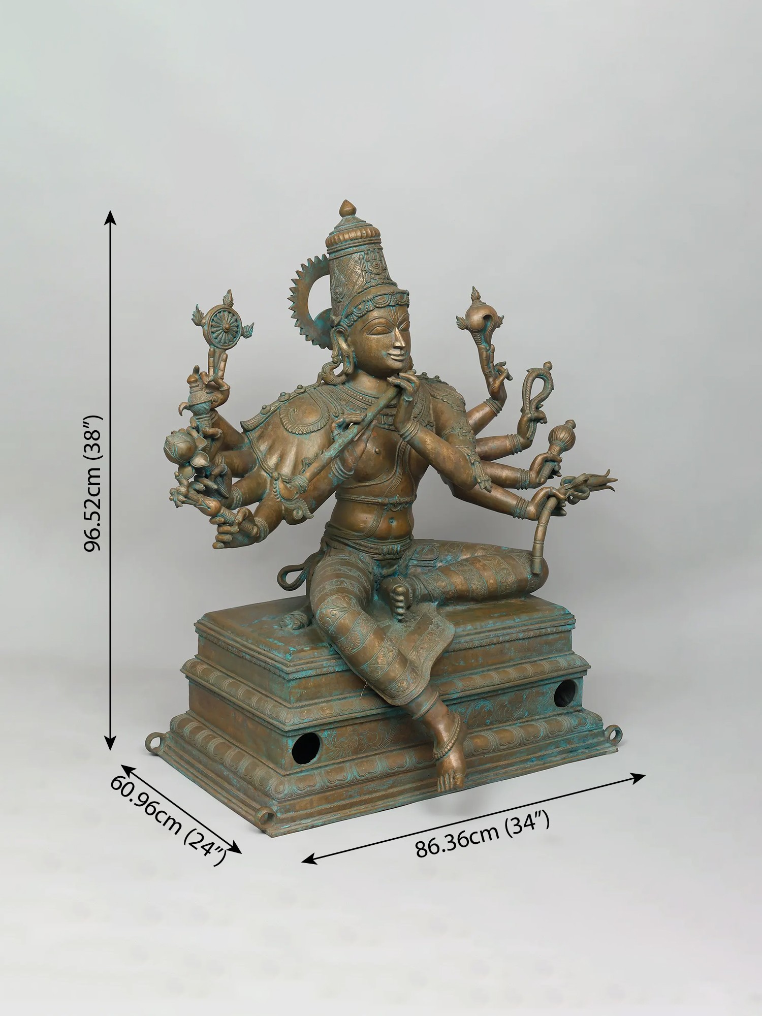 Behold a magnificent representation of Venugopala, a form of Lord Krishna revered for his captivating music and divine grace. This breathtaking bronze sculpture, crafted using the ancient Madhuchista Vidhana (lost-wax) technique, is a testament to the skill and devotion of artisans from Swamimalai, a town renowned for its unbroken lineage of bronze casting. Lord Krishna, in this manifestation, is not merely a deity, but a symbol of irresistible charm, cosmic harmony, and the power of divine love to enchant and transform the universe. His flute, the Venu, is an instrument of enchantment, its melodies said to hold the power to pacify the mind, attract all living beings, and even melt the hearts of the gods. The very posture of Venugopala, seated in relaxed ease, one leg elegantly draped, speaks of the divine presence that is at once approachable and majestic. The serene expression on his face exudes an aura of tranquility and joy, inviting devotees to immerse themselves in the bliss of his divine music. Every curve, every ornament, every symbolic attribute is meticulously rendered, reflecting the profound understanding of iconography and spiritual significance inherent in the Swamimalai tradition.