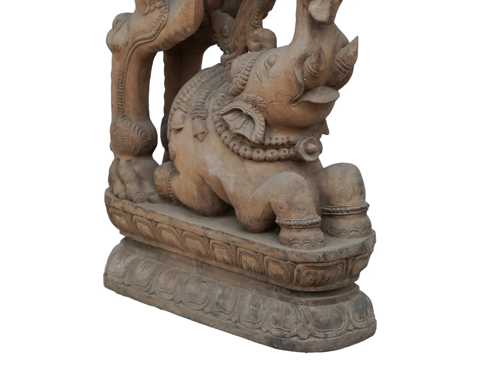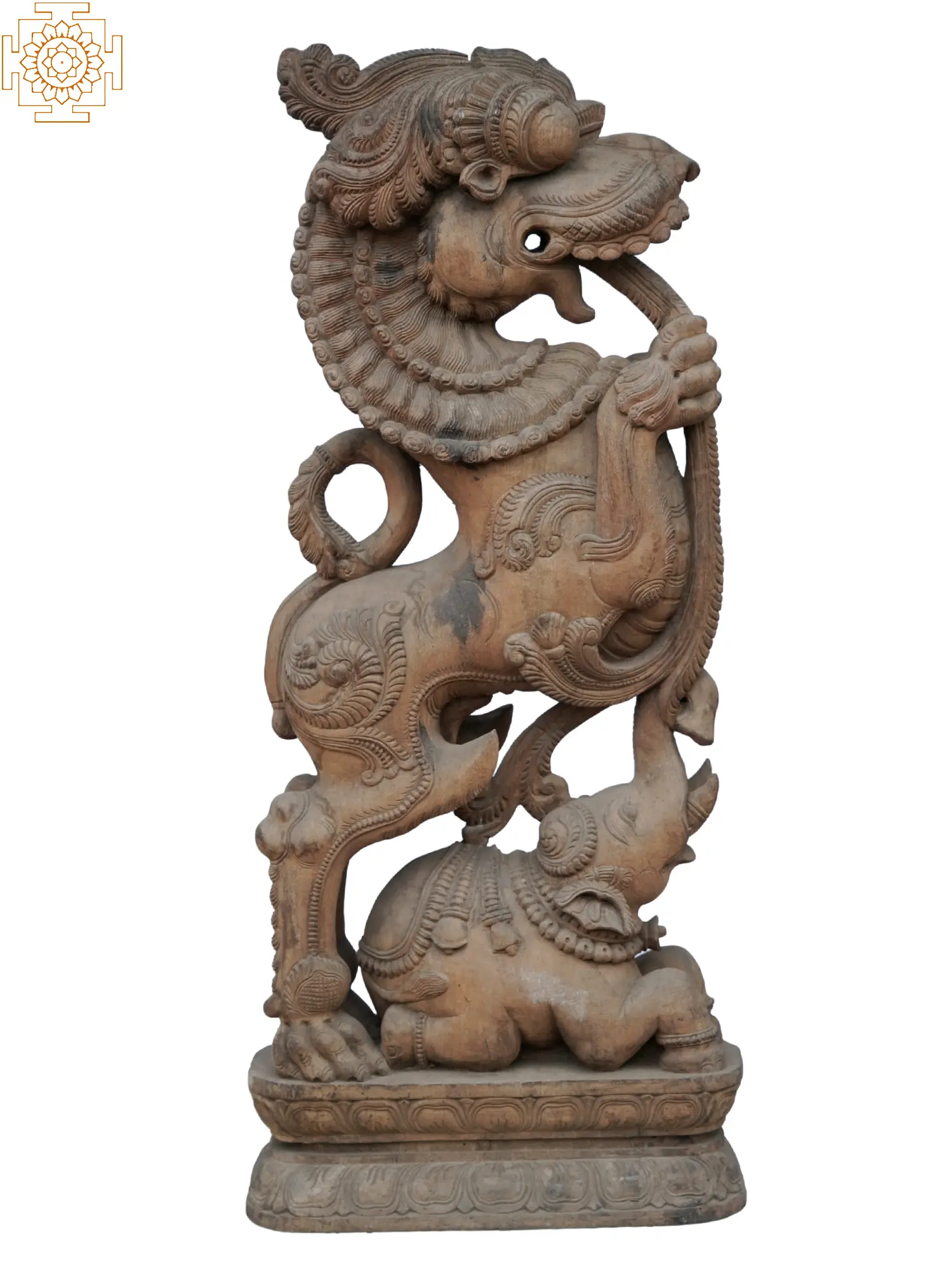 A Yali perched atop an elephant is a magnificent sight, blending two powerful mythical creatures from Hindu and South Indian stories. The Yali, are depicted as a mythical creature with the body of a lion or tiger and the trunk of an elephant, symbolizing strength, courage, and protection. Mounted atop the regal elephant, a symbol of wisdom, power, and royalty, the Yali commands attention and awe.