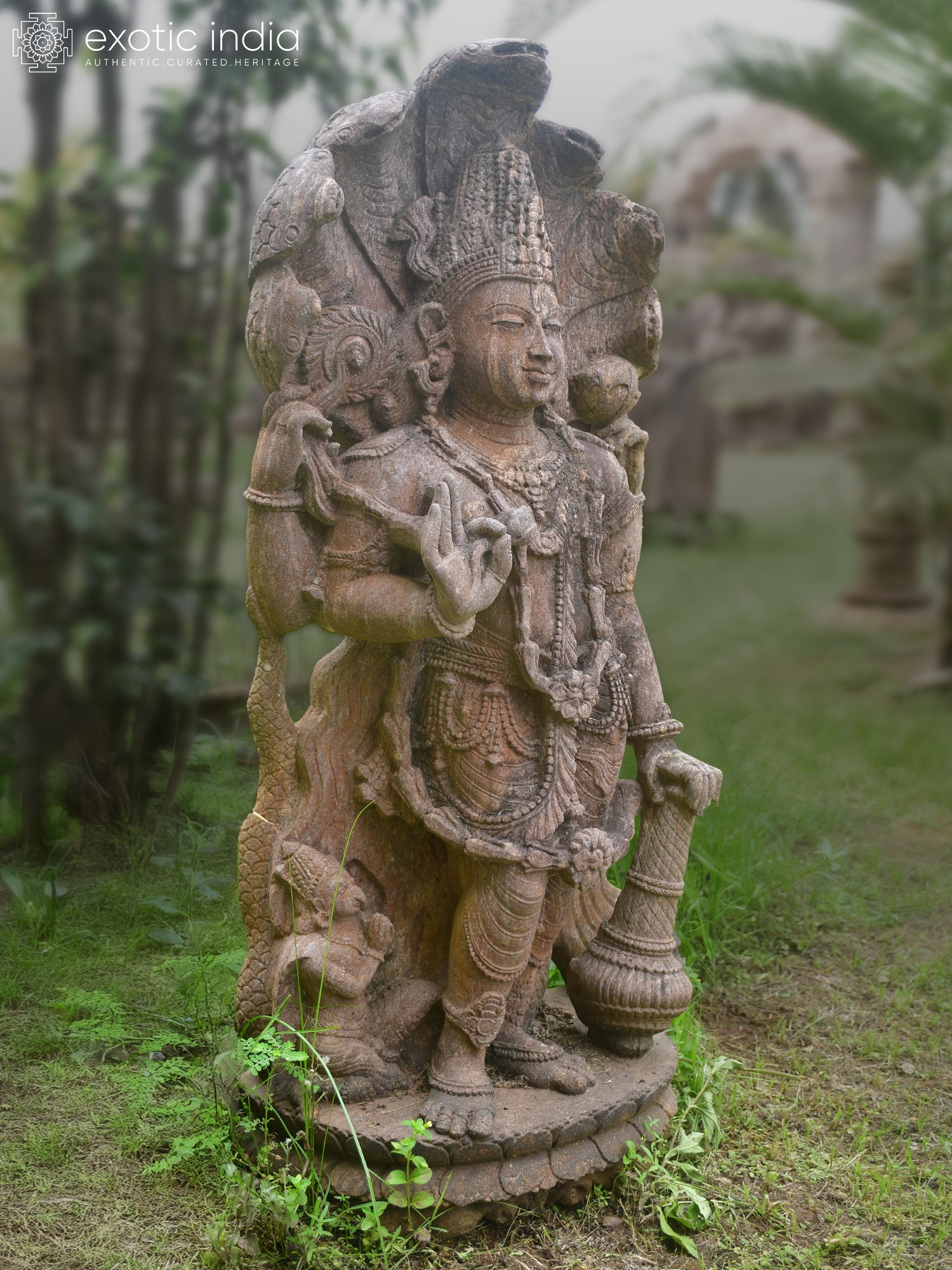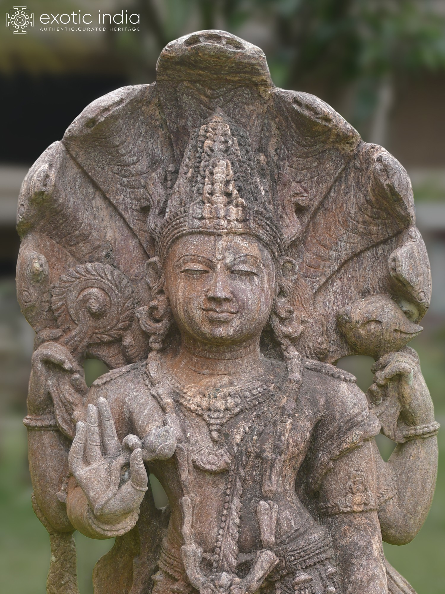 Standing at an impressive 38 inches tall, this commanding presence is adorned with a regal crown and flowing garments, intricately carved to depict the divine majesty of Lord Narayan. The multi-headed serpent arching behind him, a symbol of protection and cosmic energy, adds a dramatic yet protective element. The finely rendered facial expression, a blend of serenity and benevolent watchfulness, draws you into its spiritual narrative.