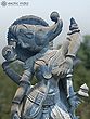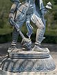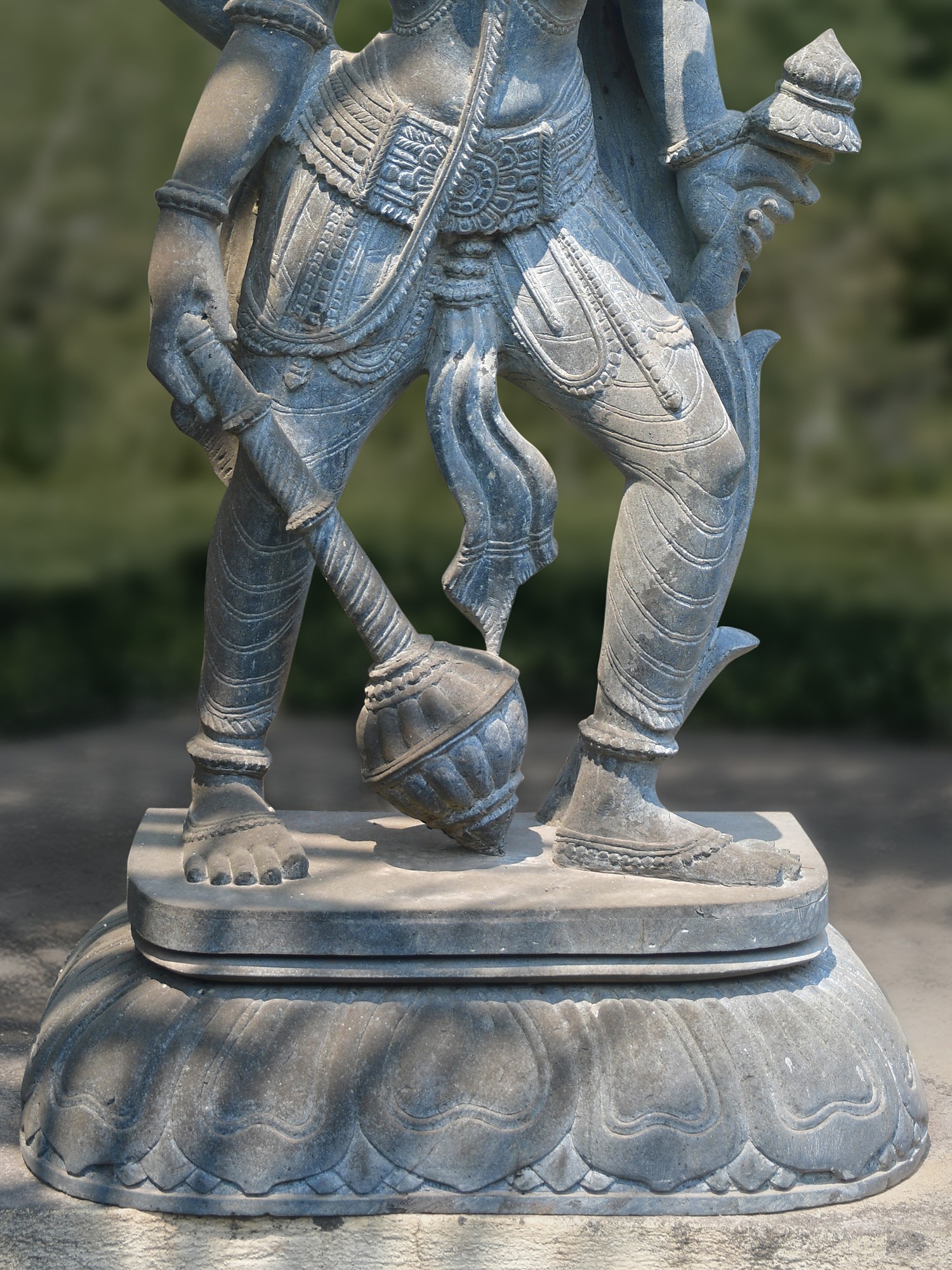 Measuring an impressive 38 inches in height, this piece commands attention with its substantial presence. Its form is rendered with remarkable dynamism, showcasing a flow of movement that belies the solidity of the stone. The intricate detailing of the garments, ornaments, and divine attributes is exquisitely executed, inviting closer contemplation. The textured surface of the Orissa stone lends a timeless patina, enhancing the rich narrative woven into its being.